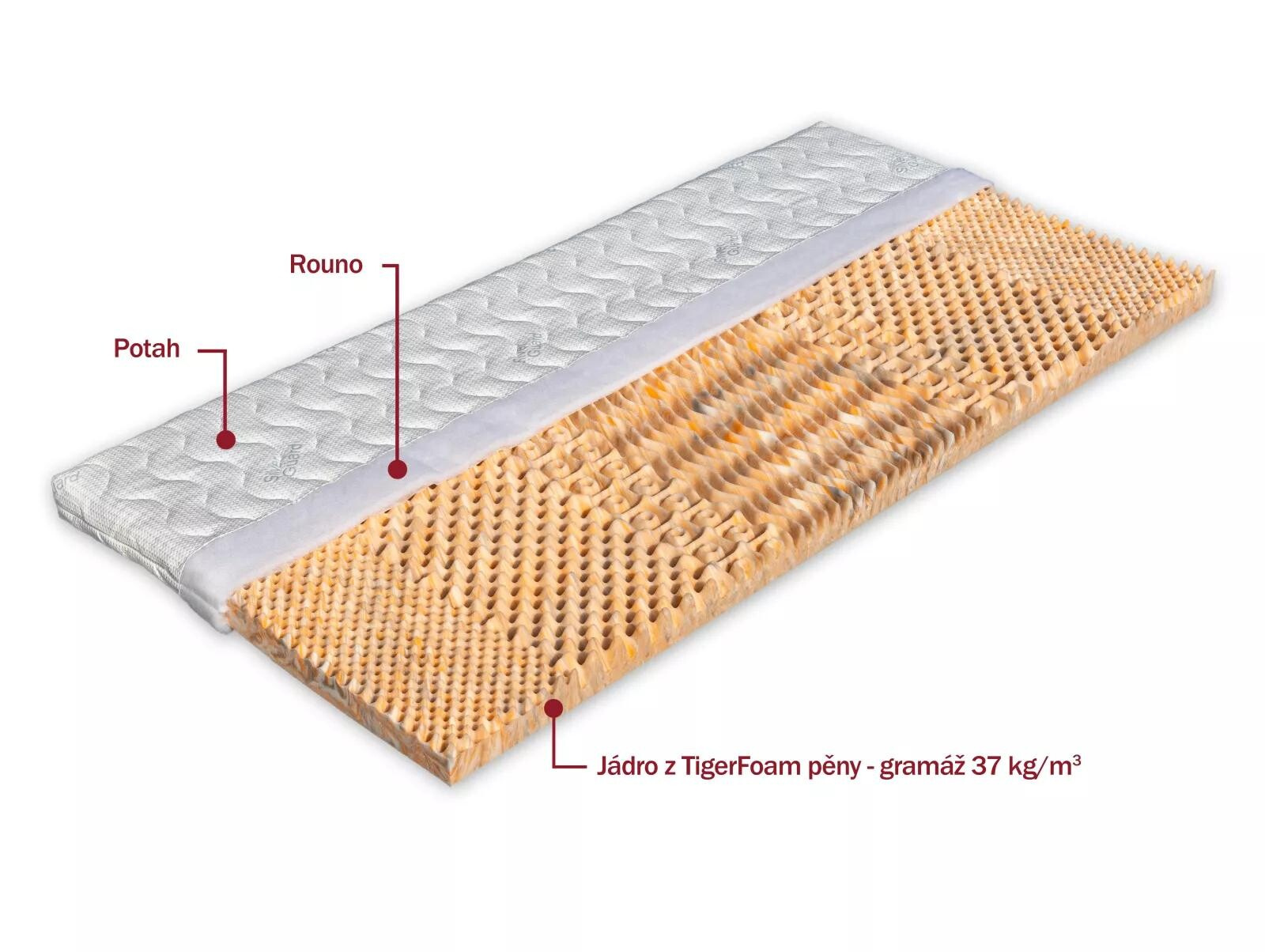 Krycí matrace jsou vhodné pro změkčení nebo zpevnění povrchu stávajícího lůžka. Studená pěna TigerFoam (37 kg/m³) tvarovaná do nopů, vhodná pro vyrovnání plochy.. Dá se položit na jakoukoliv běžnou matraci, zvyšuje komfort lůžka, má vyrovnávací a ochrannou funkci, která prodlouží životnost matrace. Krycí matrace je opatřena snímatelným potahem pratelným na 60 °C. Potah se dá rozdělit na dvě části. Podložka je opatřena gumovou pruženkou, která slouží k přichycení ke stávající matraci.Antibakteriální pěna (32 kg/m³), rovné provedení, vhodná pro zpevnění. V objednávce prosím uveďte Vámi vybraný potah. Celková výška krycí matrace cca 7 cm.
