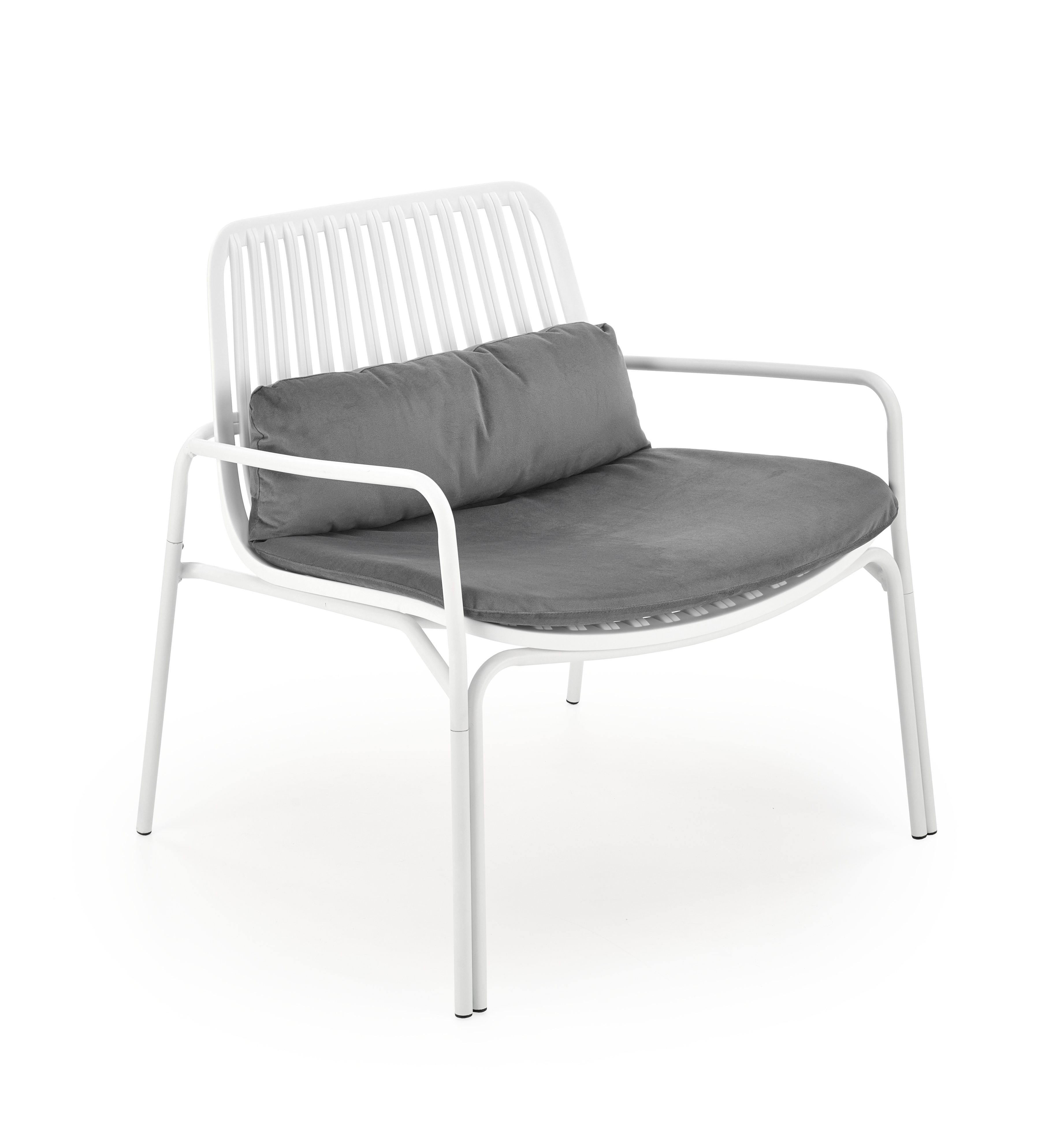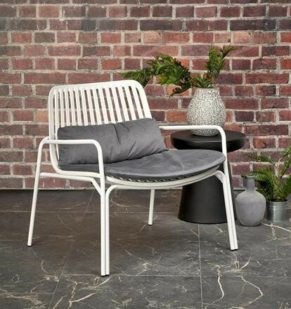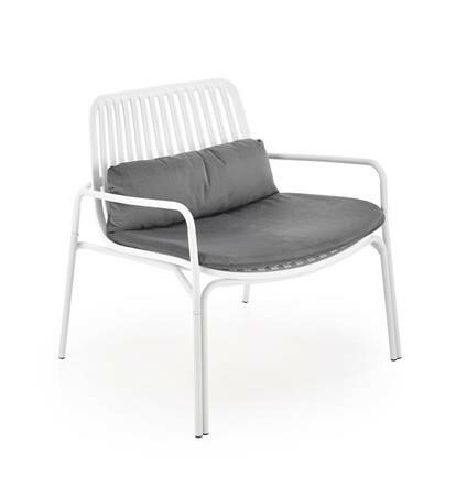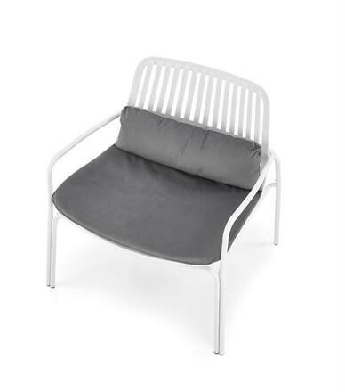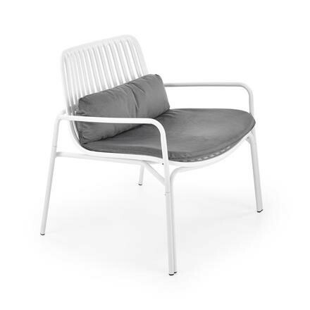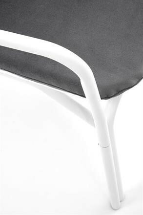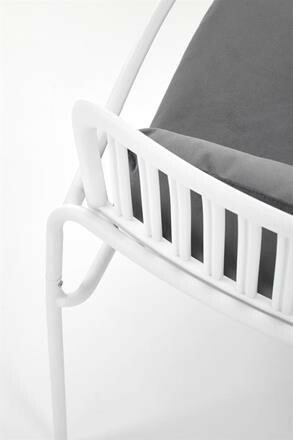 Kovová konstrukce židle Melby nese sedák z plastu , obojí v bílém provedení. Pro pohodlí poslouží nejen područky, ale také snímatelný podsedák potažený sametově hebkou látkou v šedé barvě. Maximální nostnost 100 kg. Zboží dodáváme v demontu.