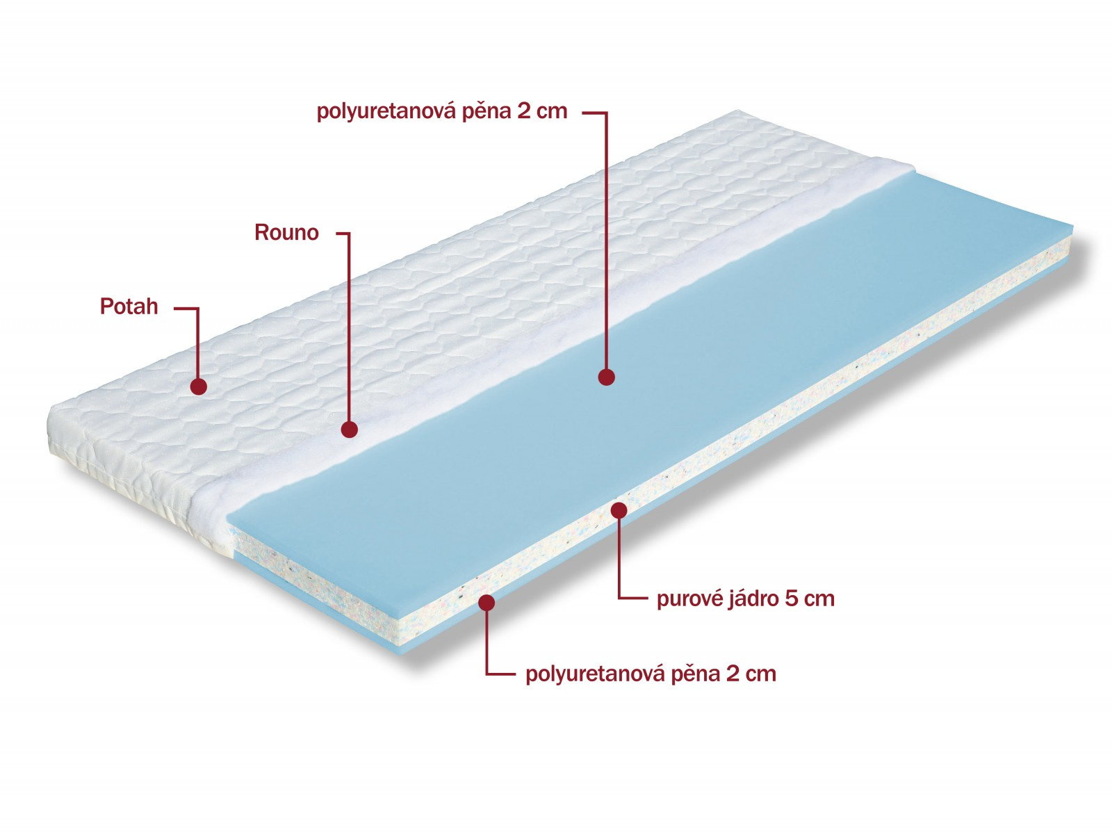 Matrace zpevněná PUR jádrem, které zaručuje vyšší pevnost matrace, dobrou pružnost a ohebnost. Je vhodná jak k příležitostnému, tak i ke stálému spaní. Možnost výběru rozměru i do dětské postýlky. Matrace lze vybrat v potahu SILVERGUARD,MEDICOTT,LYOCELL - antibakteriální potah nebo LEVANDULE - s relaxačními účinky. V objednávce prosím uveďte Vámi vybraný potah. Výška matrace 10 cm. Matrace do hmotnosti 90 kg.