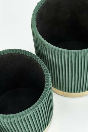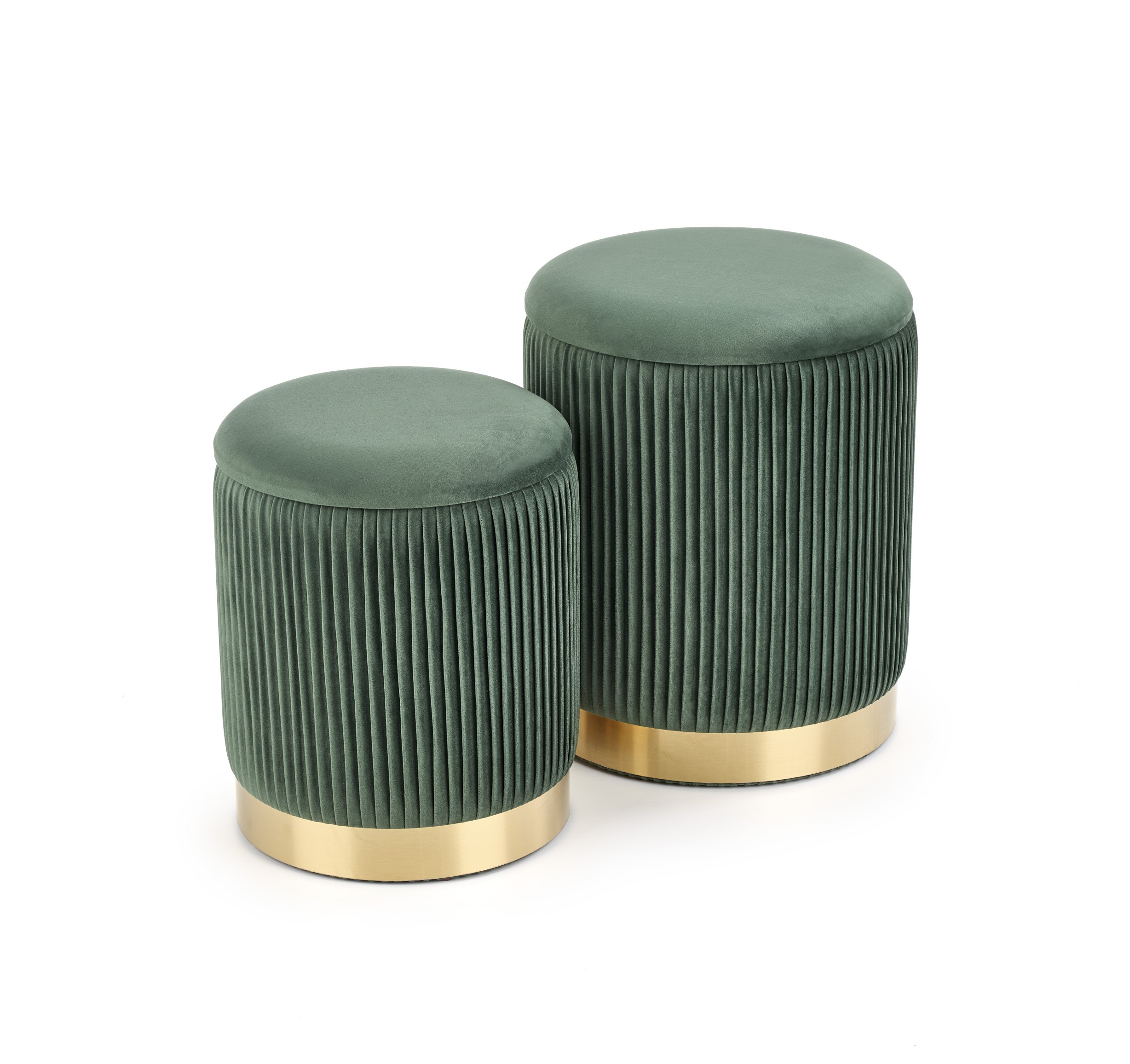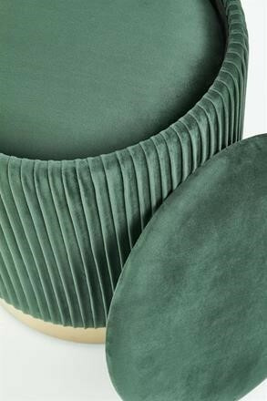 Taburety Monty jsou potaženy sametovou látkou v tmavě zelené barvě. V dolní části je efektní zlatý lem z chromované oceli. Nabízí nejen funkci sezení, ale současně i možnost úložného prostoru odklopením vrchní části. Uložit zde můžete různé drobnosti, ale i menší taburet do většího. Maximální nosnost jednoho taburetu činí 100 kg. Zboží dodáváme v demontu.