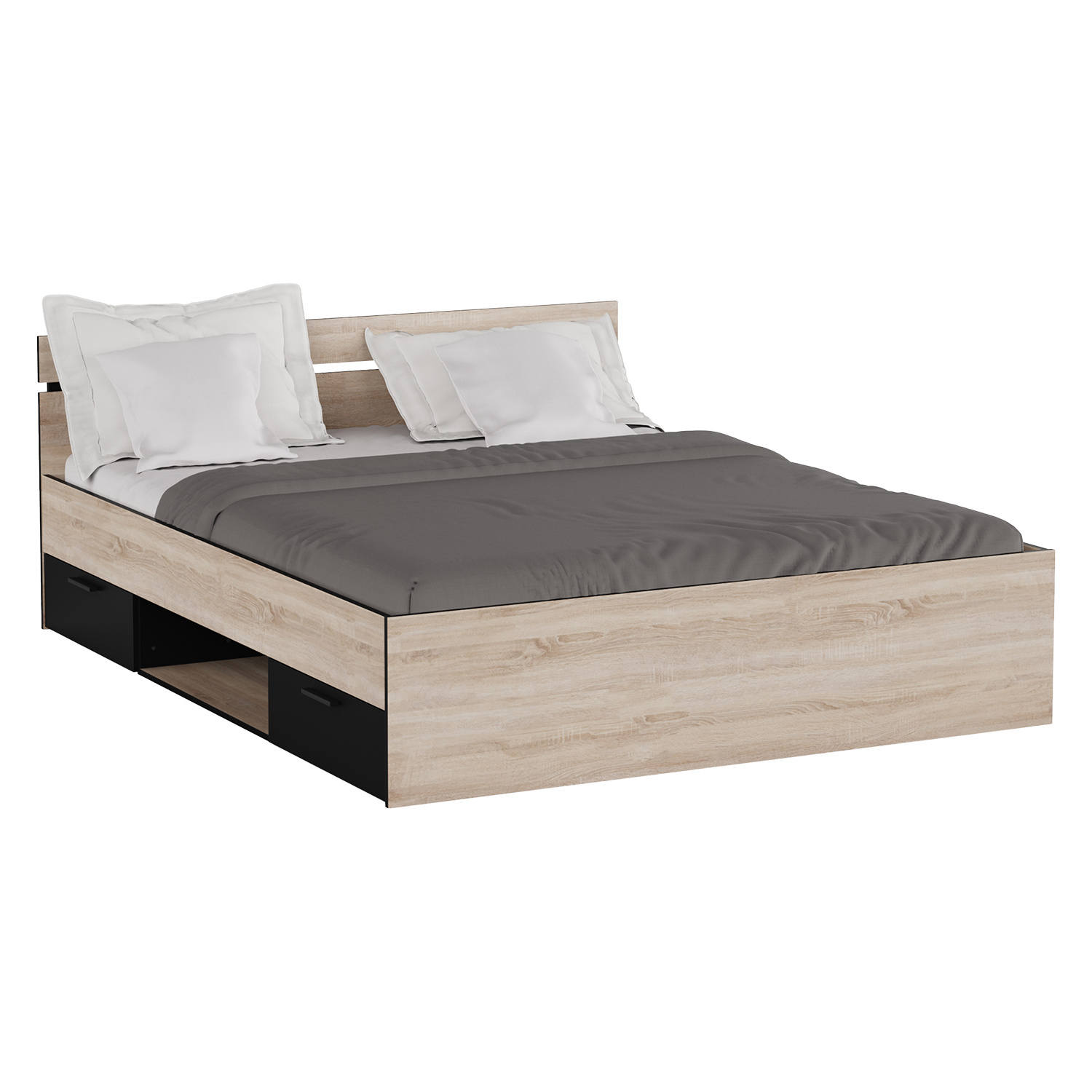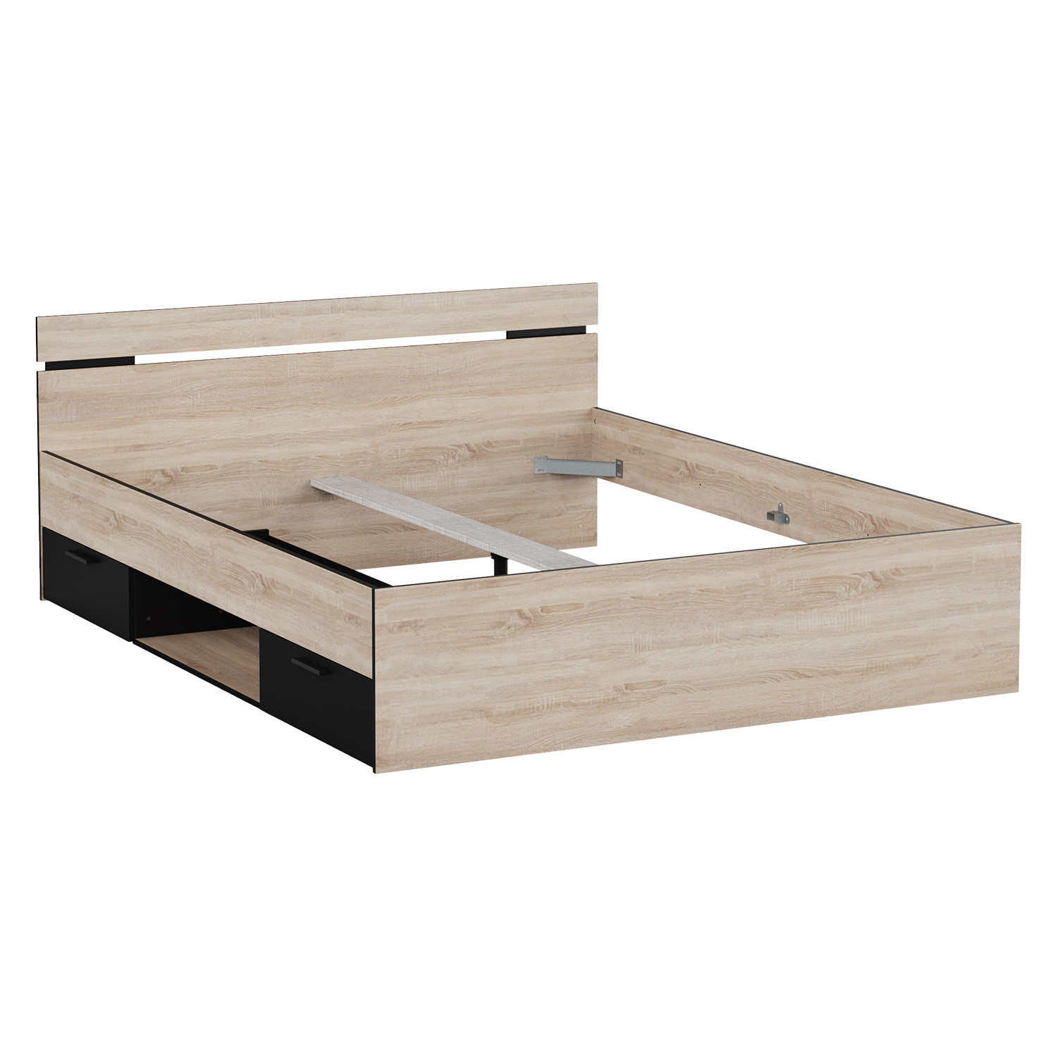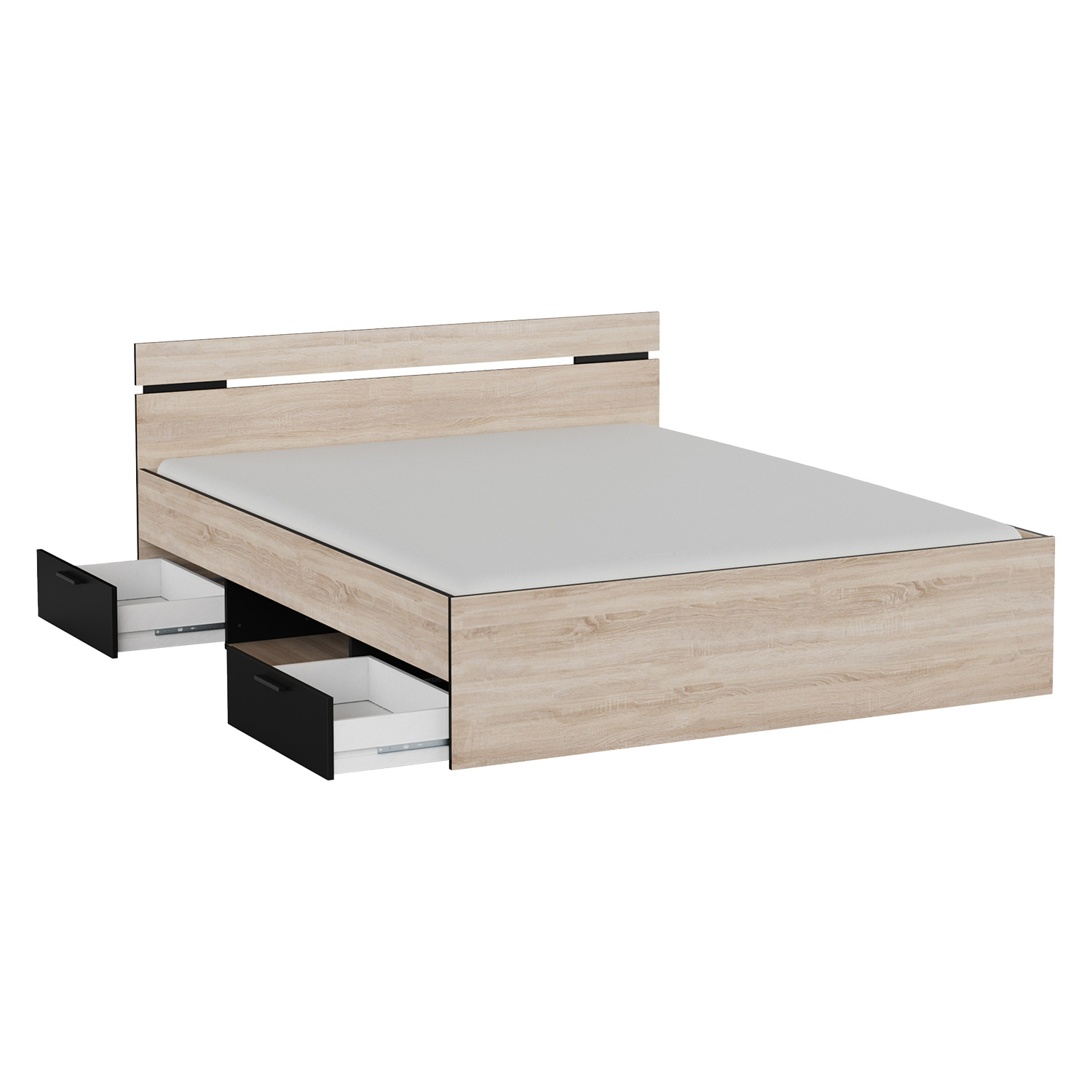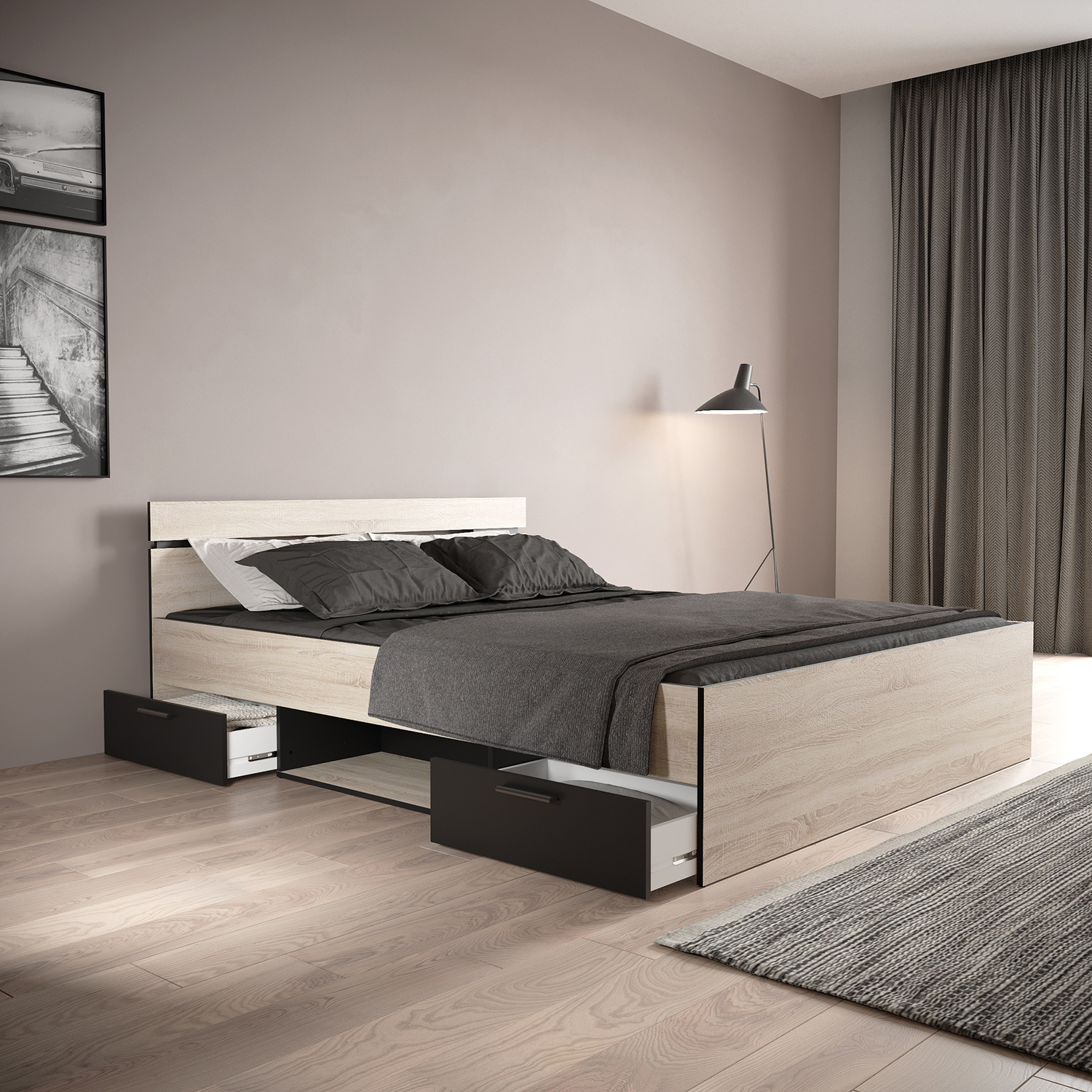 barevné provedení dub Sonoma / černá 2 úložné zásuvky s kovovými pojezdy, rozměr zásuvky (š/v/h) 56 × 11 × 33 cm rozměr niky (š/v/h) 80 × 20 × 36 cm, zásuvky a nika jsou v ceně matrace a rošt nejsou v ceně, doporučený rozměr matrace 160 × 200 cm nebo 2 kusy 80 × 200 cm k posteli je nutno použít samonosný rošt v rámu 160 × 200 cm (7155 nebo 7866 nebo 429596) doporučená maximální nosnost 2 × 100 kg