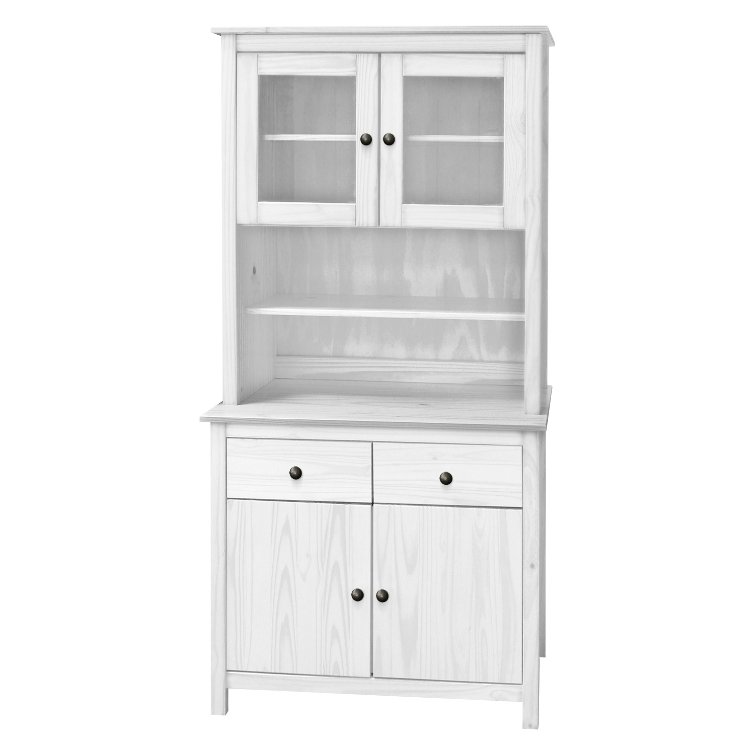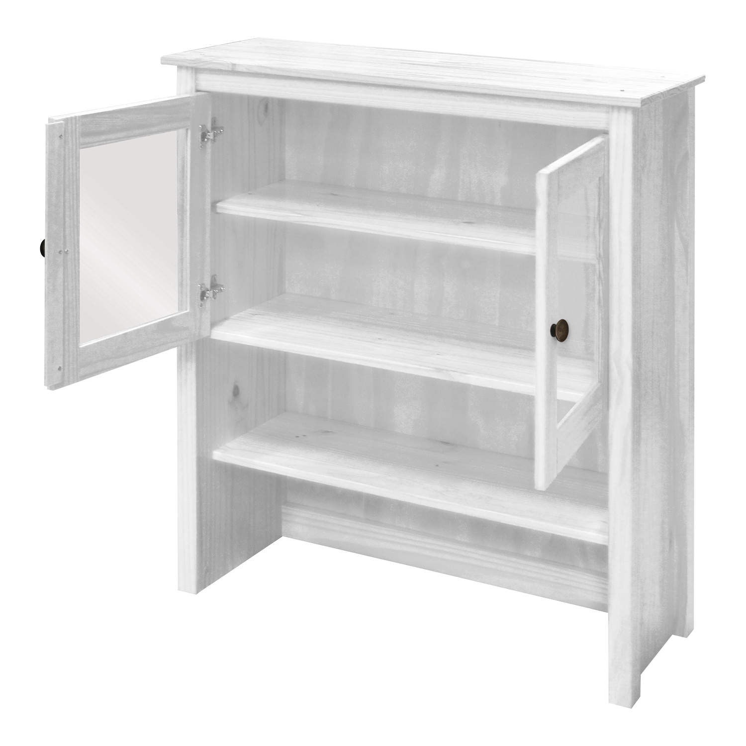 materiál masiv borovice, barevné provedení bílý lak kovové úchytky 2 prosklené dveře, 1 police nástavec příborníku 8095BK