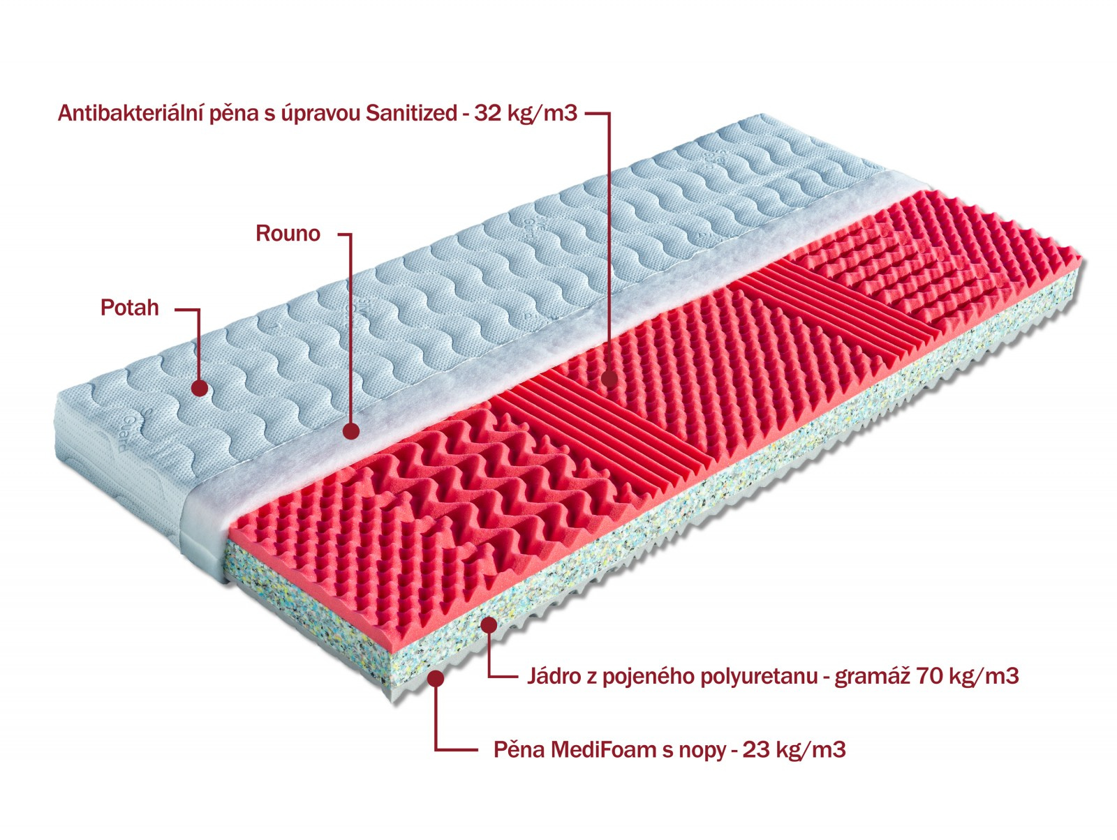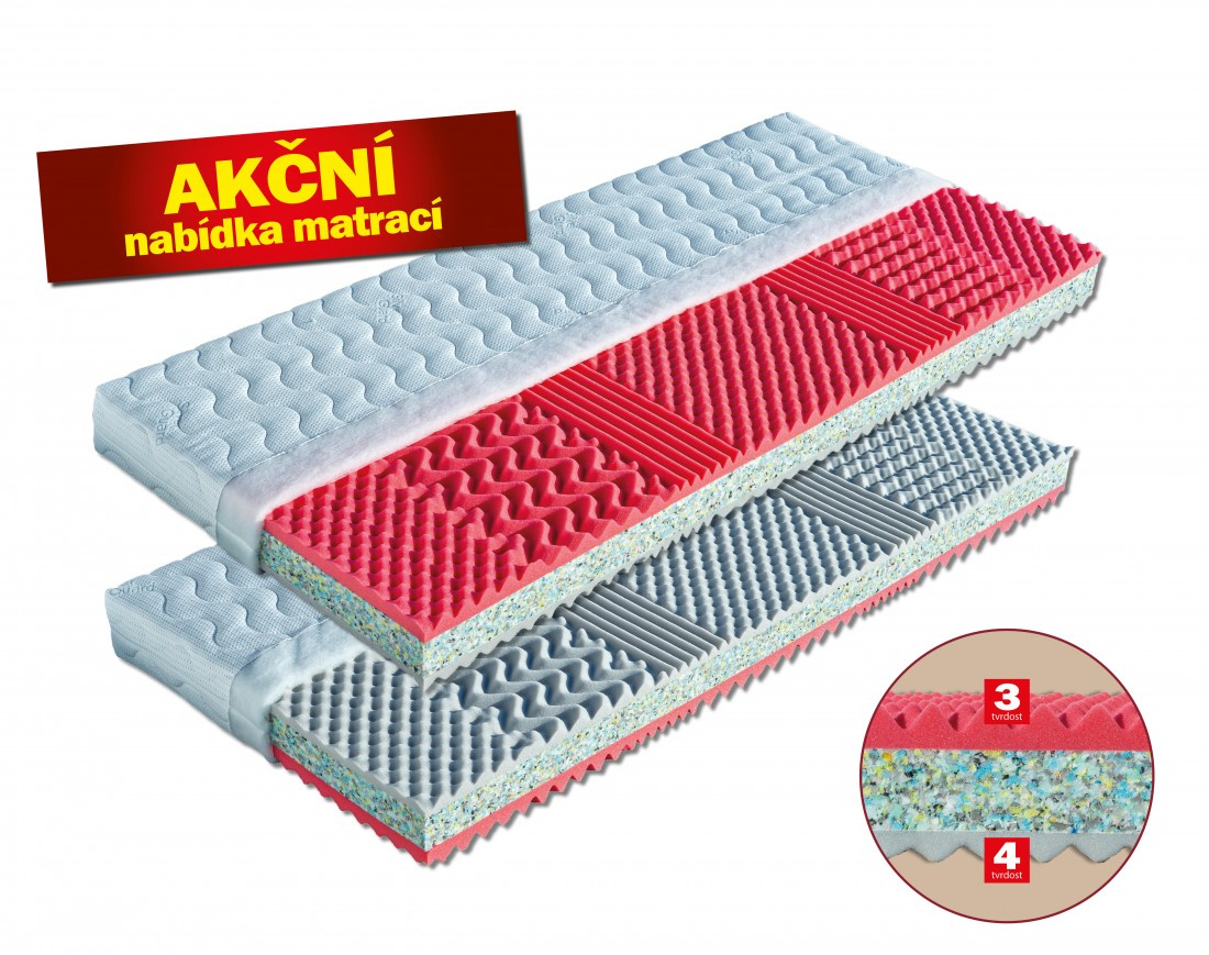 Sendvičová matrace s jádrem z pojeného polyuretanu ve výšce 7 cm. Vrchní stranu matrace tvoří elastická antibakteriální pěna s úpravou Sanitized, která poskytuje trvalou a účinnou ochranu proti bakteriím, roztočům a plísním. Je tvarovaná do nopů, má tvrdost č. 3. Druhou stranu tvoří tvrdší pěna MediFoam tvarovaná do masážních nopů, tvrdost č. 4. Matrace je určená pro širokou škálu uživatelů a je vhodná na všechny typy roštů. Matrace lze vybrat v potahu ÚPLET nebo ALOE VERA. V objednávce prosím uveďte Vámi vybraný potah. Výška matrace včetně potahu 16 cm. Matrace do hmotnosti 130 kg.