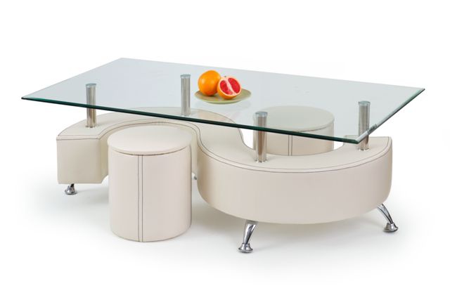 Konferenční stolek s taburetkami je vyrobený ze skla, oceli chromované, PVC v bílé barvě. Zboží je dodáváno v demontu