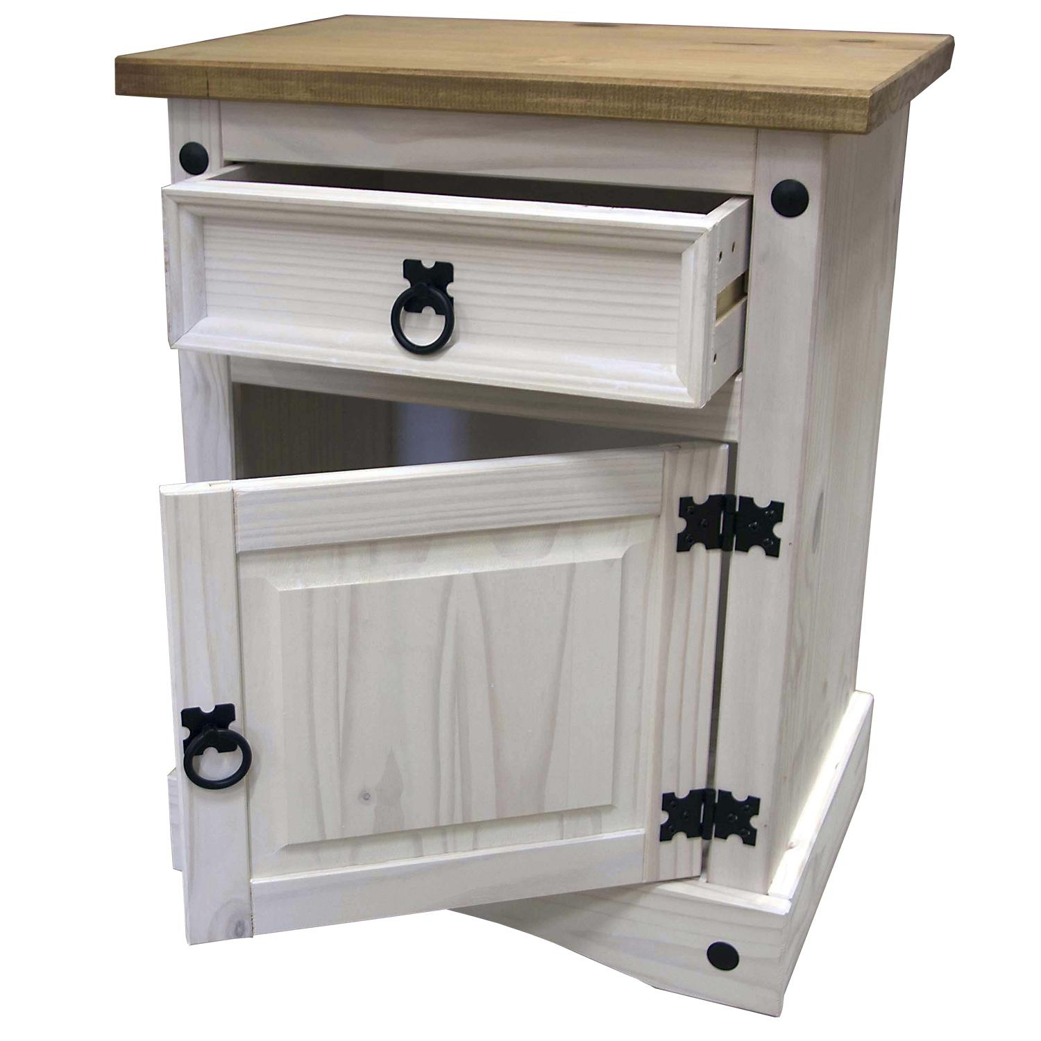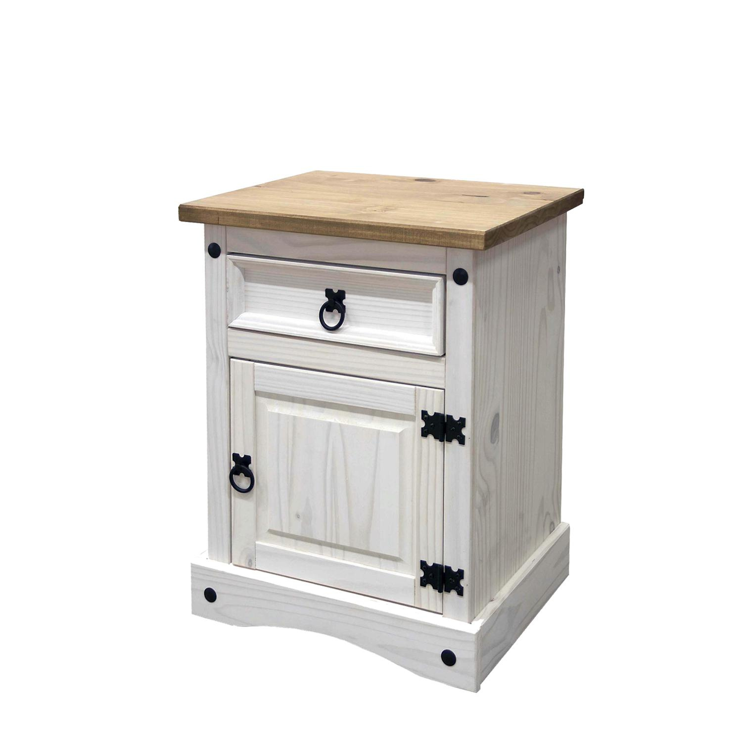 Materiál masiv borovice voskovaná v bílém odstínu, horní deska masiv borovice voskovaná v medovém odstínu, 1 zásuvka, 1 dvířka, hloubka zásuvky 30 cm, kovové ozdobné úchytky, možnost montáže pantů na levou i pravou stranu, součást sestavy Corona bílá. Zboží dodáváme v demontu.