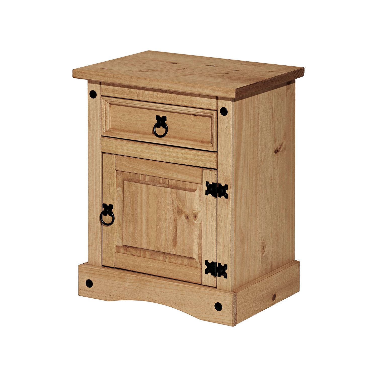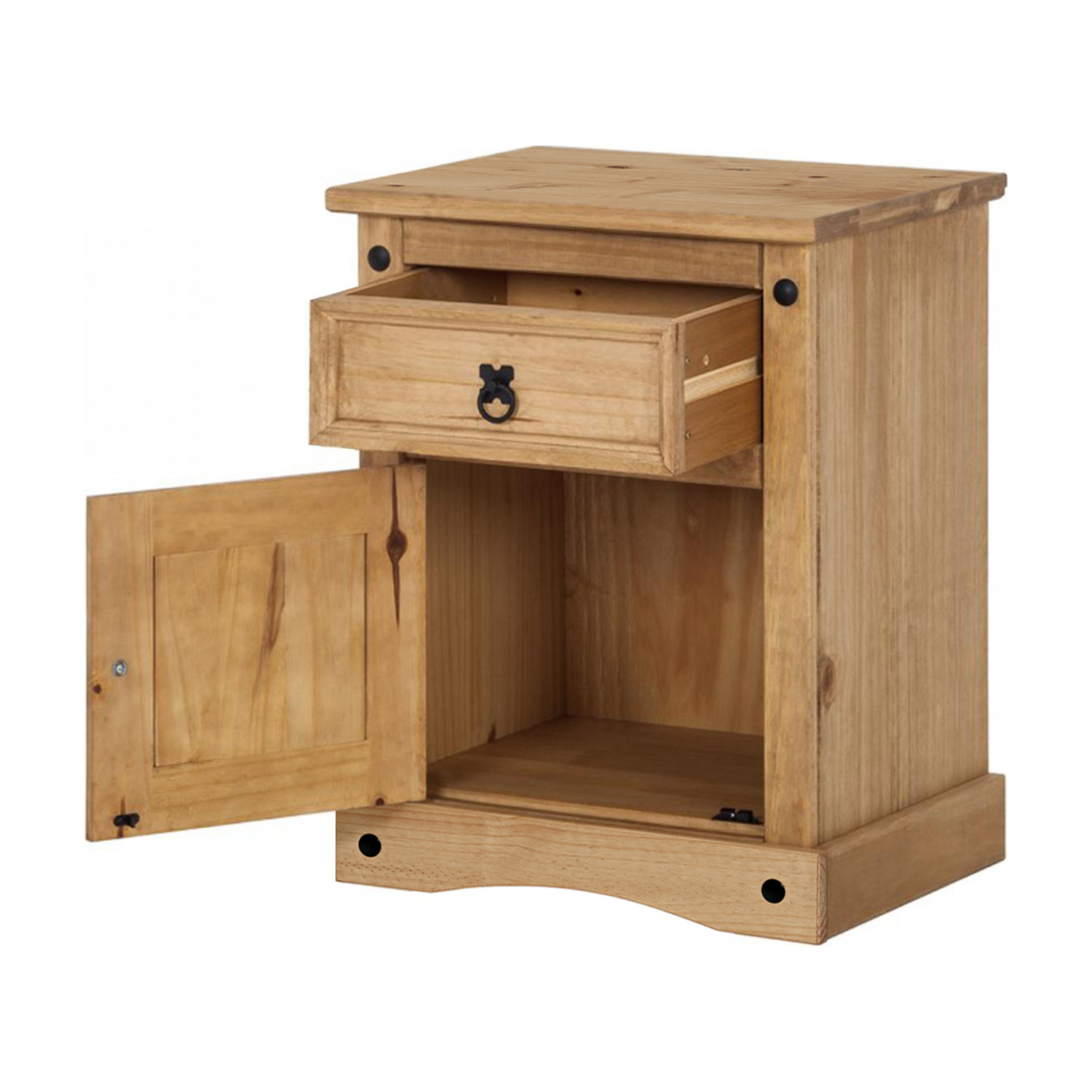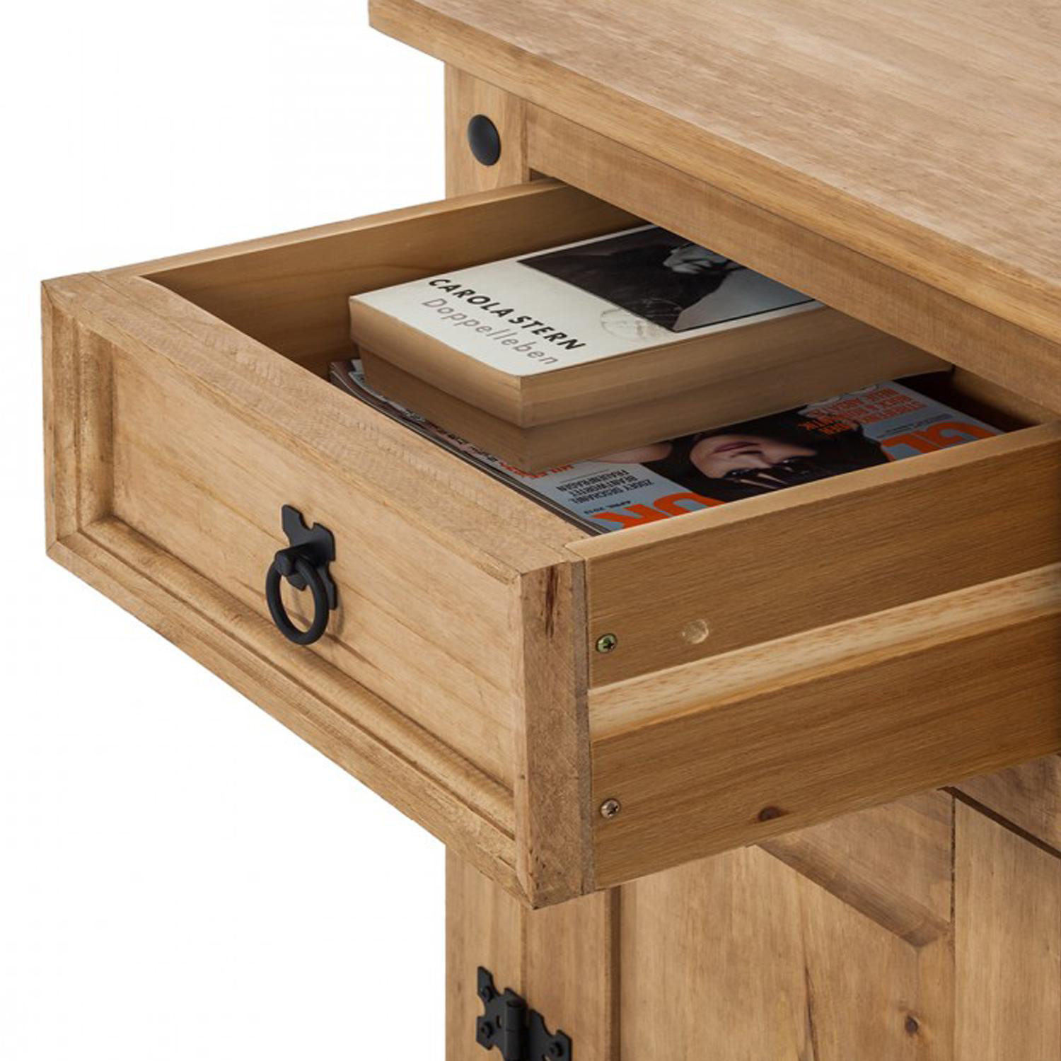 Materiál masiv borovice voskovaná v medovém odstínu, 1 zásuvka, 1 dvířka, hloubka zásuvky 30 cm, kovové ozdobné úchytky, možnost montáže pantů na levou i pravou stranu, součást sestavy Corona. Zboží je dodáváno v demontu.