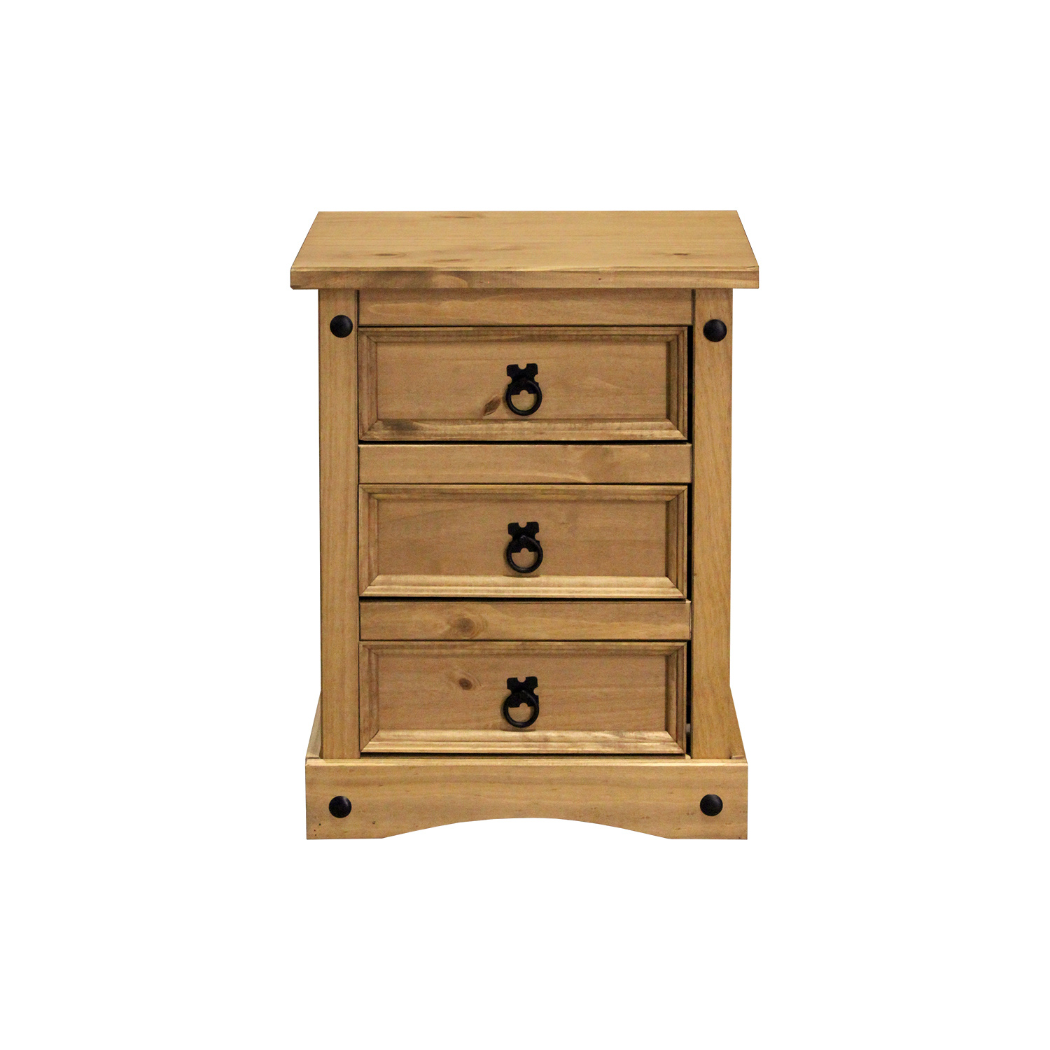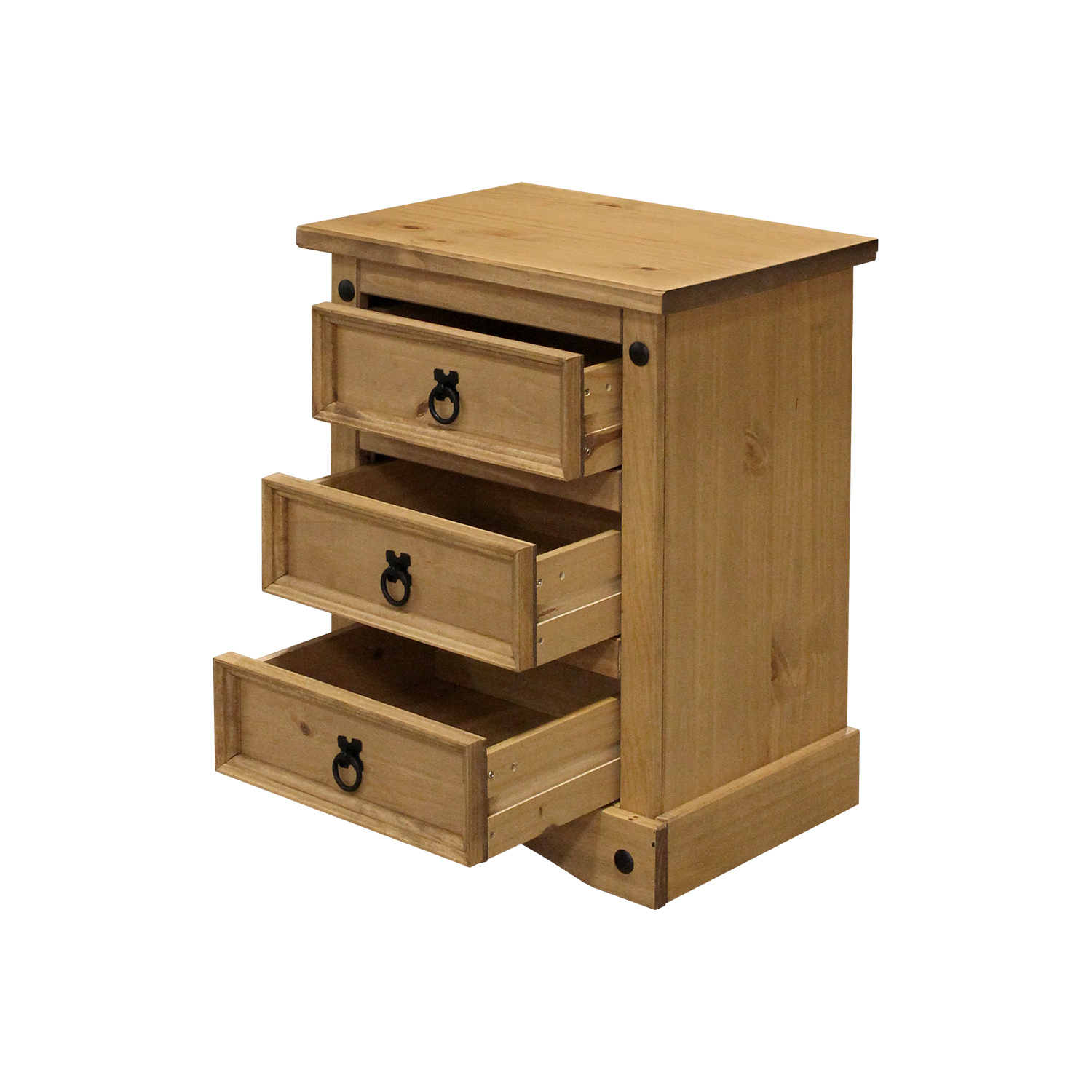 Noční stole je vyroben z materiálu masiv borovice voskovaná v medovém odstínu. Stolek má 3 zásuvky, kovové ozdobné úchytky. Zboží dodáváme v demontu.