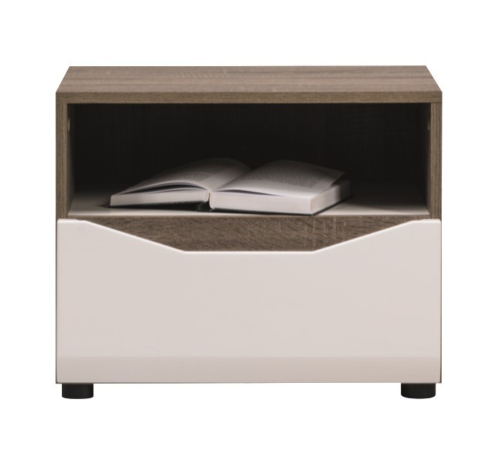 Noční stolek má korpus vyroben z vysoce kvalitní laminované dřevotřískové desky v barvě dub sonoma lanýž. Dvířka a čela šuplíků jsou z MDF potažené PVC fólií v bílém lesku s frézovanými hranami. Tichý systém zavírání dveří a šuplíků ve standardu. Zboží je dodáváno v demontu.