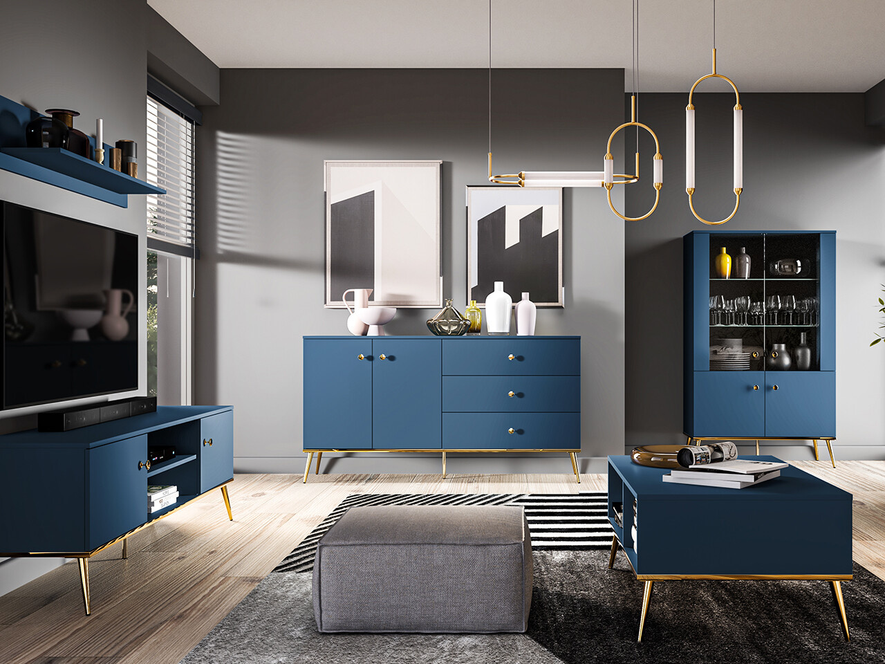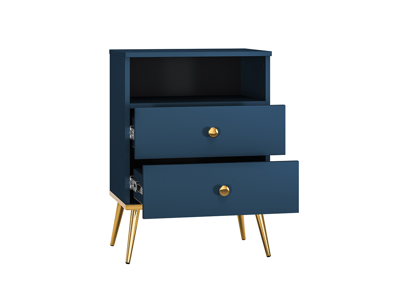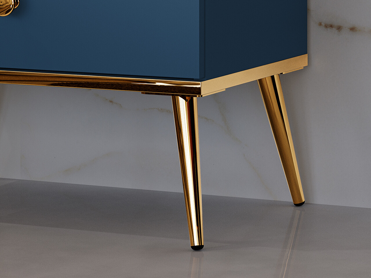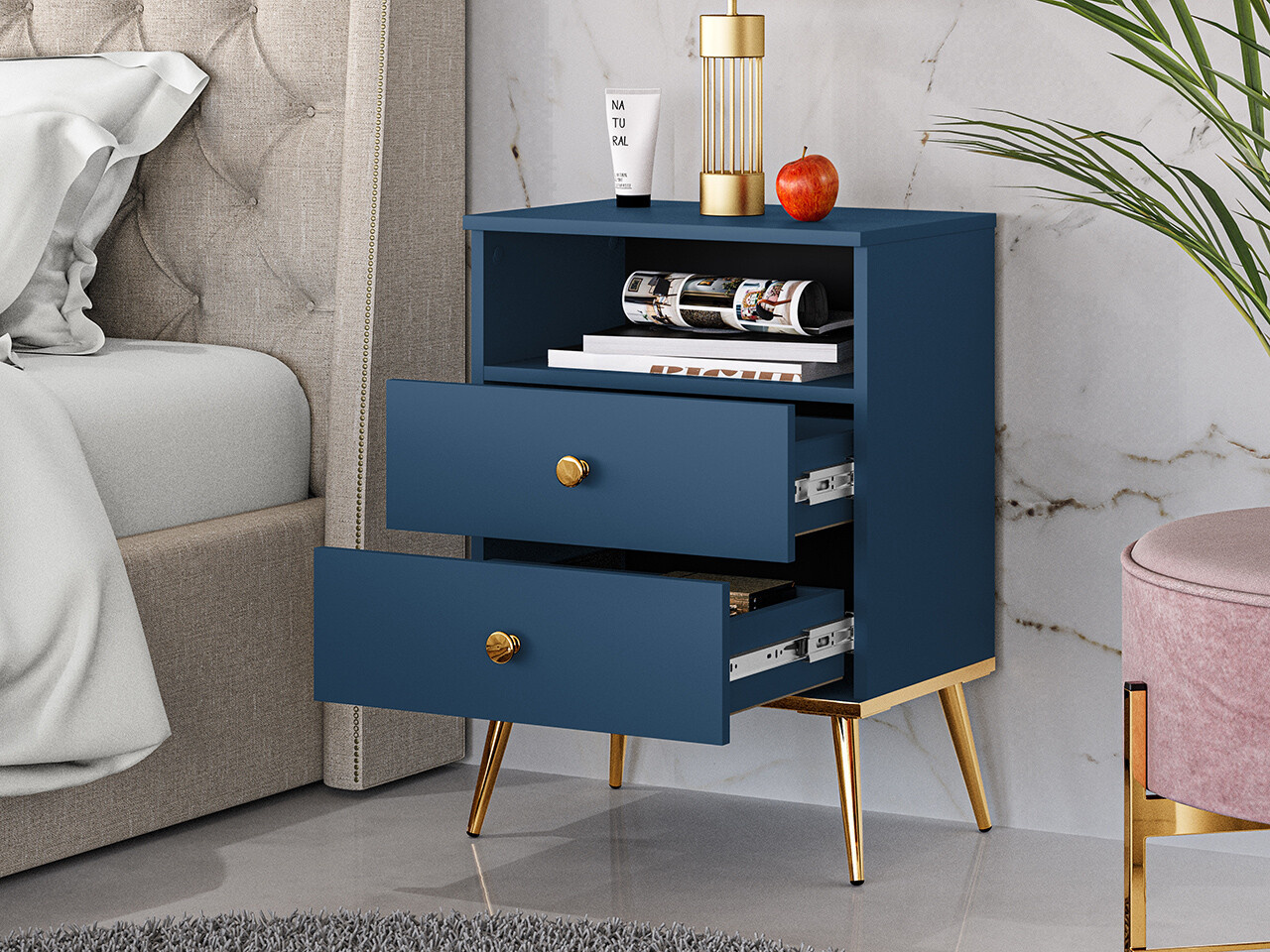 Noční stolek Marine je vyrobena z vysoce kvalitní laminované dřevotřískové desky s ABS hranou v modré barvě. Stabilní vysoké nohy v kovovém provedení a dvojitě pozinkovaná rukojeť jsou ve zlatém provedení. Zboží dodáváme v demontu.