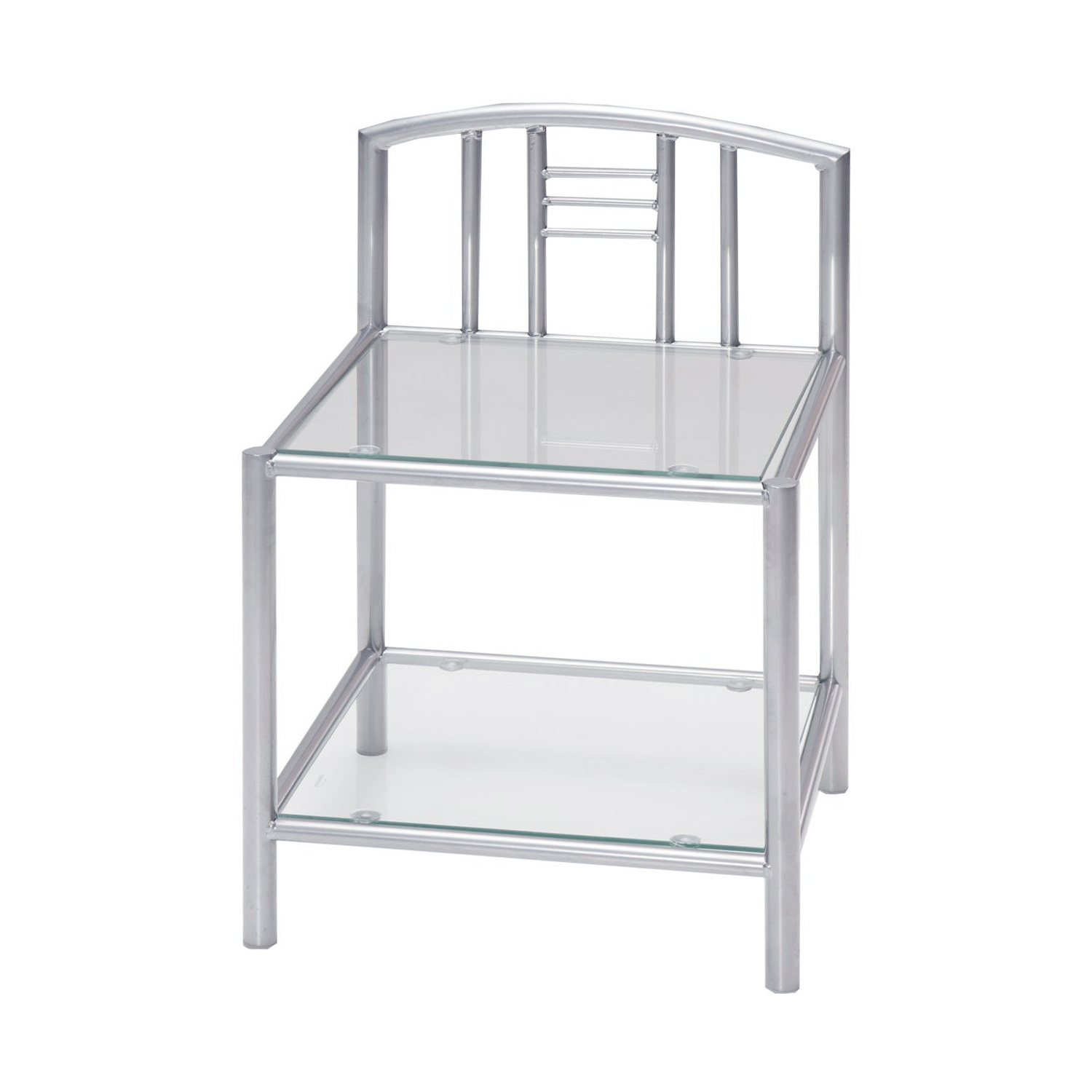 Noční stolek charakterizuje tradiční design, který se hodí do moderně zařízených interiérů. Stolek je vyroben z kovové konstrukce ve stříbrné barvě. Stolek disponuje dvěma skleněnými policemi, které slouží například k odložení právě rozečtené knihy, časopisu, brýlí a pod. Díky svému stylu se noční stolek hodí do ložnic a obývacích místností, ale najde široké uplatnění i v hotelech. Zboží dodáváme v demontu.