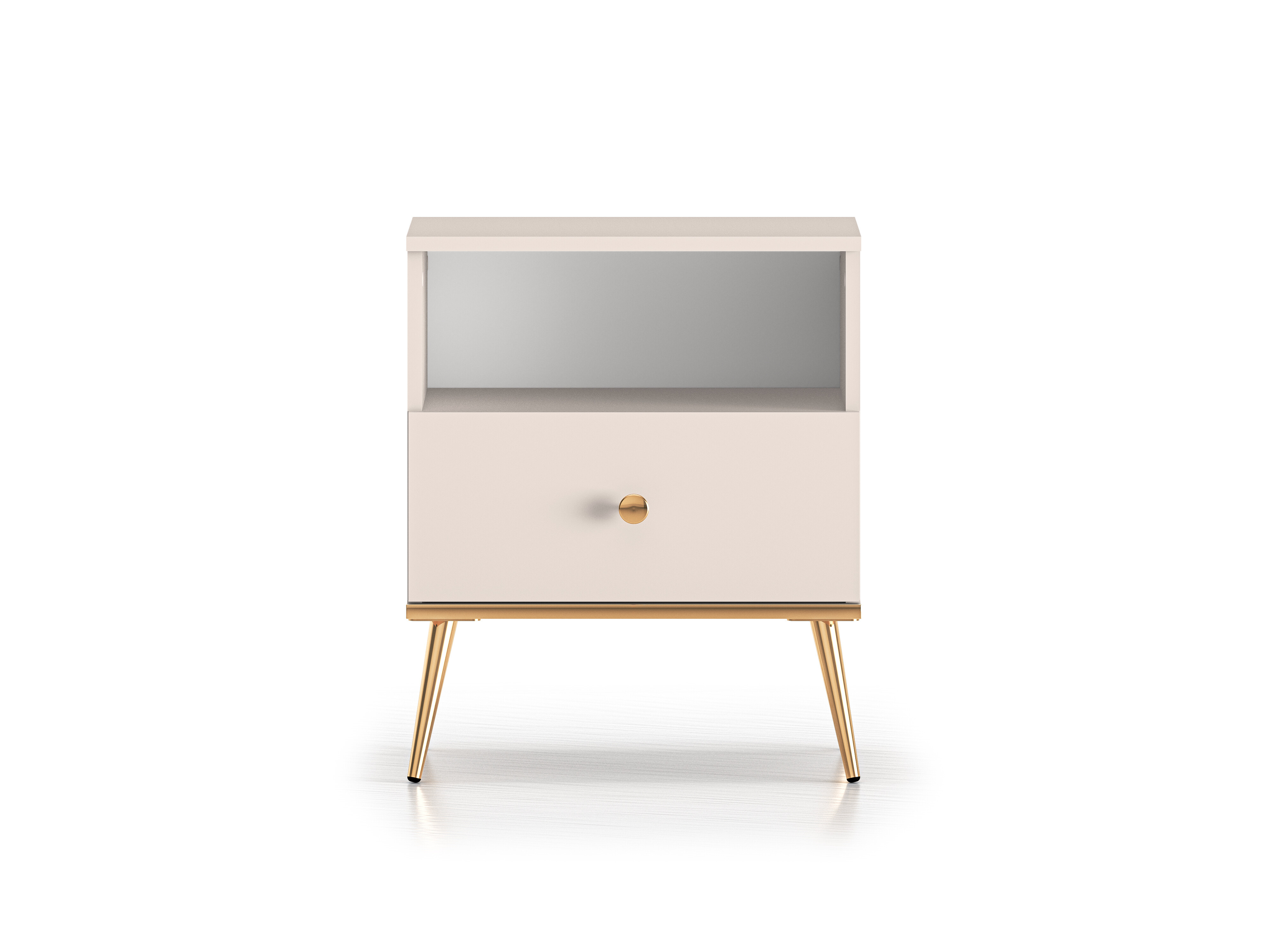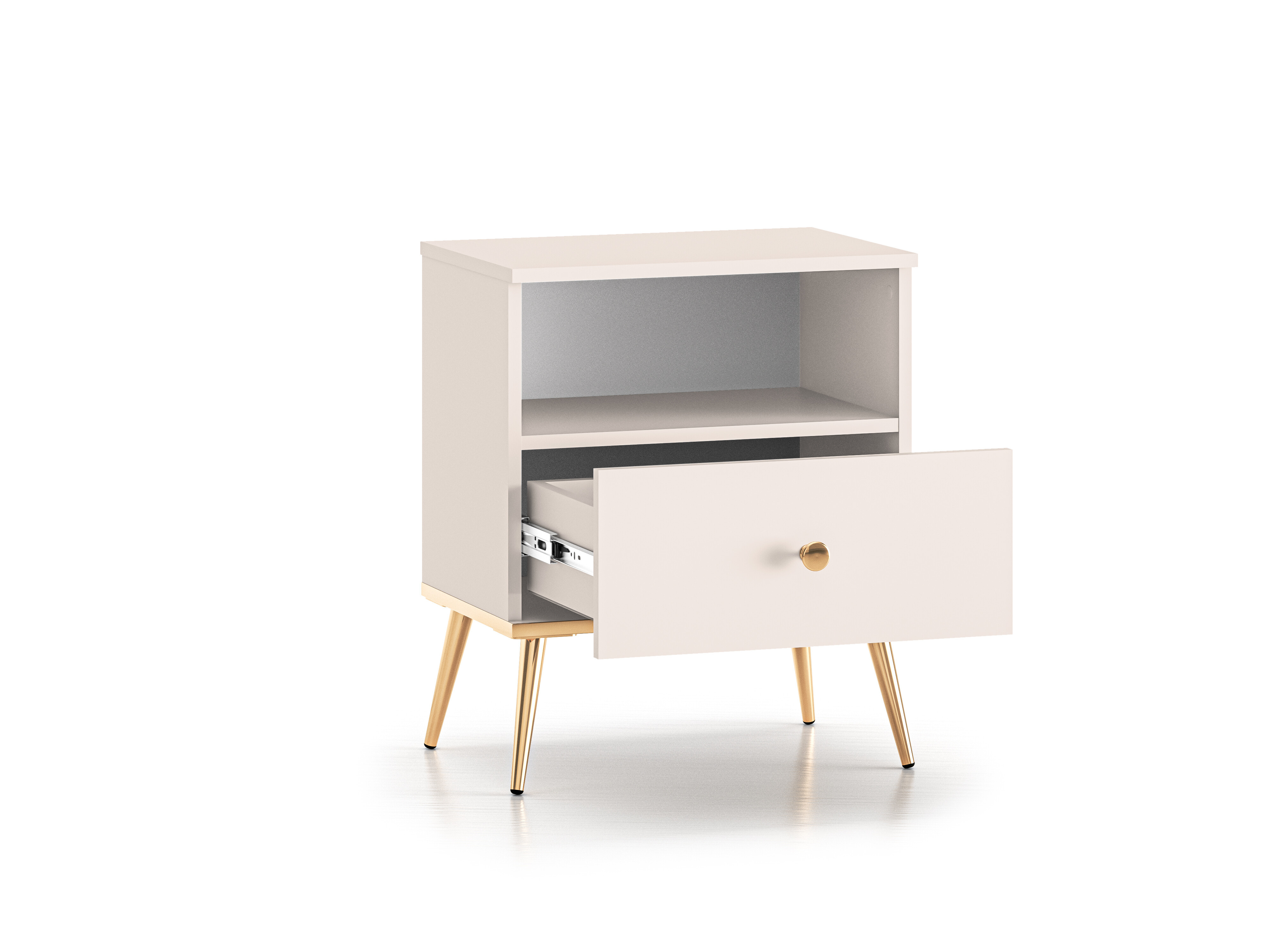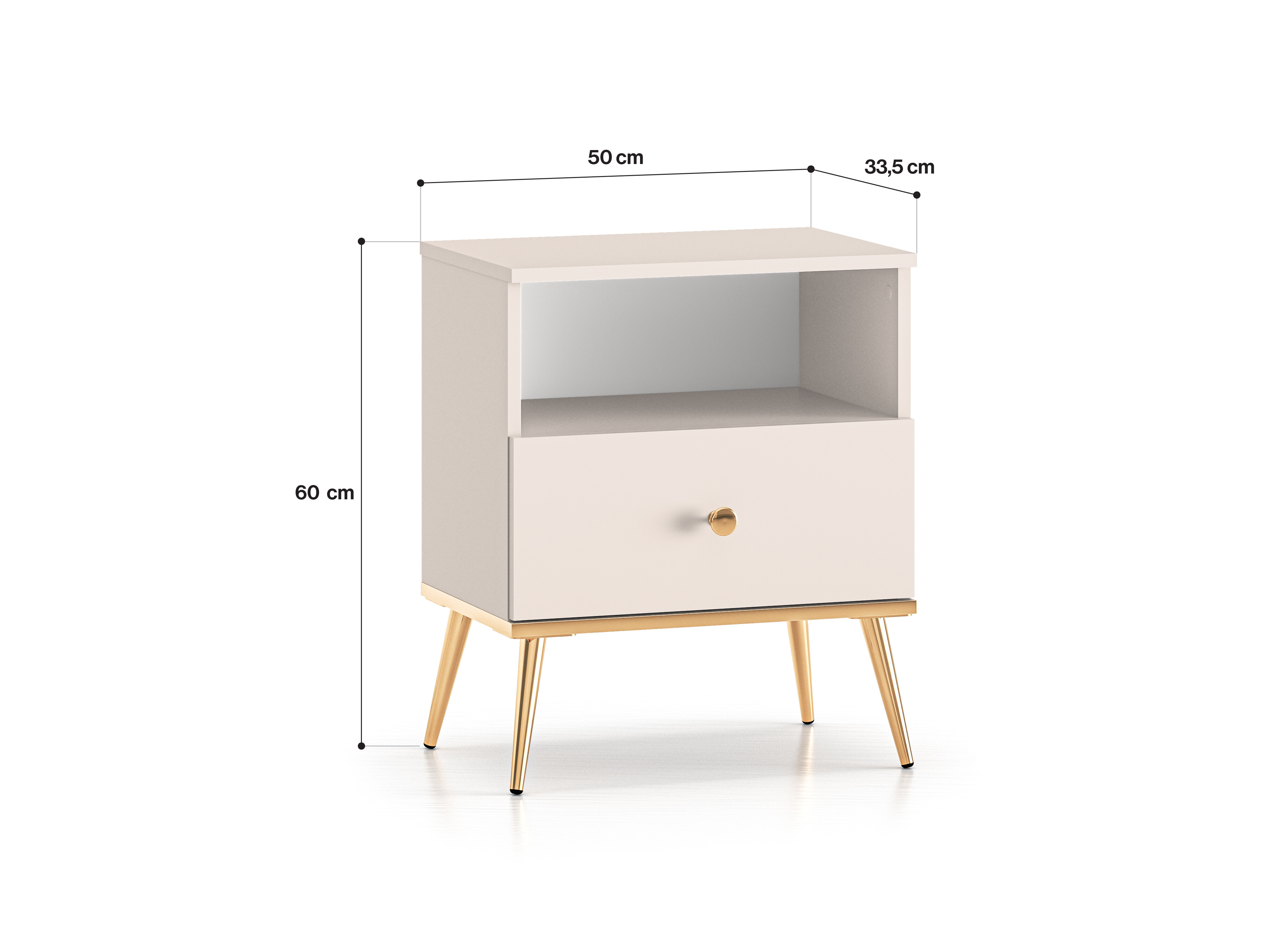 Noční stolek je vyrobená z kvalitního lamina v bílém provedení. Stabilní vysoké nohy v kovovém provedení a dvojitě pozinkovaná rukojeť jsou ve zlatém provedení. Zboží dodáváme v demontu.