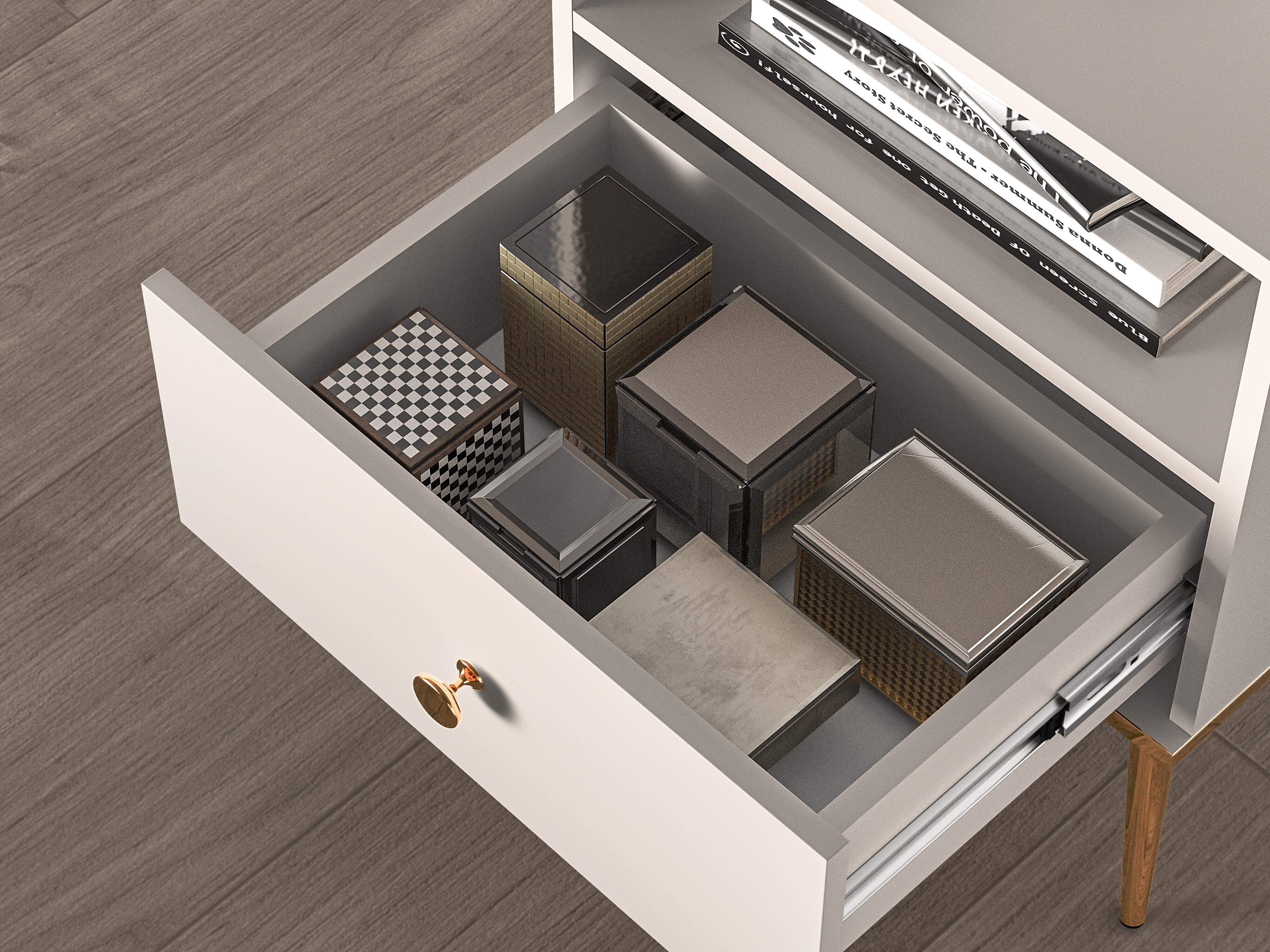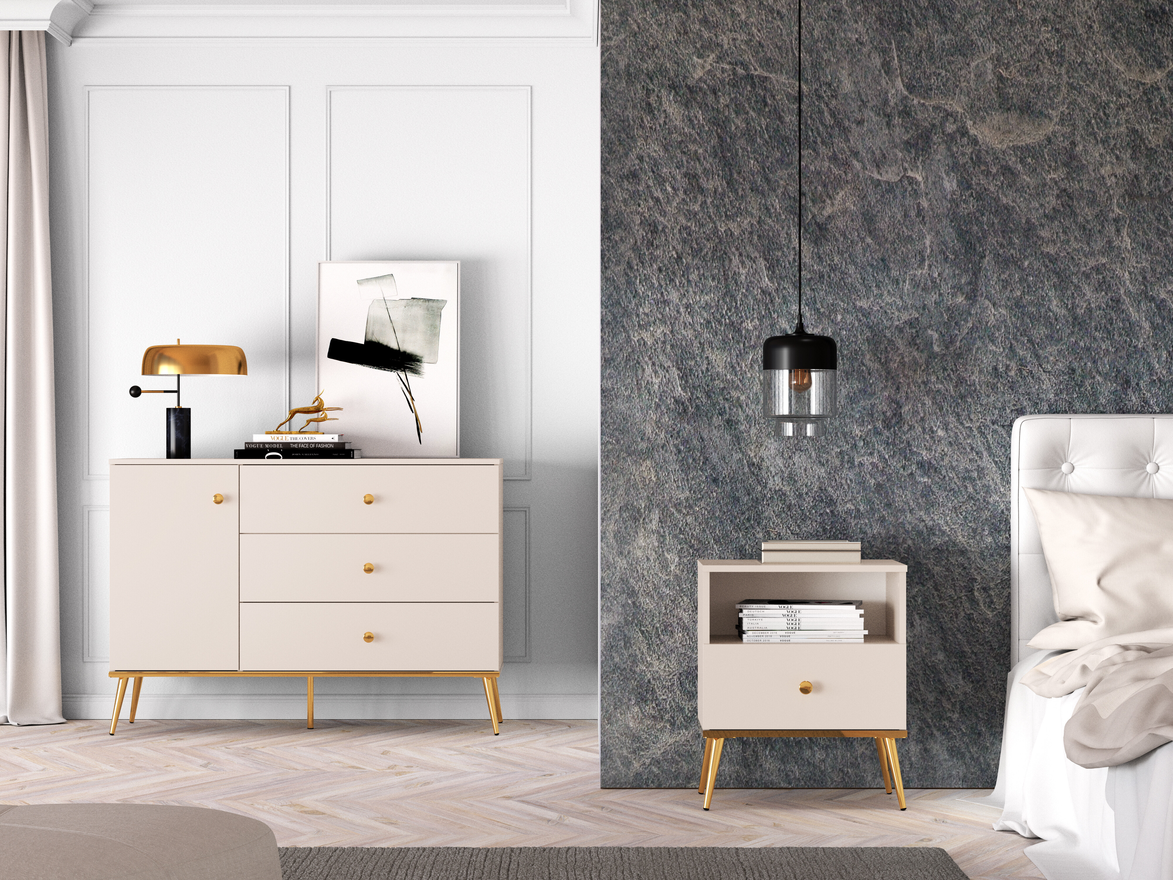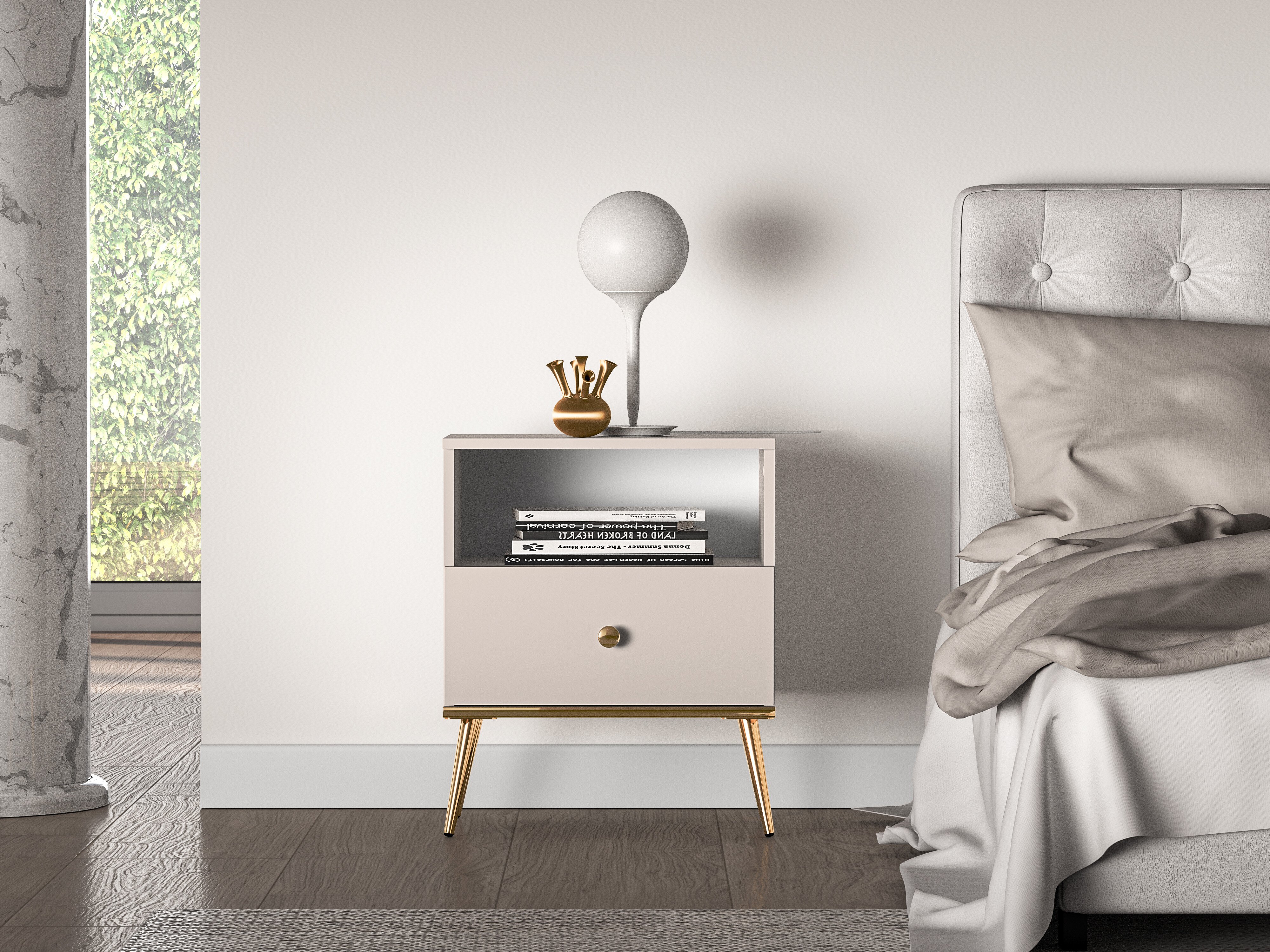 Noční stolek je vyrobená z kvalitního lamina v bílém provedení. Stabilní vysoké nohy v kovovém provedení a dvojitě pozinkovaná rukojeť jsou ve zlatém provedení. Zboží dodáváme v demontu.