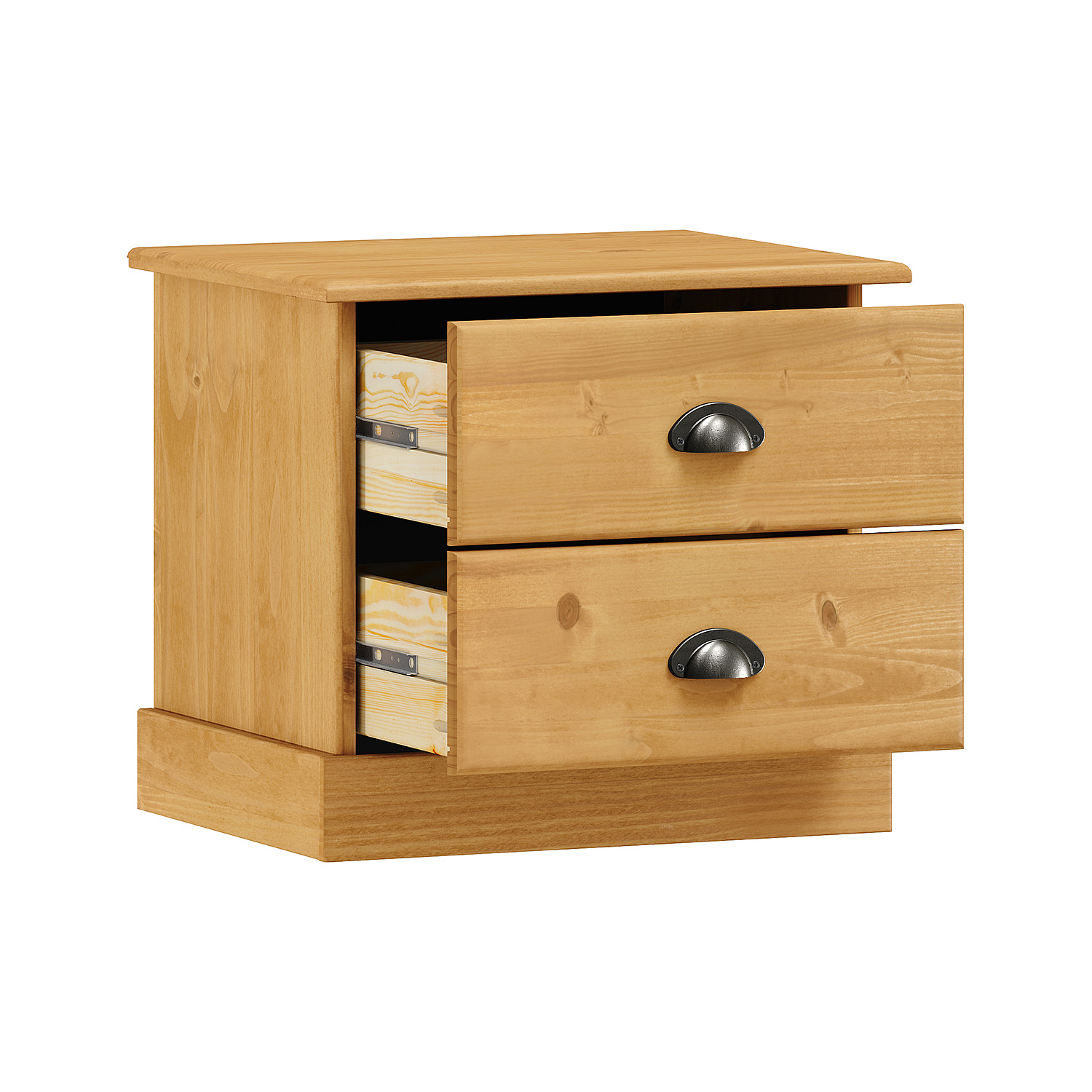 materiál masiv borovice voskovaná v medovém odstínu 2 zásuvky s kovovými úchytkami a pojezdy