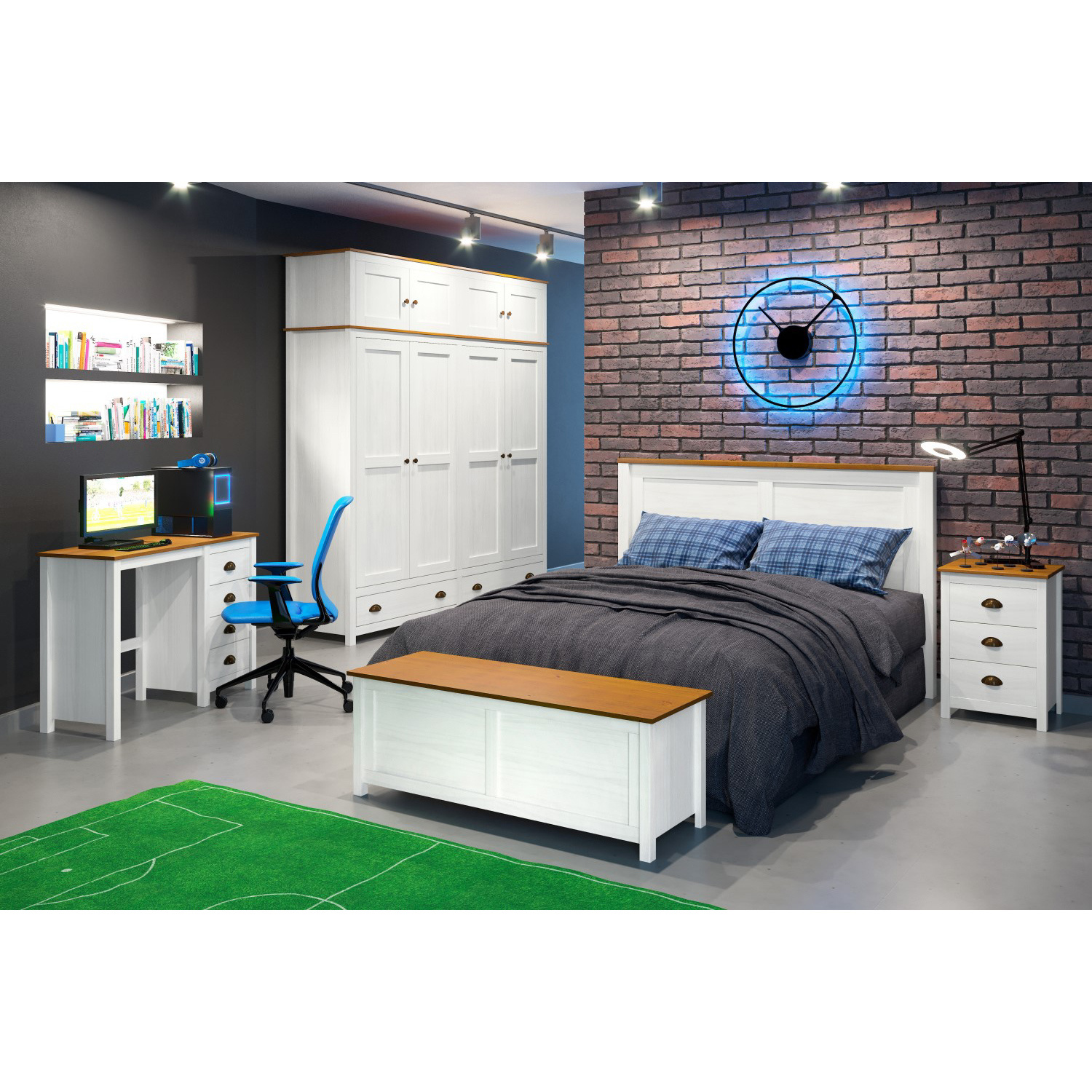 Noční stolek je vyroben z materiálu masiv borovice v matném provedení bílý/hnědý lak. Noční stolek má tři zásuvky s kovovými úchytkami a pojezdy. Zboží dodáváme v demontu.
