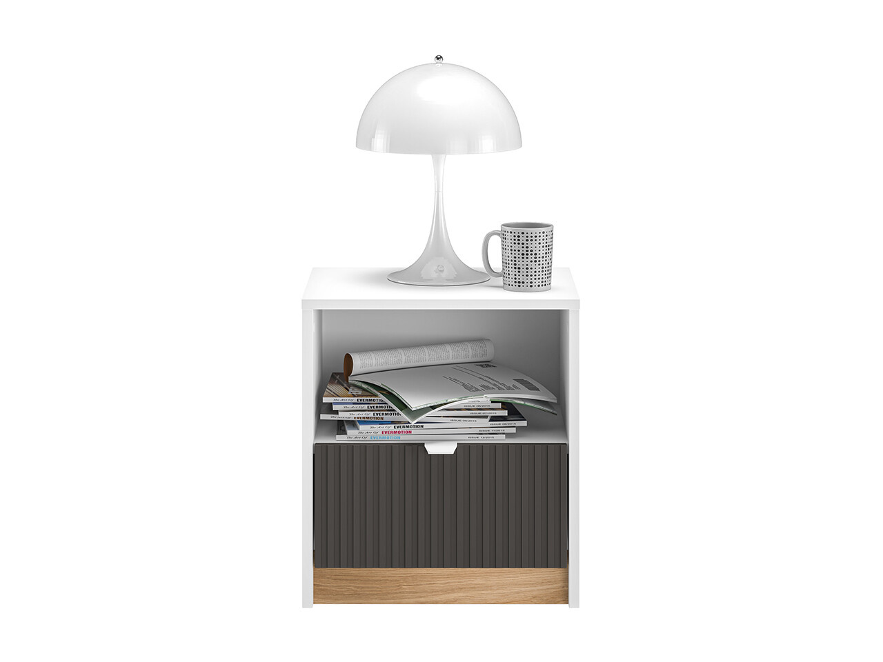 Noční stolekl TORINO je vyrobena z vysoce kvalitní laminované dřevotřískové desky s ABS hranou korpus v  dezénu bílá/ dub castelo a dvířka v dezénu bílá/ grafit v matném provedení. Zboží dodáváme v demontu.