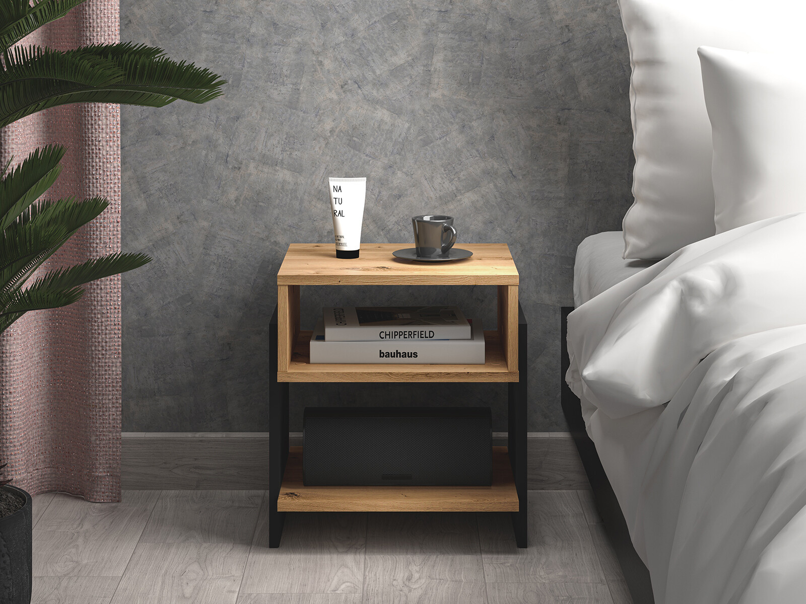 Noční stolek Tris je vyrobený z lamina v provedení dub artisan/ černá. Zboží dodáváme v demontu.