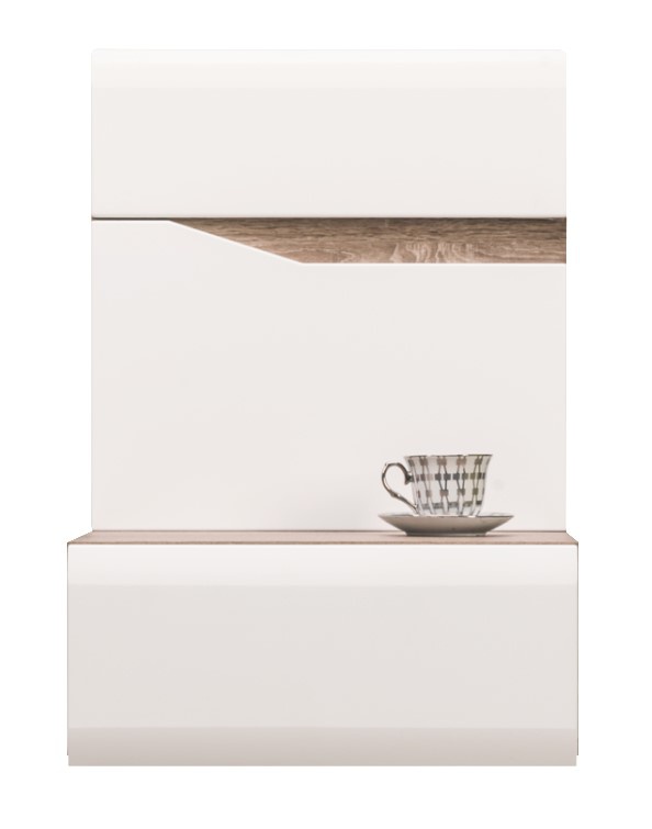 Závěsný noční stolekmá korpus vyroben z vysoce kvalitní laminované dřevotřískové desky v barvě dub sonoma lanýž. Dvířka a čela šuplíků jsou z MDF potažené PVC fólií v bílém lesku s frézovanými hranami. Tichý systém zavírání dveří a šuplíků ve standardu. Zboží je dodáváno v demontu.