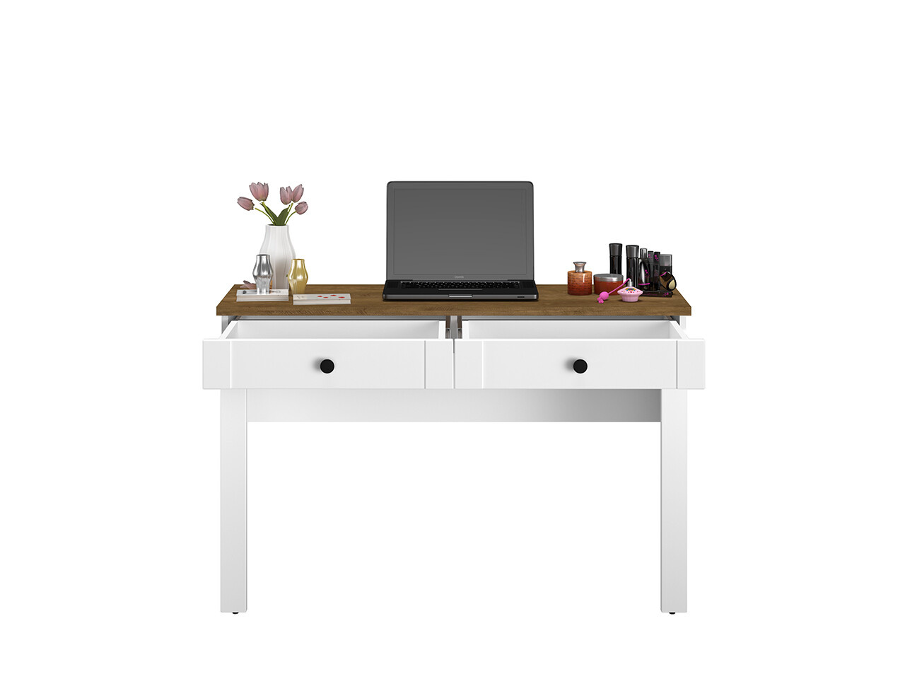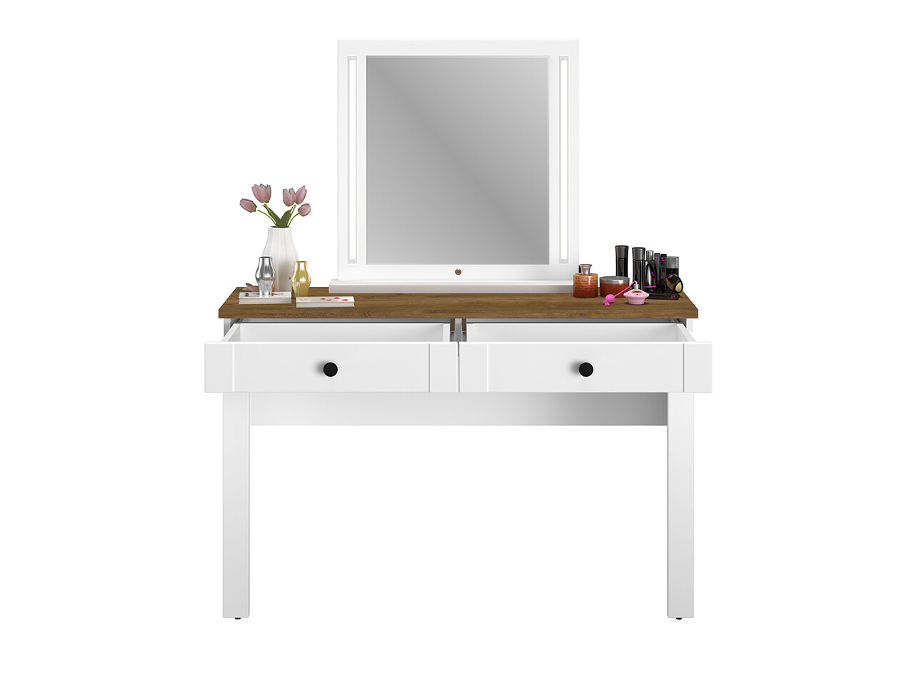 Toaletní stolek Lille  je vyroben z kvalitního lamina v dezénu korpus bílá/bílý mat a vrchní deska dub lefkas. Plastová úchytka černé barvy. Předností kolekce je osvětlení, systém tichého dovírání a zásuvky se zvýšenou nosností. Zboží dodáváme v demontu.