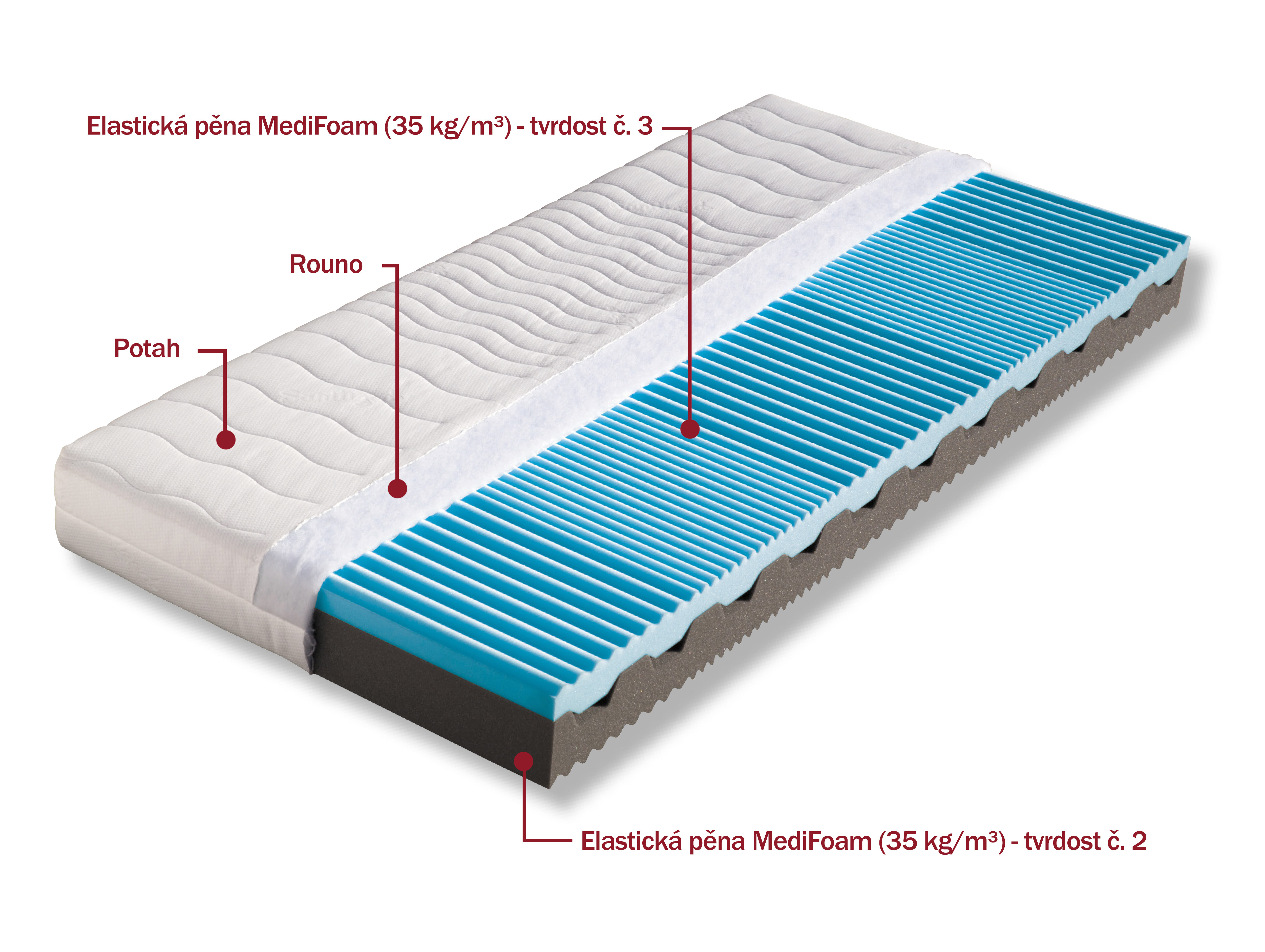 Pětizónová matrace složená ze dvou elastických pěn MediFoam odlišných objemových hmotností nabízí volbu dvojí tvrdosti. Střed jádra matrace je provzdušněn příčnými průduchy, které zaručují změkčení matrace v exponovaných místech. Matrace lze vybrat v potahu ÚPLET nebo ALOE VERA. V objednávce prosím uveďte Vámi vybraný potah.