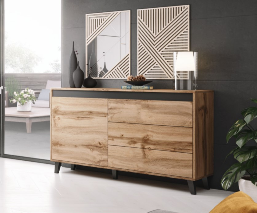 Moderní komoda NORD v minimalistickém stylu je vyrobena z kvalitního lamina tl.16mm v kombinaci barev dub wotan/antracit. Má tři šuplíky a jedny dvířka v bezúchytovém provedení. Komoda stojí na antracitových nožkách.Šuplíky otvíání push, otvírání dveří PUSH-CLICK. Zboží je dodáváno v demontu.