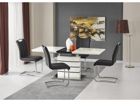 Jídelní stůl rozkládací Nord je svým vzhledem velmi moderní, elegantní až nadčasový. Jídelní stůl je vyroben z materiálu MDF lakovaná v barvě bílo-černá, podstava stolu je z oceli nerezové. Tento jídelní stůl Nord je vhodný do domácností, ale i do různých restaurací či kaváren a hotelů. Zboží je dodáváno v demontu.