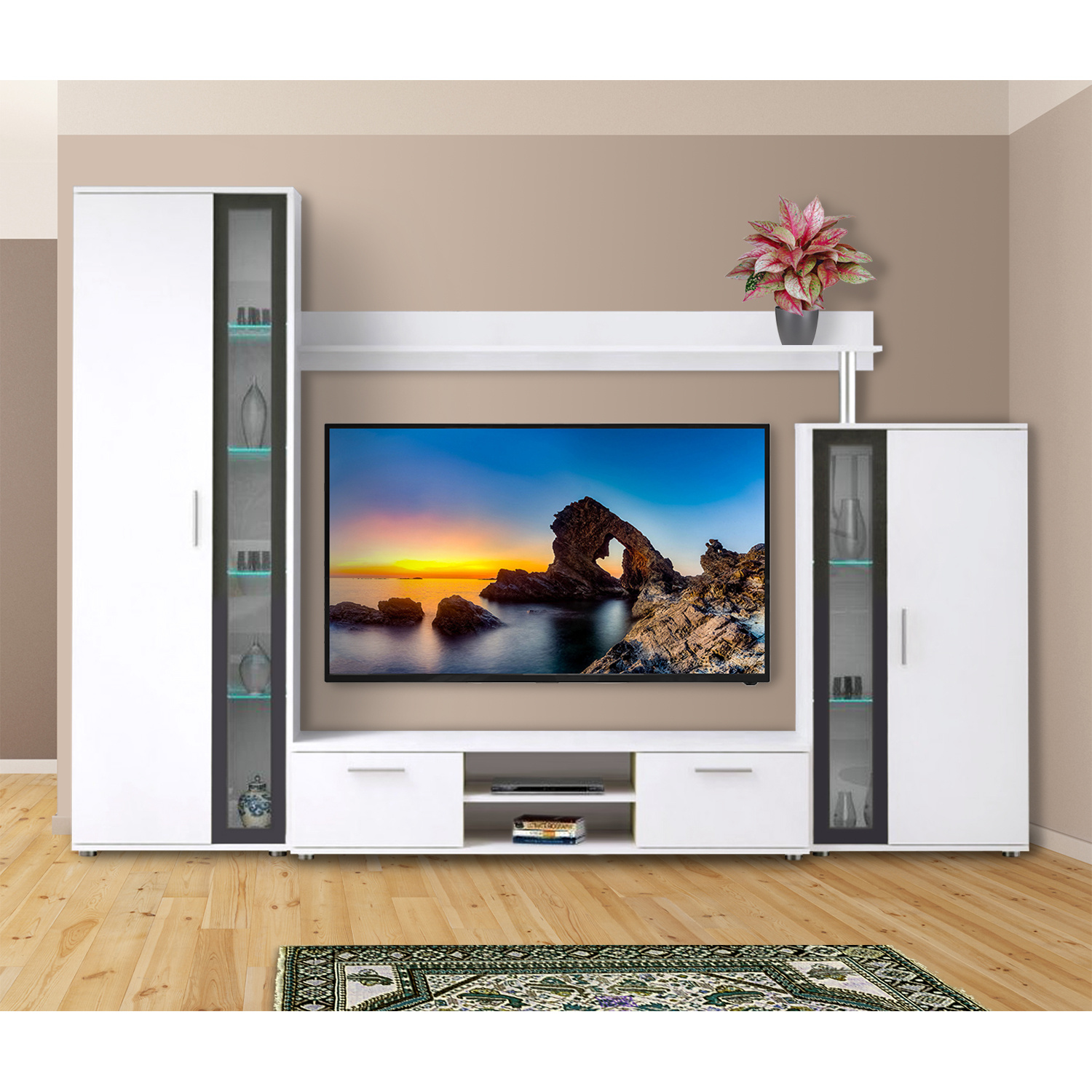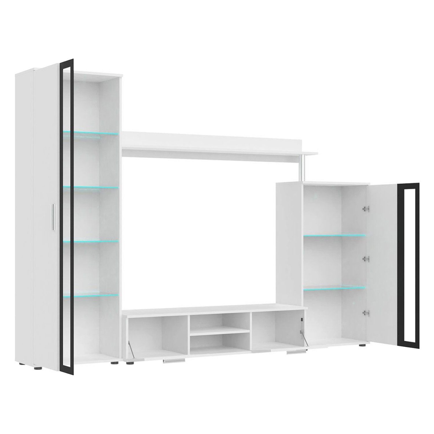 Obývací stěna z lamina v barevném provedení bílá. Vitríny mají částečně prosklené dveře, skleněné police s LED podsvícením.