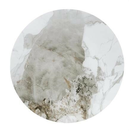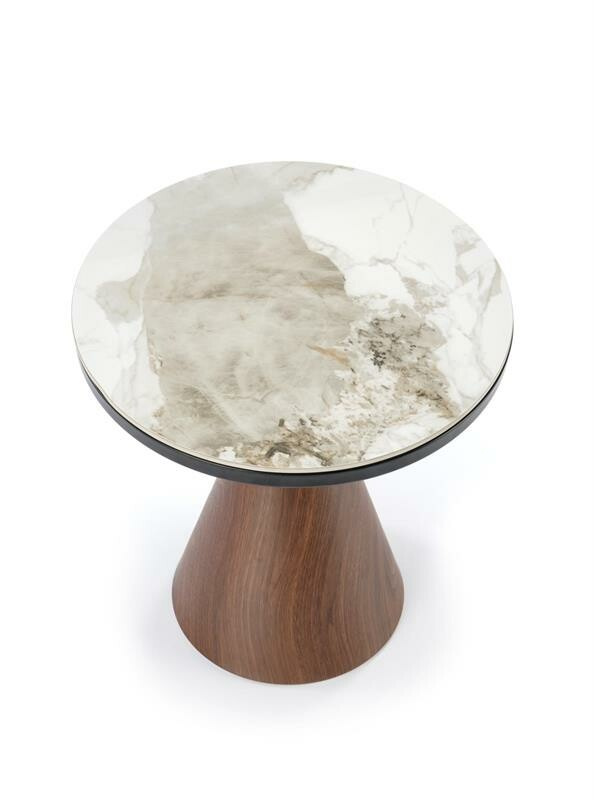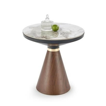 Odkládací stolek GENESIS má stolovou desku z keramiky v bílém mramorovém dekoru usazenou na ocelové noze lakované v dekoru ořech se zlatým pruhem.