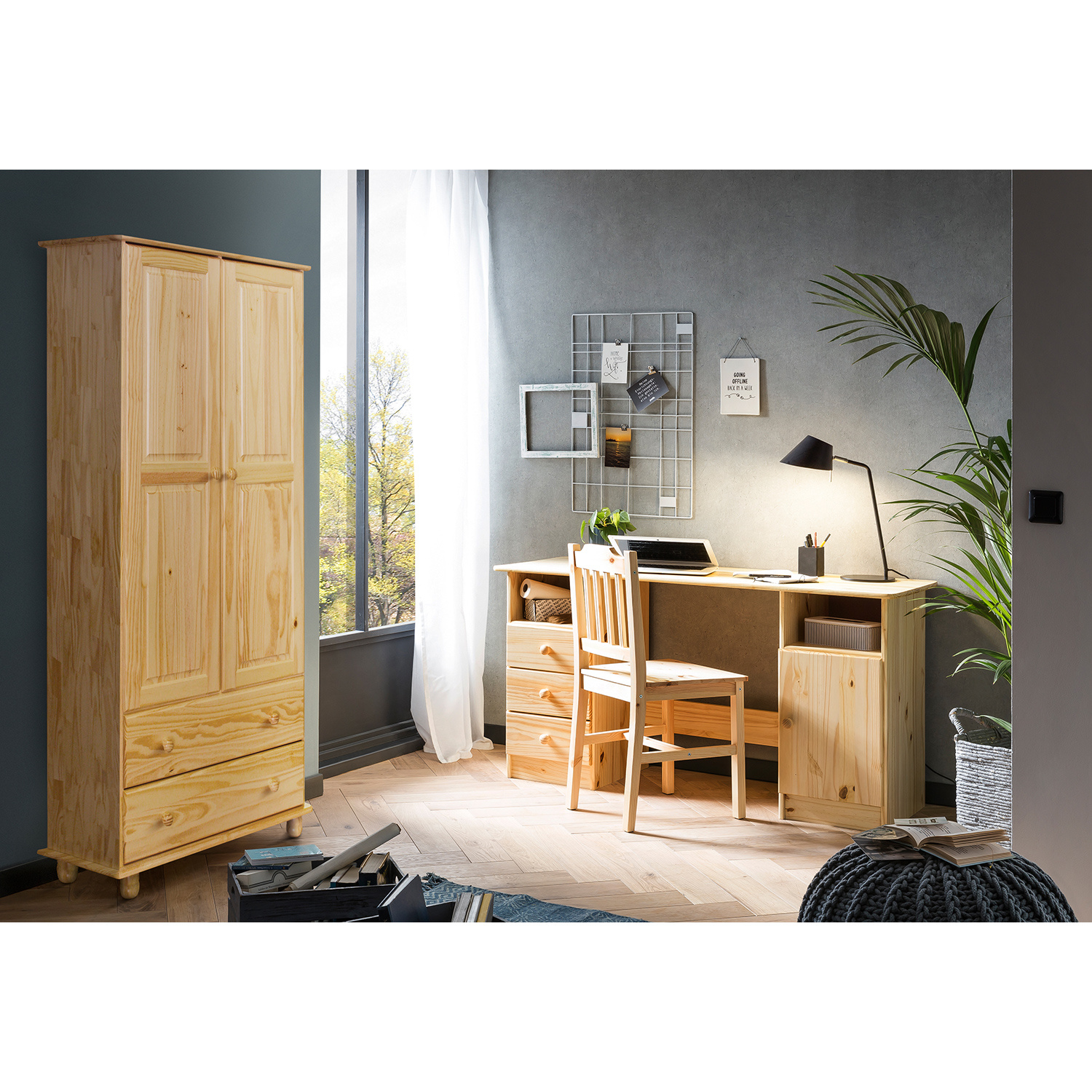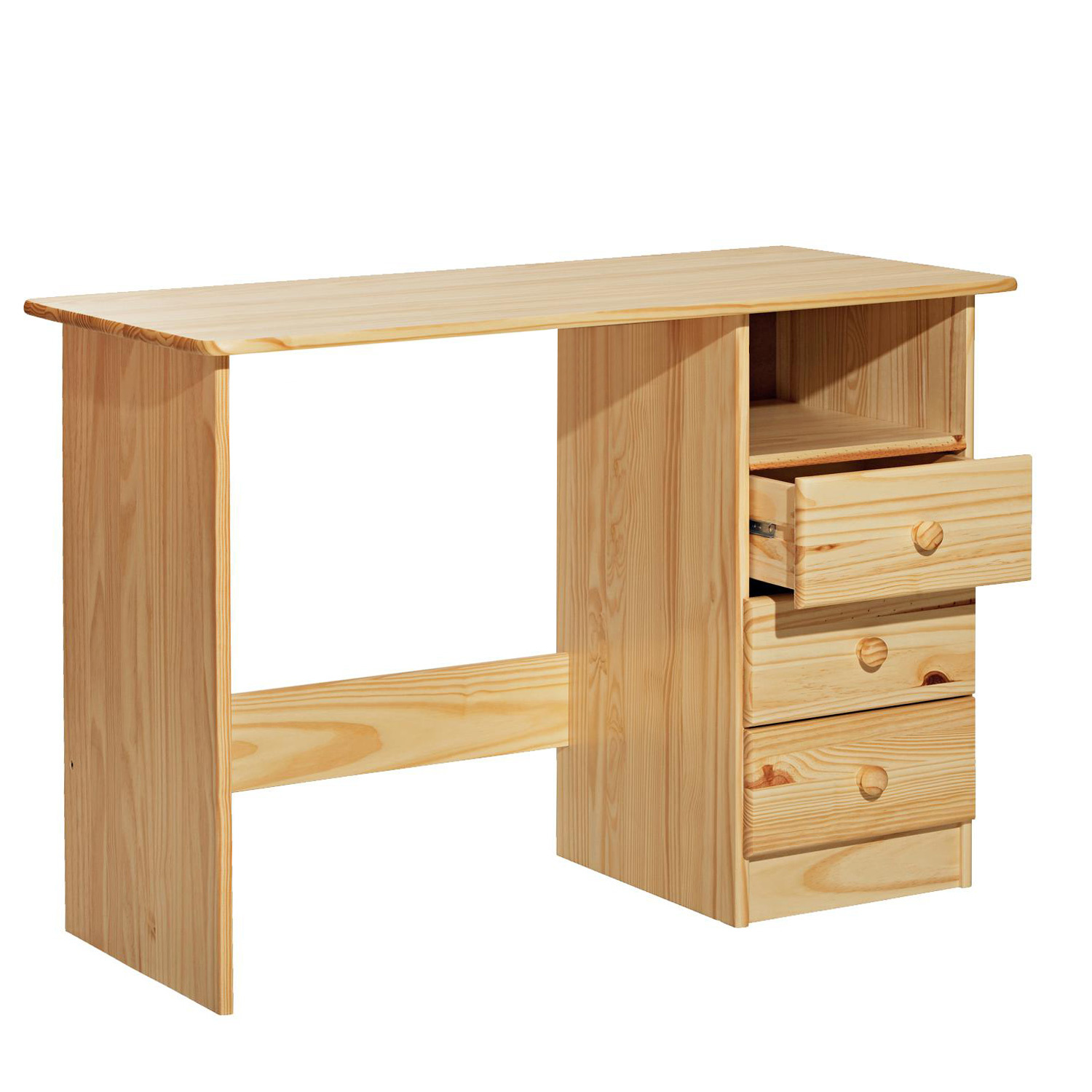 Psací stůl z masivní borovice je vyroben v lakovaném provedení. Stůl má 3 zásuvky s kovovými pojezdy (montáž možná pouze na pravou stranu). Dodáván bez výsuvu pro klávesnici, výsuv možno dokoupit( výsuv pod klávesnici) . Zboží dodáváme v demontu bez dekorací.