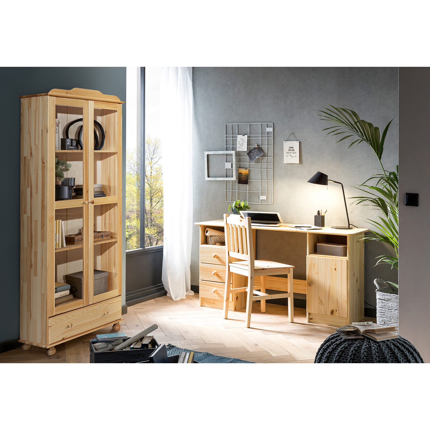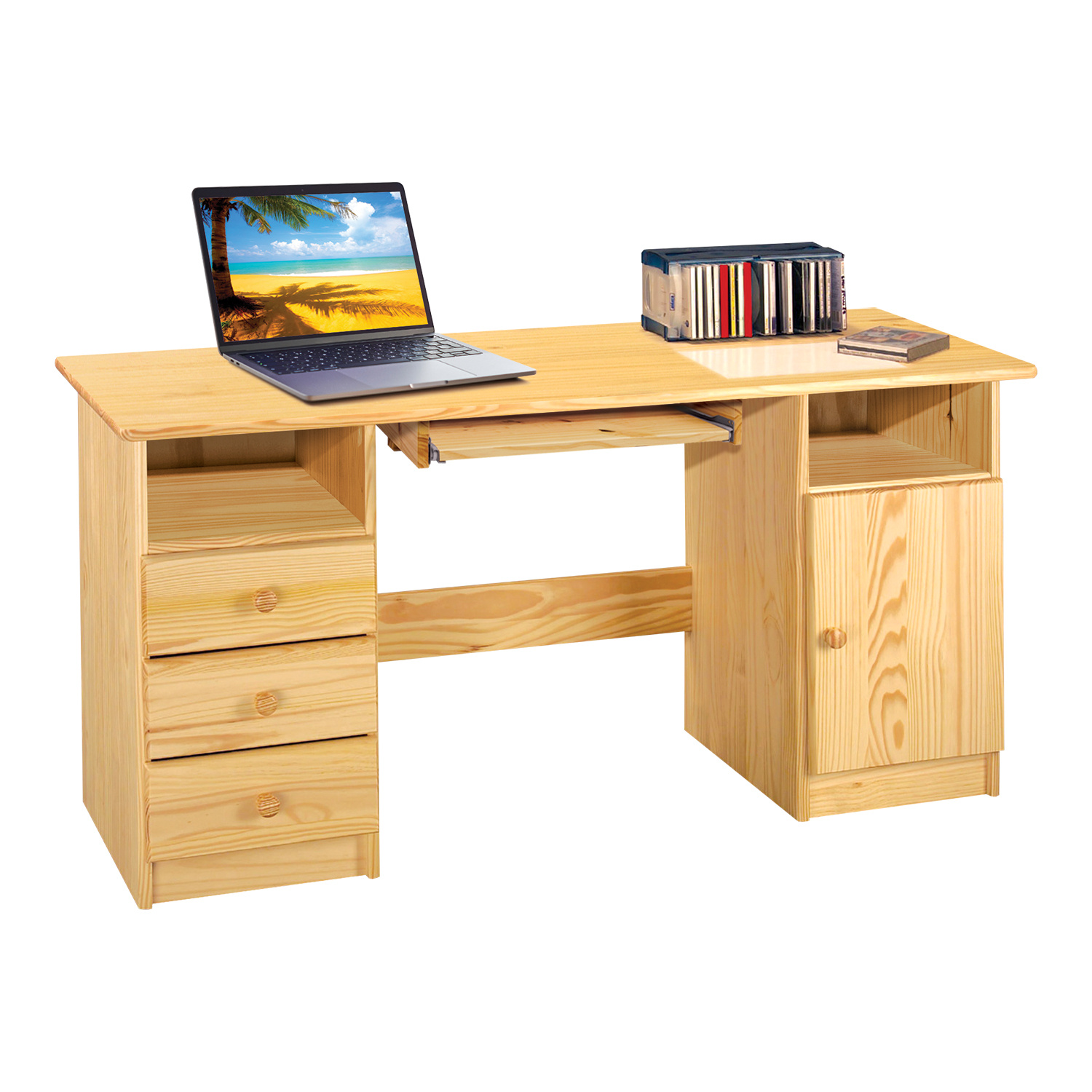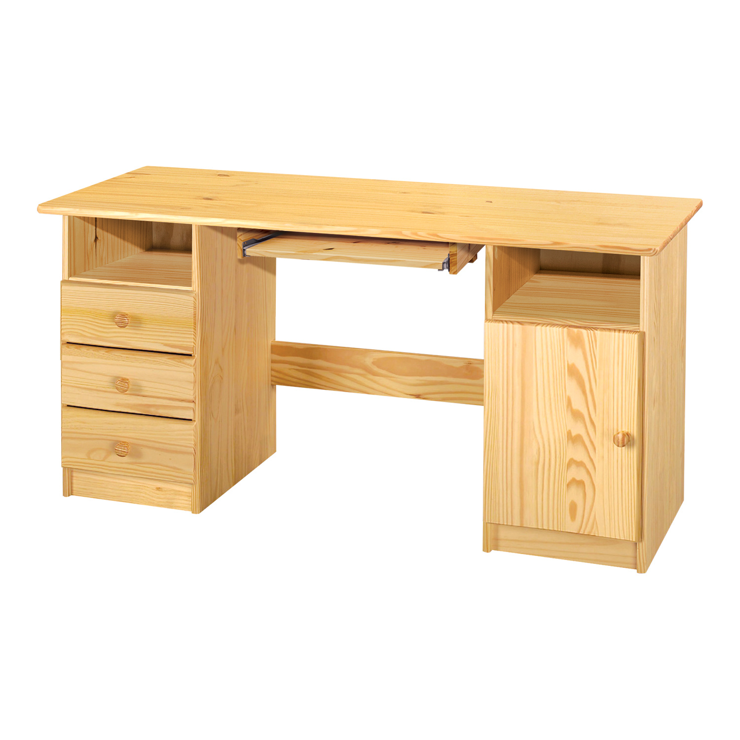 Psací stolek je vyroben z masivní borovice v lakovaném provedení. Obsahuje 3 zásuvky s kovovými pojezdy a skříňku s dvířky. Je dodáván bez výsuvu pro klávesnici, výsuv možno dokoupit zvlášť ( kód 880). Zboží dodáváme v demontu.