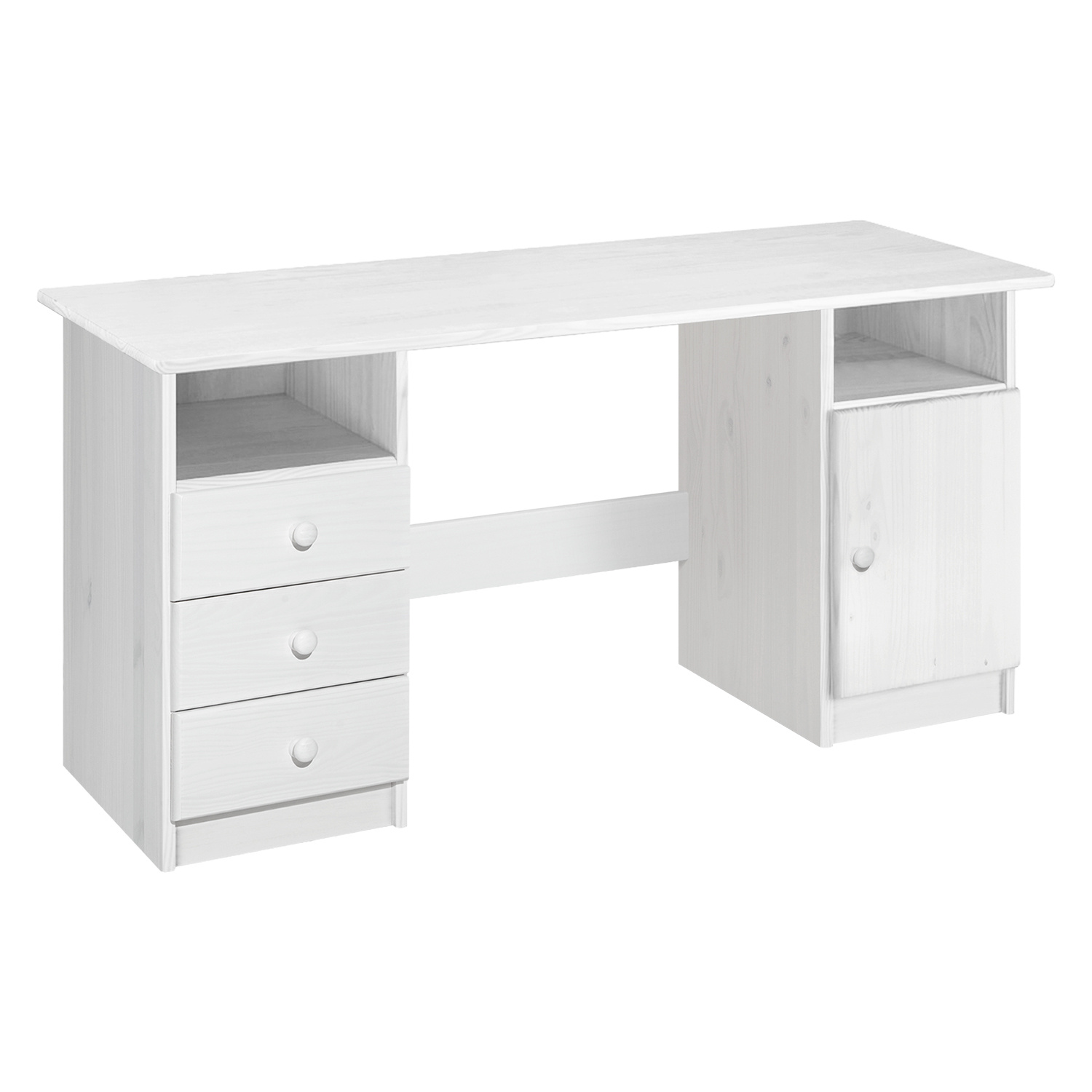 PC stůl je vyroben z materiálu masiv borovice v barevném provedení bílá lak. Obsahuje 3 zásuvky s kovovými pojezdy, skříňka s dvířky,bez výsuvu pro klávesnici. Zboží dodáváme v demontu.