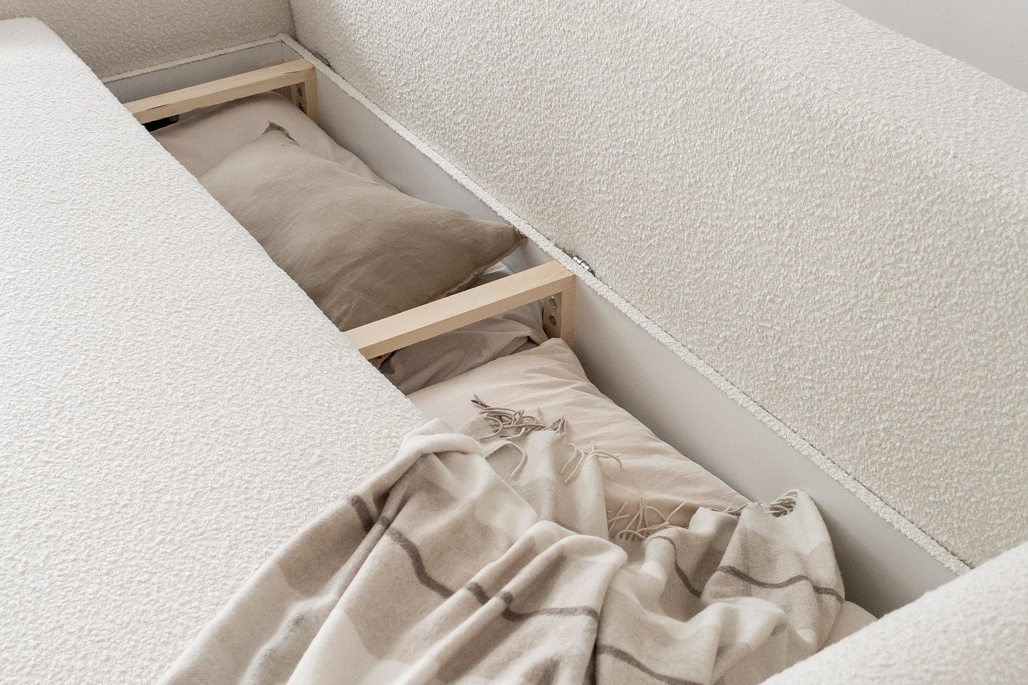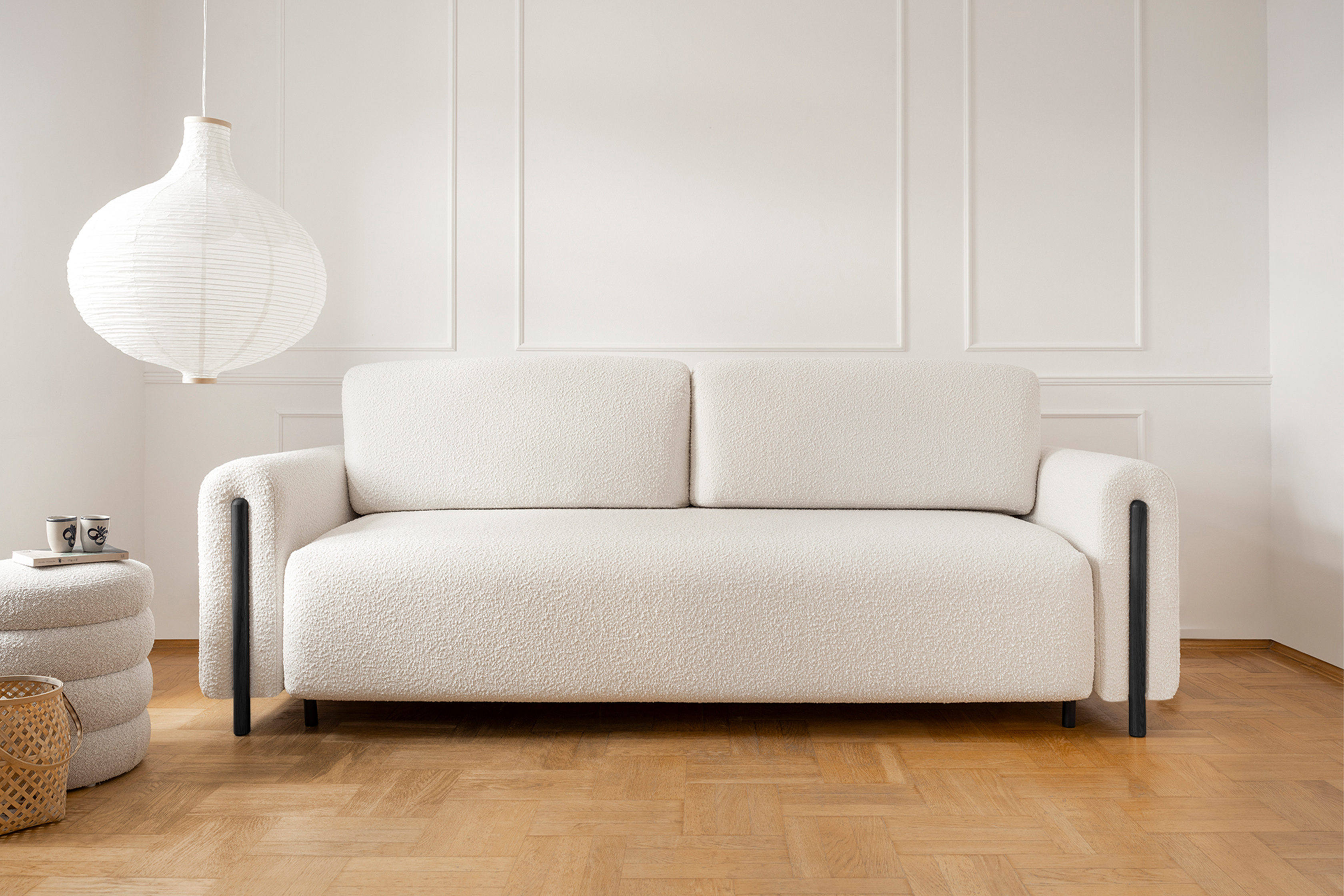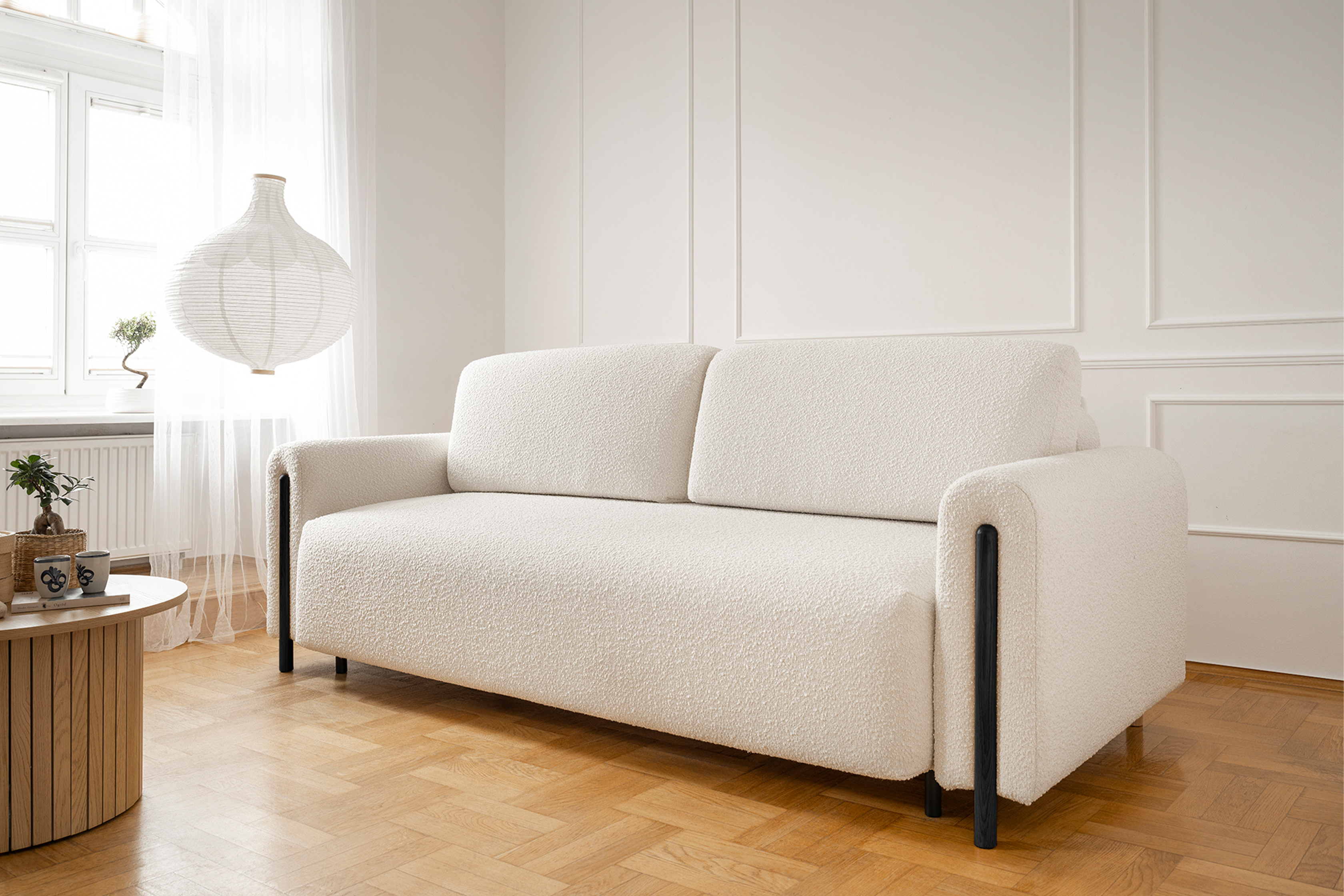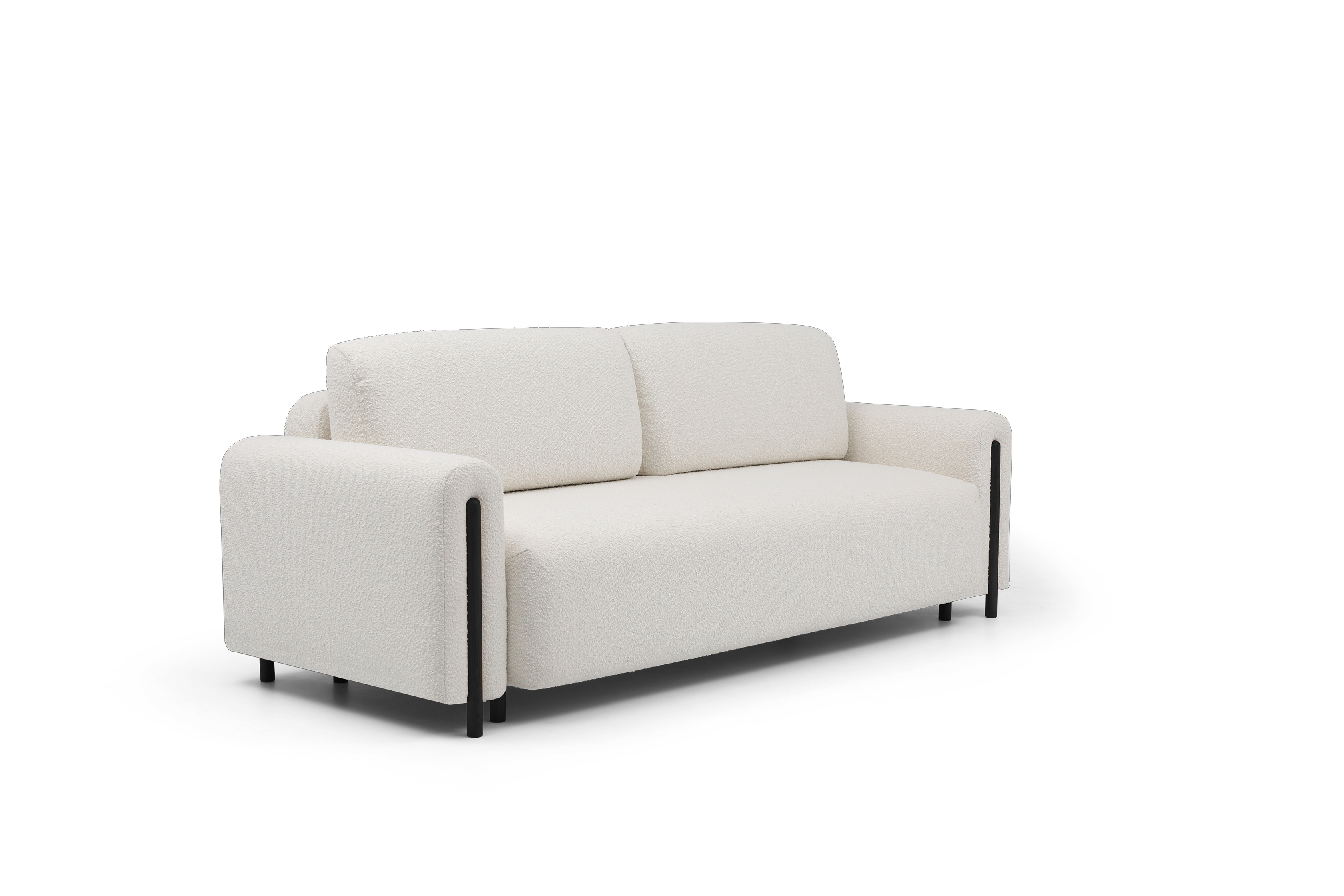 Pohovka Arcadova II v provedení boucle tkanině v dezénu Jaffray 01 - látka příjemná na dotek, vyrobená z nejkvalitnějších surovin z důrazem na detail. Kostru pohovky tvoří masivní dřevo a dřevotříska. Vlnité pružiny faliste, kvalitní HR pěna a pružná PUR pěna zaručí pružnost a dokonalý komfort sedací plochy, pod kterou se nachází úložný prostor. Záda jsou čalouněná, takže ji můžete umístit do prostoru. Pohovka stojí na 12 cm vysokých dřevěných nožkách. Díky rozkládací funkci vznikne spací plocha 146X200 cm na příležitosné spaní. Pohovku zdobí černé dřevěné prvky.
