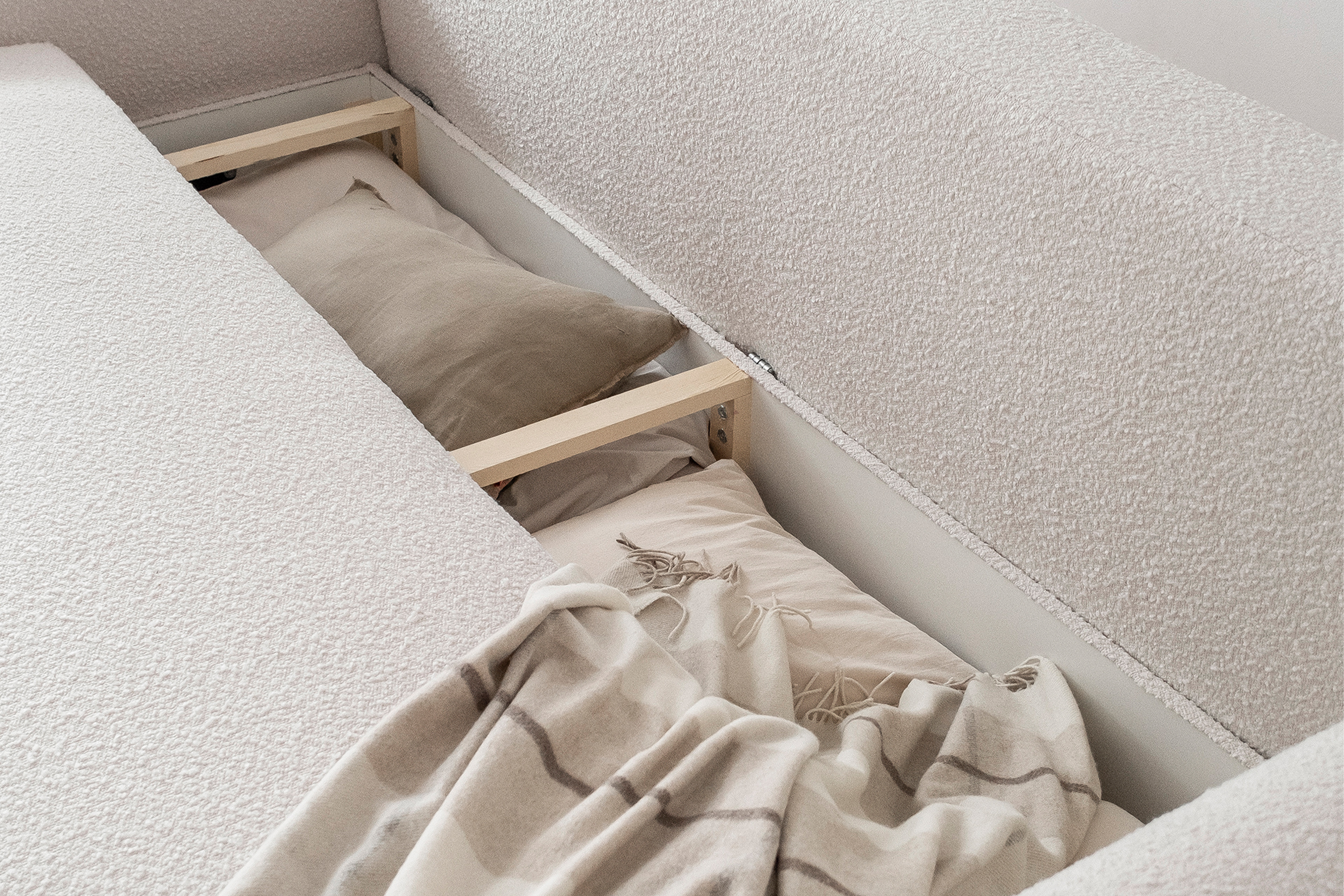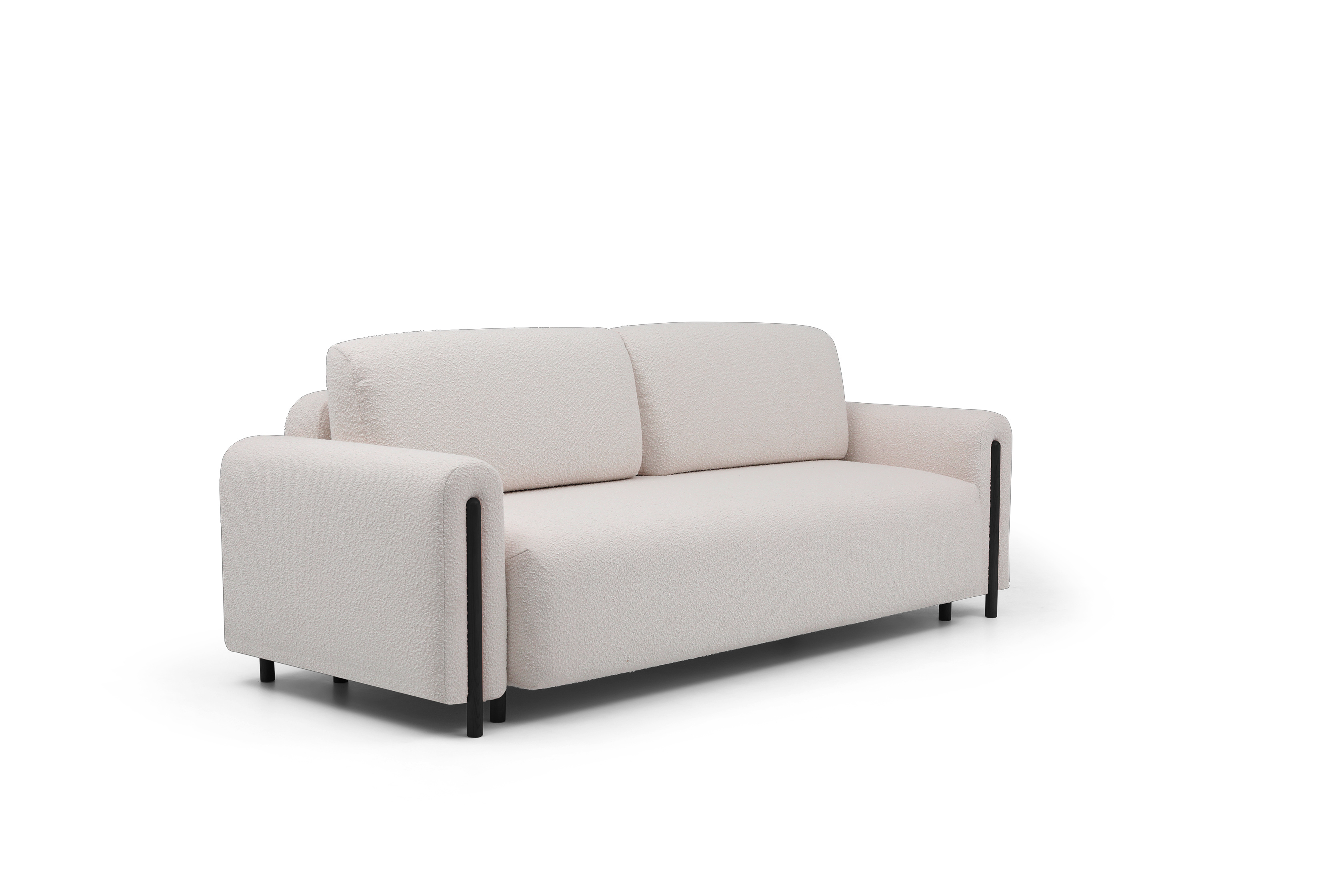 Pohovka Arcadova II v provedení boucle tkanině v dezénu Jaffray 18 - látka příjemná na dotek, vyrobená z nejkvalitnějších surovin z důrazem na detail. Kostru pohovky tvoří masivní dřevo a dřevotříska. Vlnité pružiny faliste, kvalitní HR pěna a pružná PUR pěna zaručí pružnost a dokonalý komfort sedací plochy, pod kterou se nachází úložný prostor. Záda jsou čalouněná, takže ji můžete umístit do prostoru. Pohovka stojí na 12 cm vysokých dřevěných nožkách. Díky rozkládací funkci vznikne spací plocha 146X200 cm na příležitosné spaní. Pohovku zdobí černé dřevěné prvky.