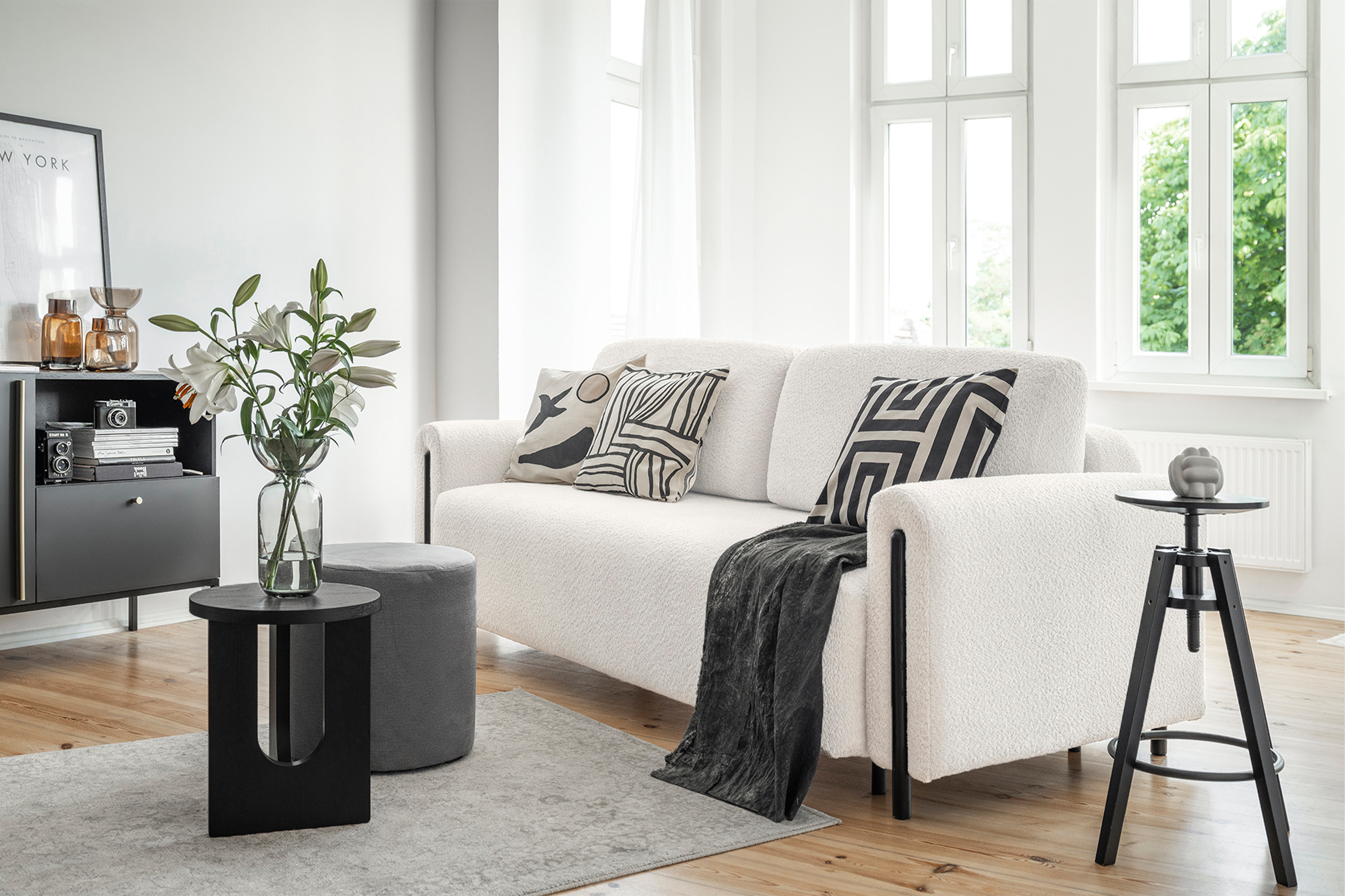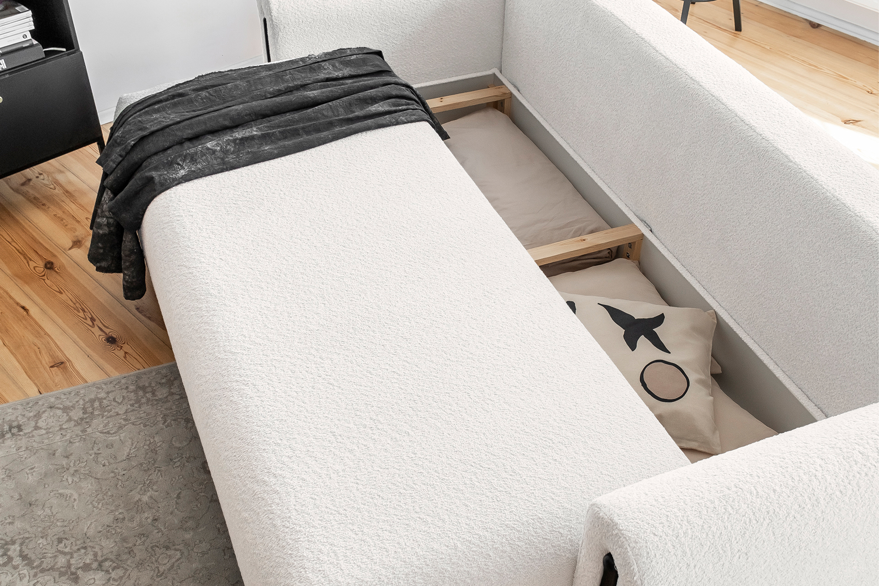 Pohovka Arcadova II v provedení boucle tkanině v dezénu Royal 01 - látka příjemná na dotek, vyrobená z nejkvalitnějších surovin z důrazem na detail. Kostru pohovky tvoří masivní dřevo a dřevotříska. Vlnité pružiny faliste, kvalitní HR pěna a pružná PUR pěna zaručí pružnost a dokonalý komfort sedací plochy, pod kterou se nachází úložný prostor. Záda jsou čalouněná, takže ji můžete umístit do prostoru. Pohovka stojí na 12 cm vysokých dřevěných nožkách. Díky rozkládací funkci vznikne spací plocha 146X200 cm na příležitosné spaní. Pohovku zdobí černé dřevěné prvky.