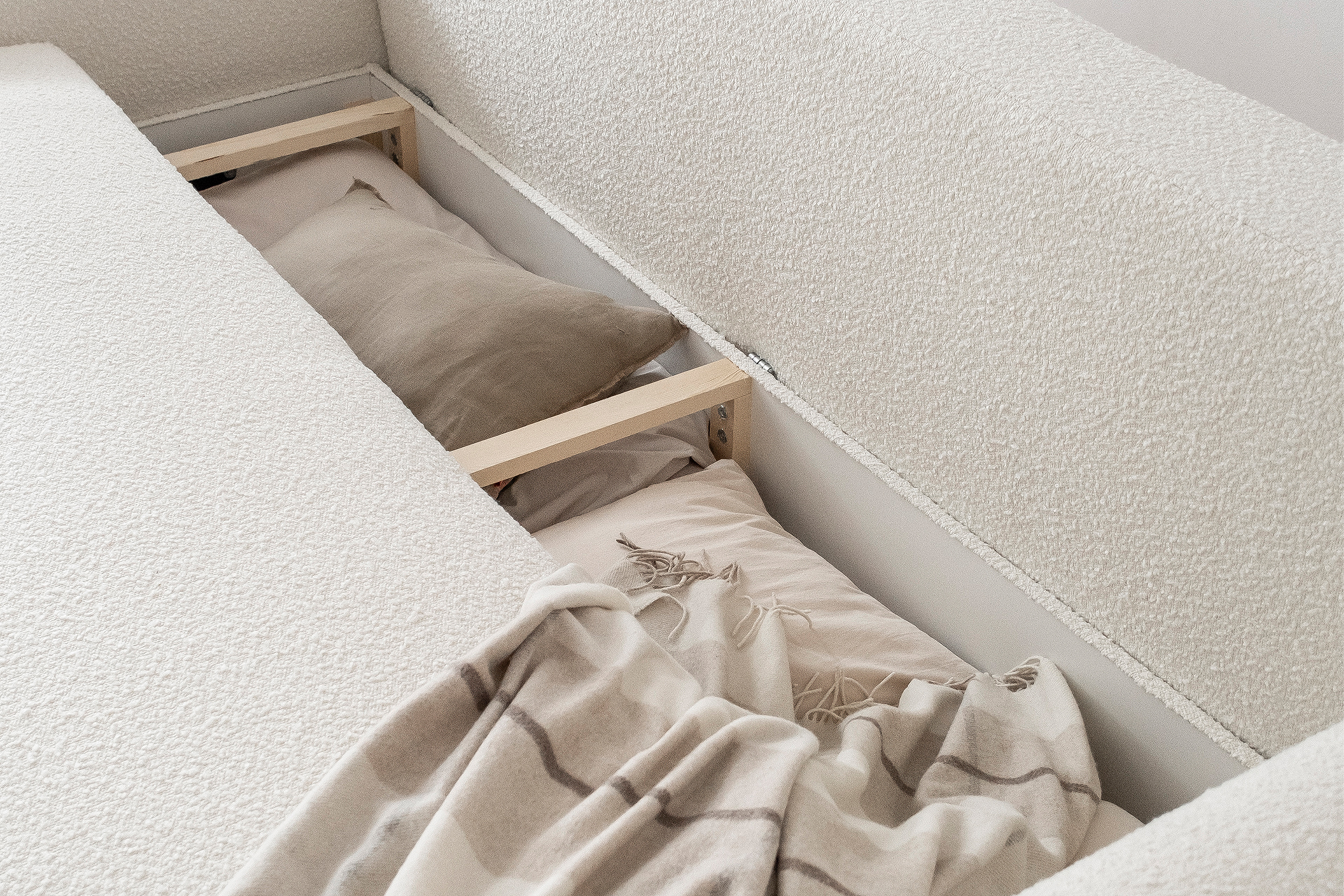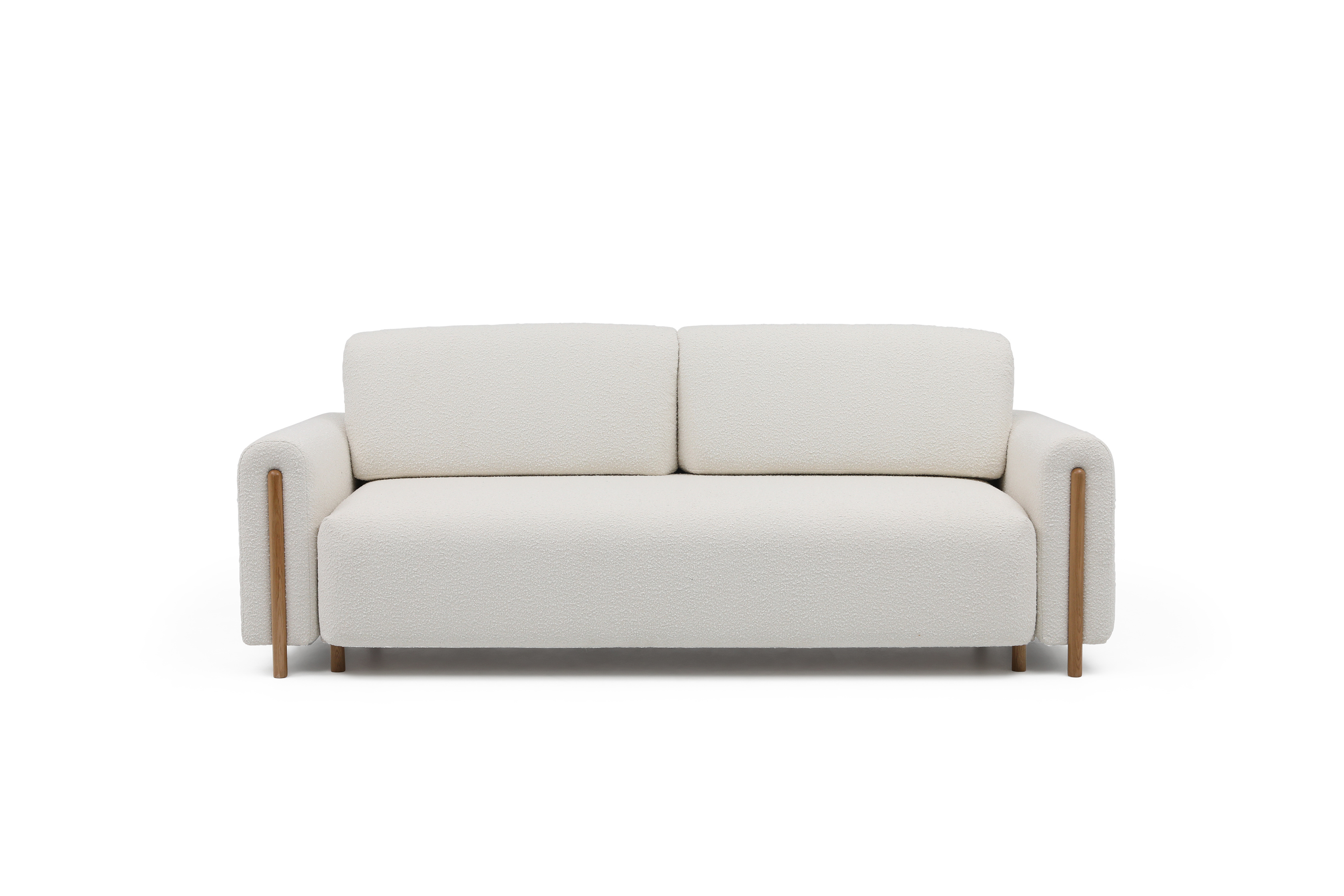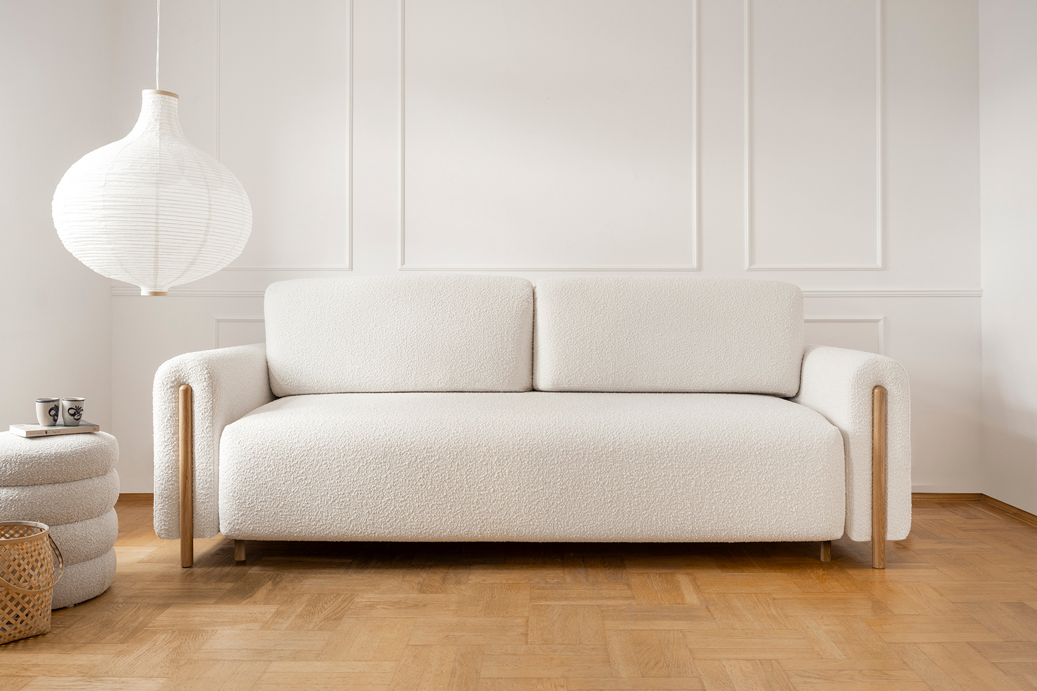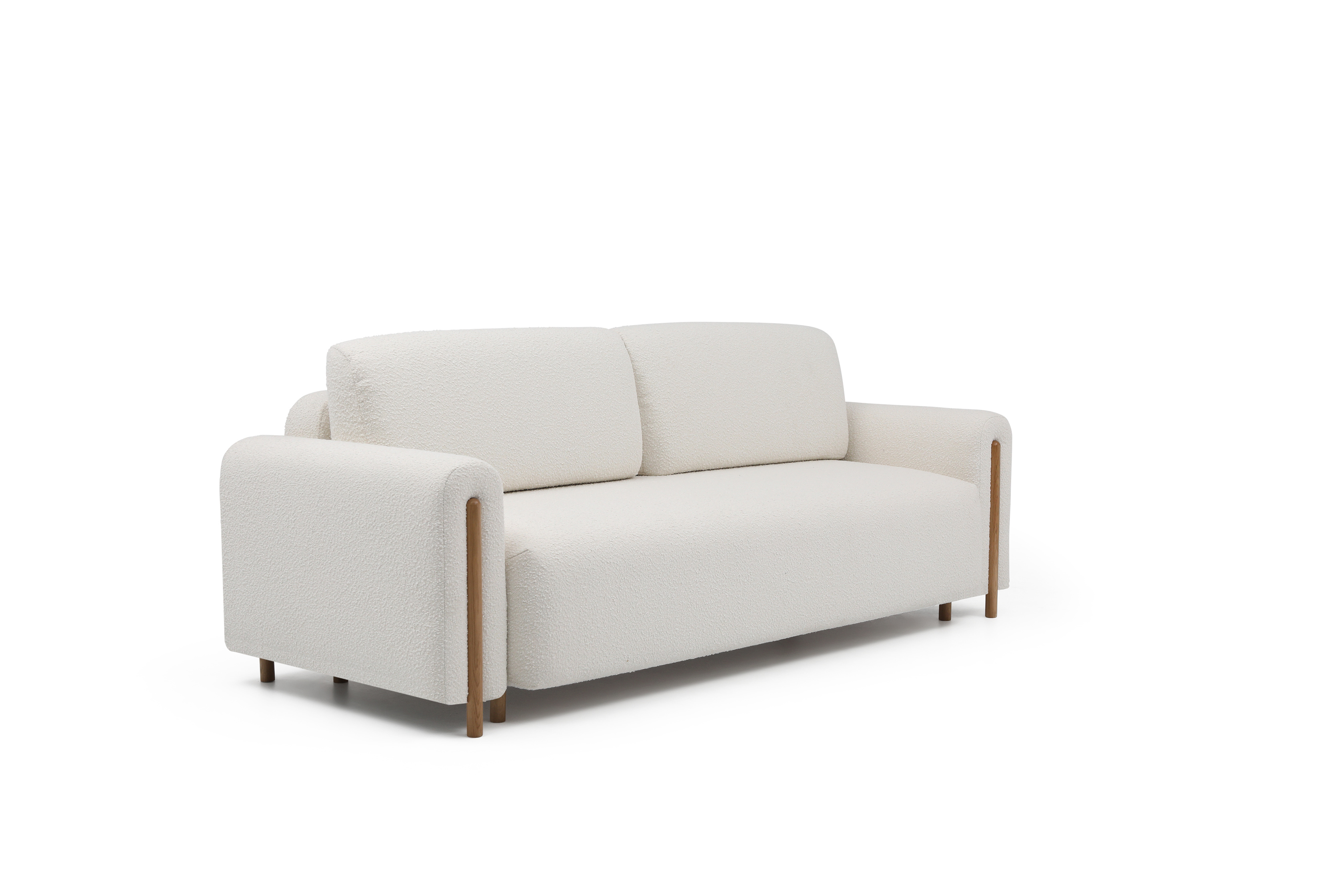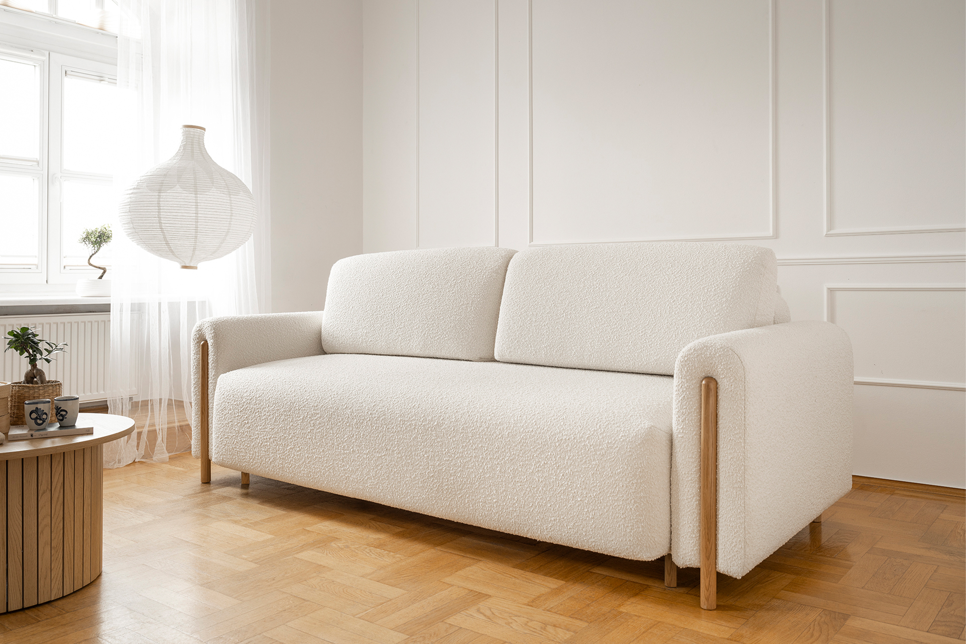 Pohovka Arcadova II v provedení boucle tkanině v dezénu Jaffray 01 - látka příjemná na dotek, vyrobená z nejkvalitnějších surovin z důrazem na detail. Kostru pohovky tvoří masivní dřevo a dřevotříska. Vlnité pružiny faliste, kvalitní HR pěna a pružná PUR pěna zaručí pružnost a dokonalý komfort sedací plochy, pod kterou se nachází úložný prostor. Záda jsou čalouněná, takže ji můžete umístit do prostoru. Pohovka stojí na 12 cm vysokých dřevěných nožkách. Díky rozkládací funkci vznikne spací plocha 146X200 cm na příležitosné spaní. Pohovku zdobí dřevěné prvky v provedení dub.