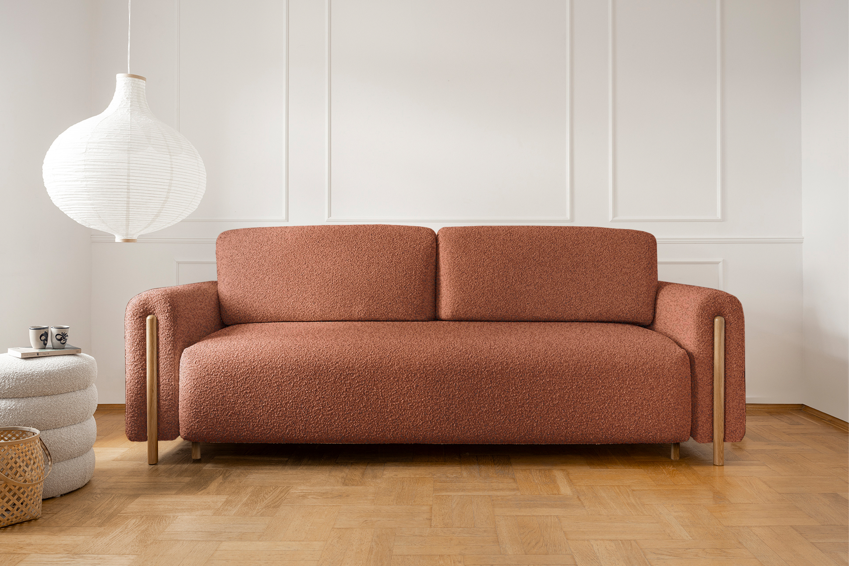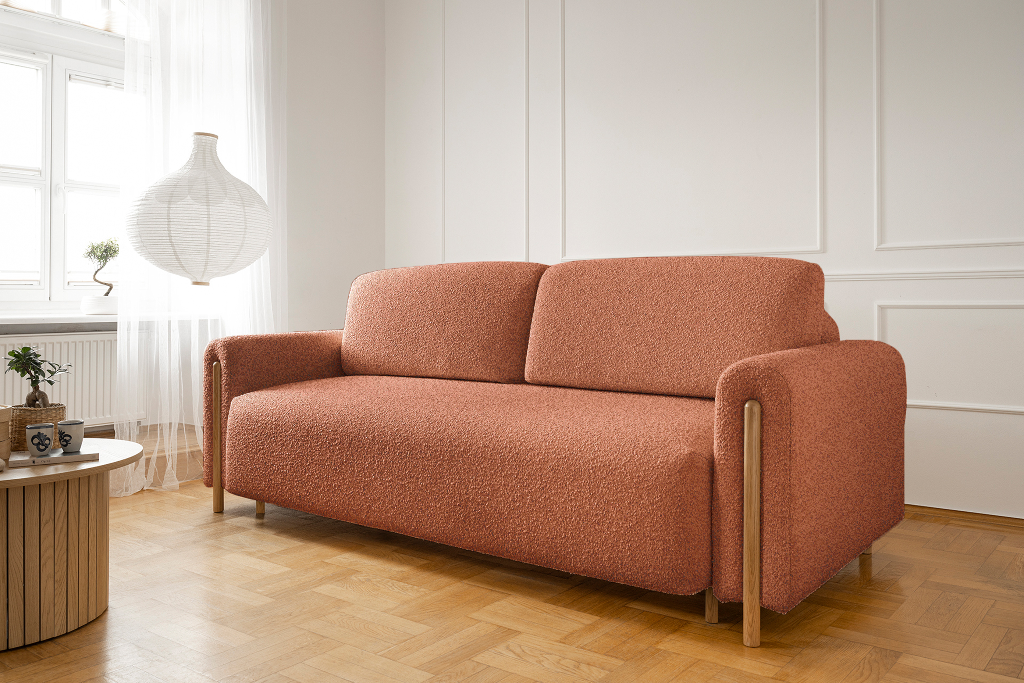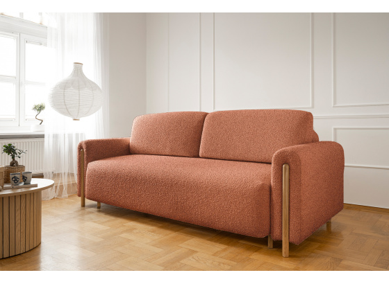 Pohovka Arcadova II v provedení boucle tkanině v dezénu Jaffray 30 - látka příjemná na dotek, vyrobená z nejkvalitnějších surovin z důrazem na detail. Kostru pohovky tvoří masivní dřevo a dřevotříska. Vlnité pružiny faliste, kvalitní HR pěna a pružná PUR pěna zaručí pružnost a dokonalý komfort sedací plochy, pod kterou se nachází úložný prostor. Záda jsou čalouněná, takže ji můžete umístit do prostoru. Pohovka stojí na 12 cm vysokých dřevěných nožkách. Díky rozkládací funkci vznikne spací plocha 146X200 cm na příležitosné spaní. Pohovku zdobí dřevěné prvky v provedení dub.