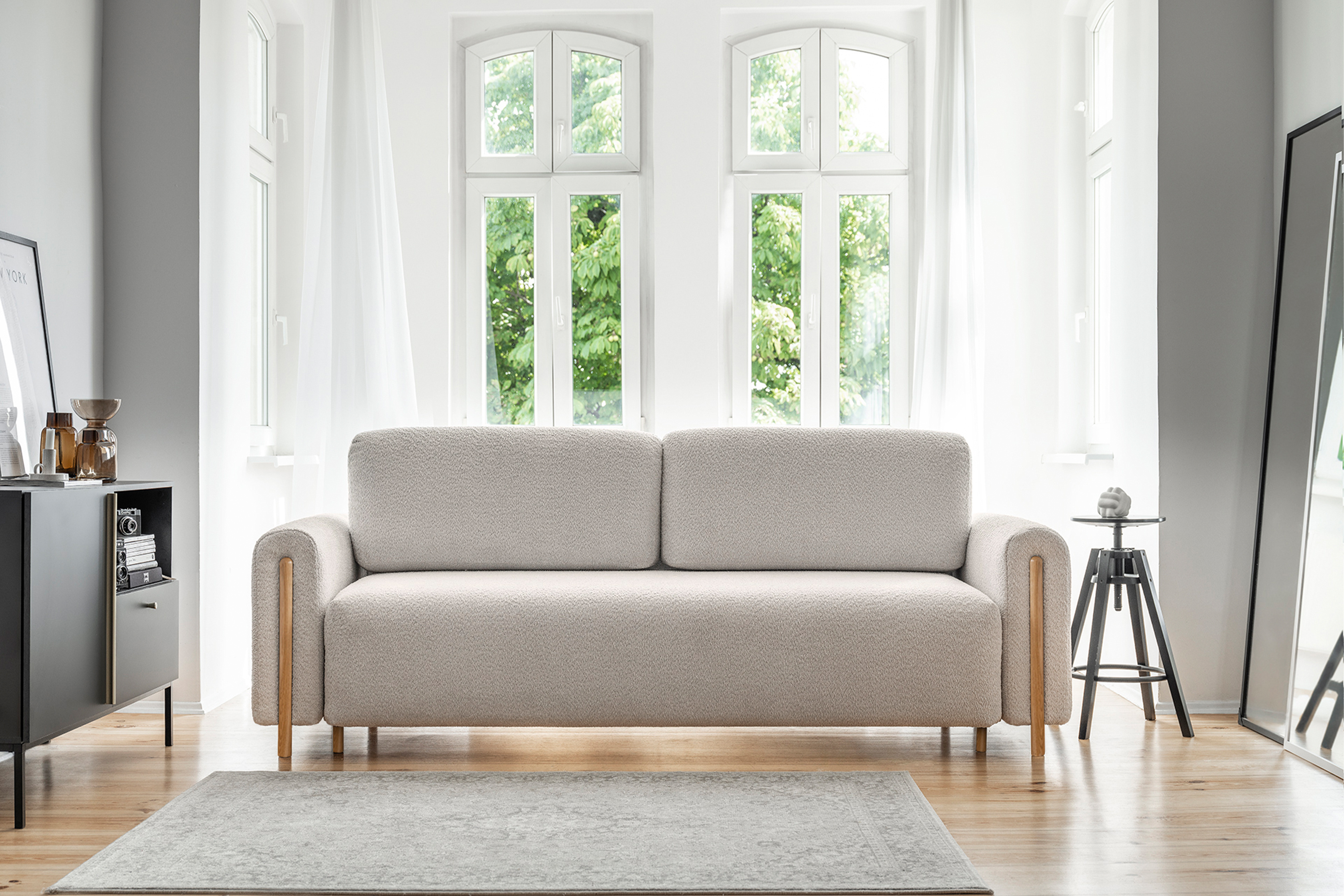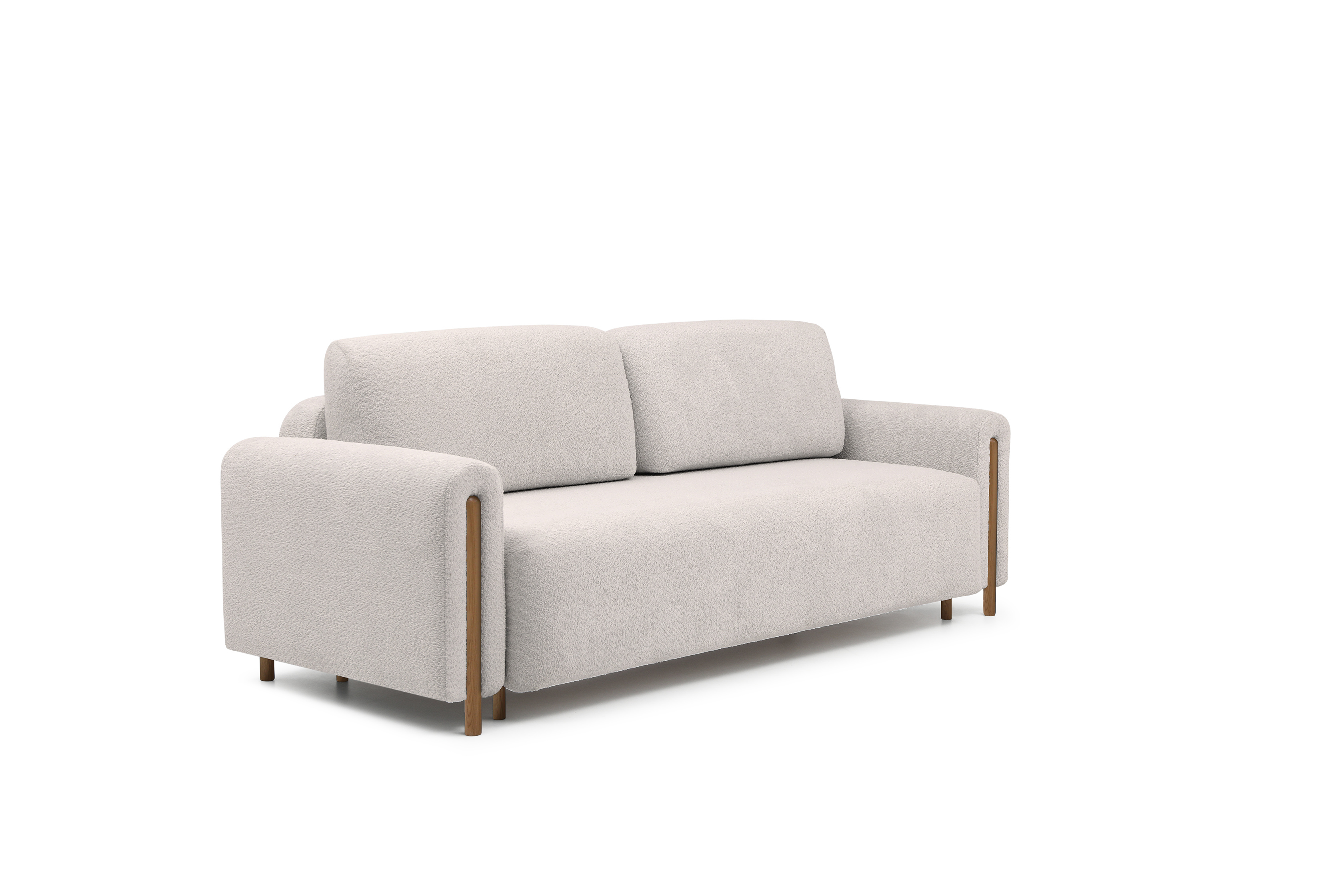 Pohovka Arcadova II v provedení boucle tkanině v dezénu Royal 18 - látka příjemná na dotek, vyrobená z nejkvalitnějších surovin z důrazem na detail. Kostru pohovky tvoří masivní dřevo a dřevotříska. Vlnité pružiny faliste, kvalitní HR pěna a pružná PUR pěna zaručí pružnost a dokonalý komfort sedací plochy, pod kterou se nachází úložný prostor. Záda jsou čalouněná, takže ji můžete umístit do prostoru. Pohovka stojí na 12 cm vysokých dřevěných nožkách. Díky rozkládací funkci vznikne spací plocha 146X200 cm na příležitosné spaní. Pohovku zdobí dřevěné prvky v provedení dub.