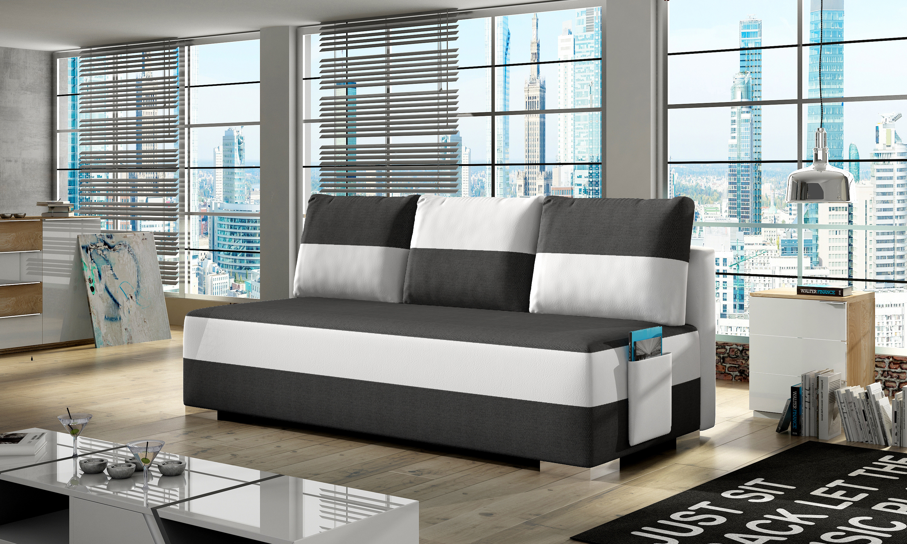 Pohovka Atila v provedené látka Malmo 96/ eko kůže Soft 17 má sedáky vyplněné pružinami Bonnell a pěnou T25. Rozkladem vznikne spací plocha 200x140 cm. Prostorný úložný prostor a bočnmí kapsa , umístěná na jedné straně pohovky. Čalouněné je příjemné na dotek a odolné vůči skvrnám.