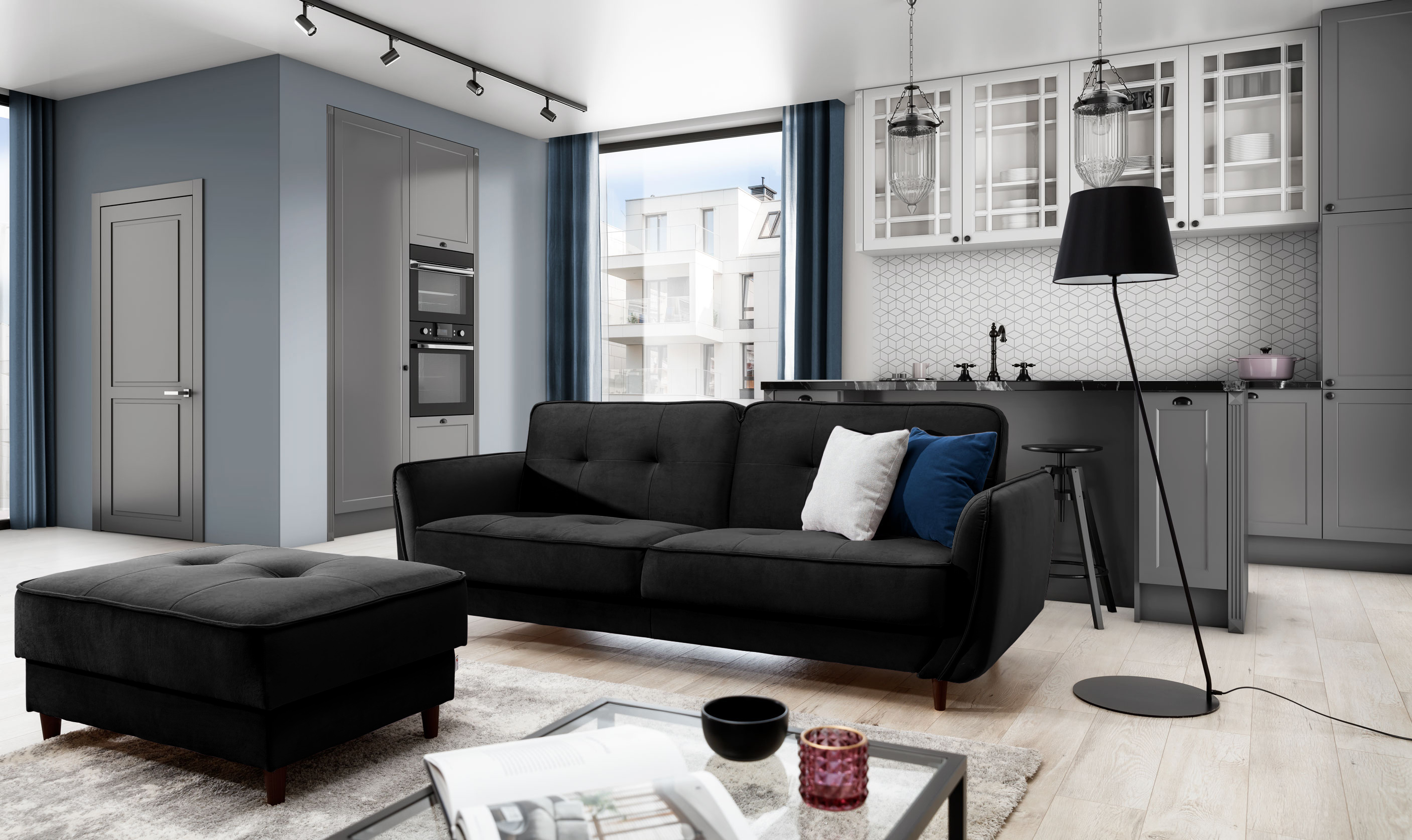 Rozkládací pohovka Bellis v dezénu Loco 10 s výplní sedáku tvořenou HR pěnou a taštičkovými pružinami. Potahová látka Loco: látka příjemná na dotek, připomíná samet, nevybledne, stínový vzhled, mírný lesk. Ozdobné vyšívání sedáků a opěrek. Pomocí rozkladu clik-clak vznikne lehací plocha 110x190 cm. Pod sedákem se nachází úložný prostor. Pohovka má dřevěné nožky o výšce 11 cm. K pohovce nabízíme taburet Bellis.