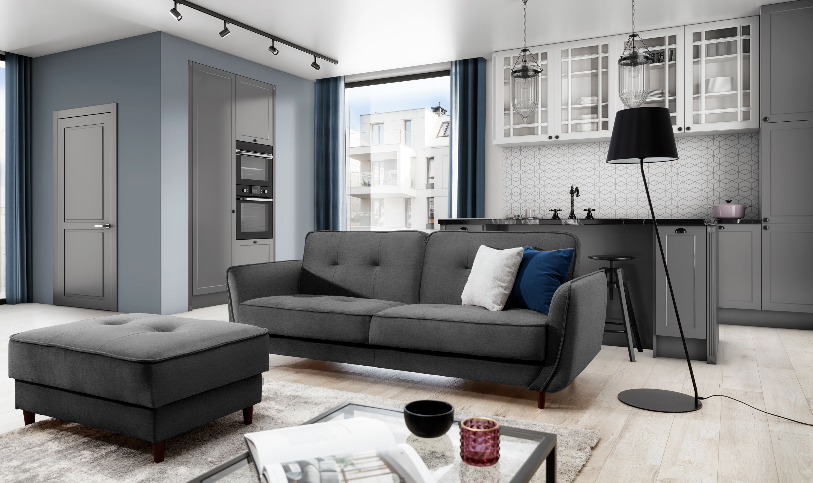 Rozkládací pohovka Bellis v dezénu Monolith 97 s výplní sedáku tvořenou HR pěnou a taštičkovými pružinami. Potahová látka Monolith: příjemná látka s vysokou odolností, voděodolná, odolná proti vyblednutí a žmolkování, látka po přejetí rukou stínuje. Ozdobné vyšívání sedáků a opěrek. Pomocí rozkladu clik-clak vznikne lehací plocha 110x190 cm. Pod sedákem se nachází úložný prostor. Pohovka má dřevěné nožky o výšce 11 cm. Taburet není součástí.