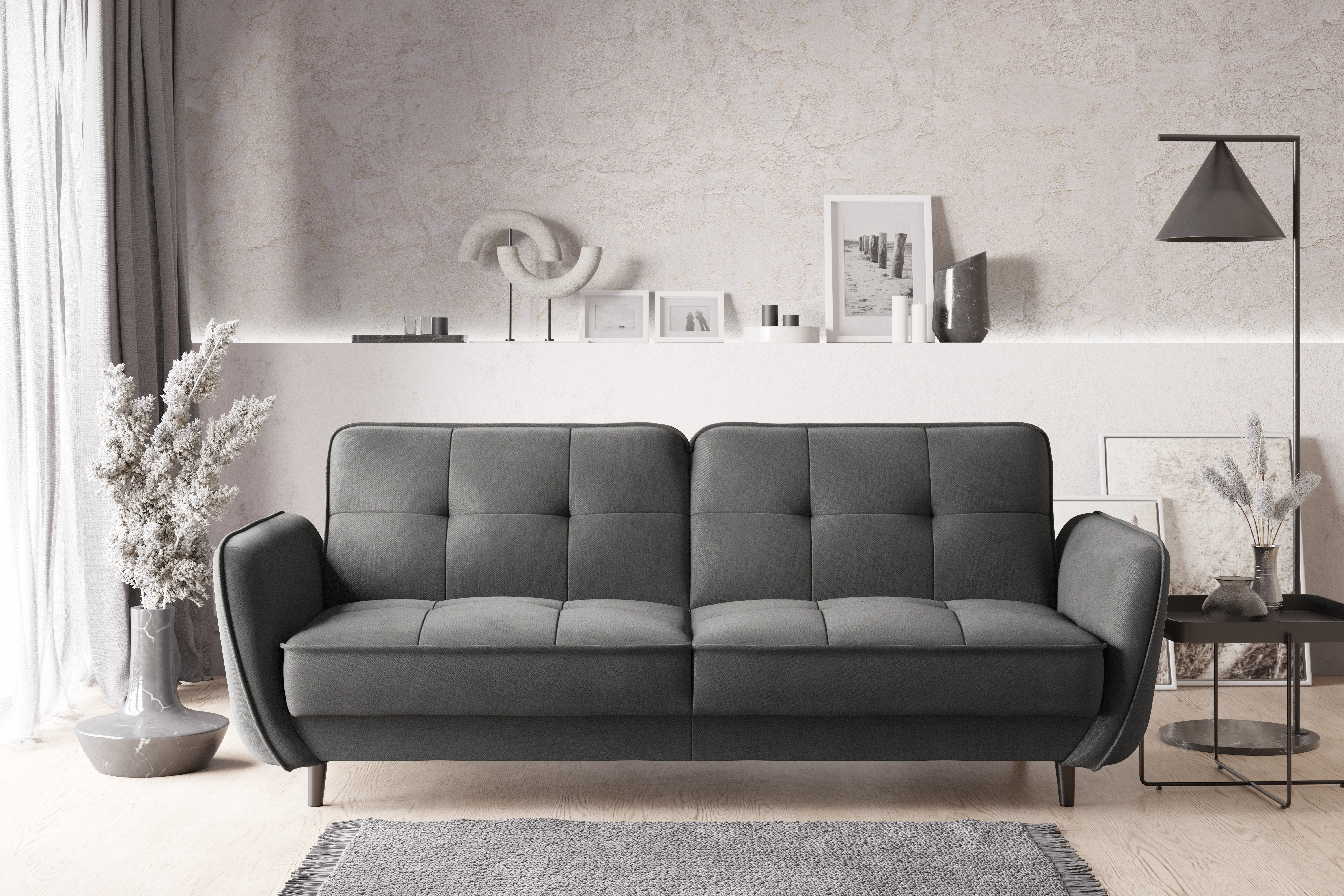 Rozkládací pohovka Bellis v dezénu Sola 6 s výplní sedáku tvořenou HR pěnou a taštičkovými pružinami. Potahová látka Sola: lesklý vzhled a jemná vazba, pevná a odolná proti oděru, nebledne bez stínového efektu po přejetí rukou. Ozdobné vyšívání sedáků a opěrek. Pomocí rozkladu clik-clak vznikne lehací plocha 110x190 cm. Pod sedákem se nachází úložný prostor. Pohovka má dřevěné nožky o výšce 11 cm. K pohovce nabízíme taburet Bellis.