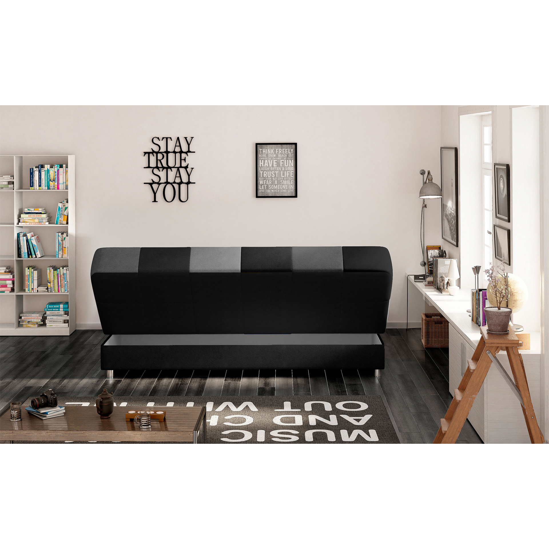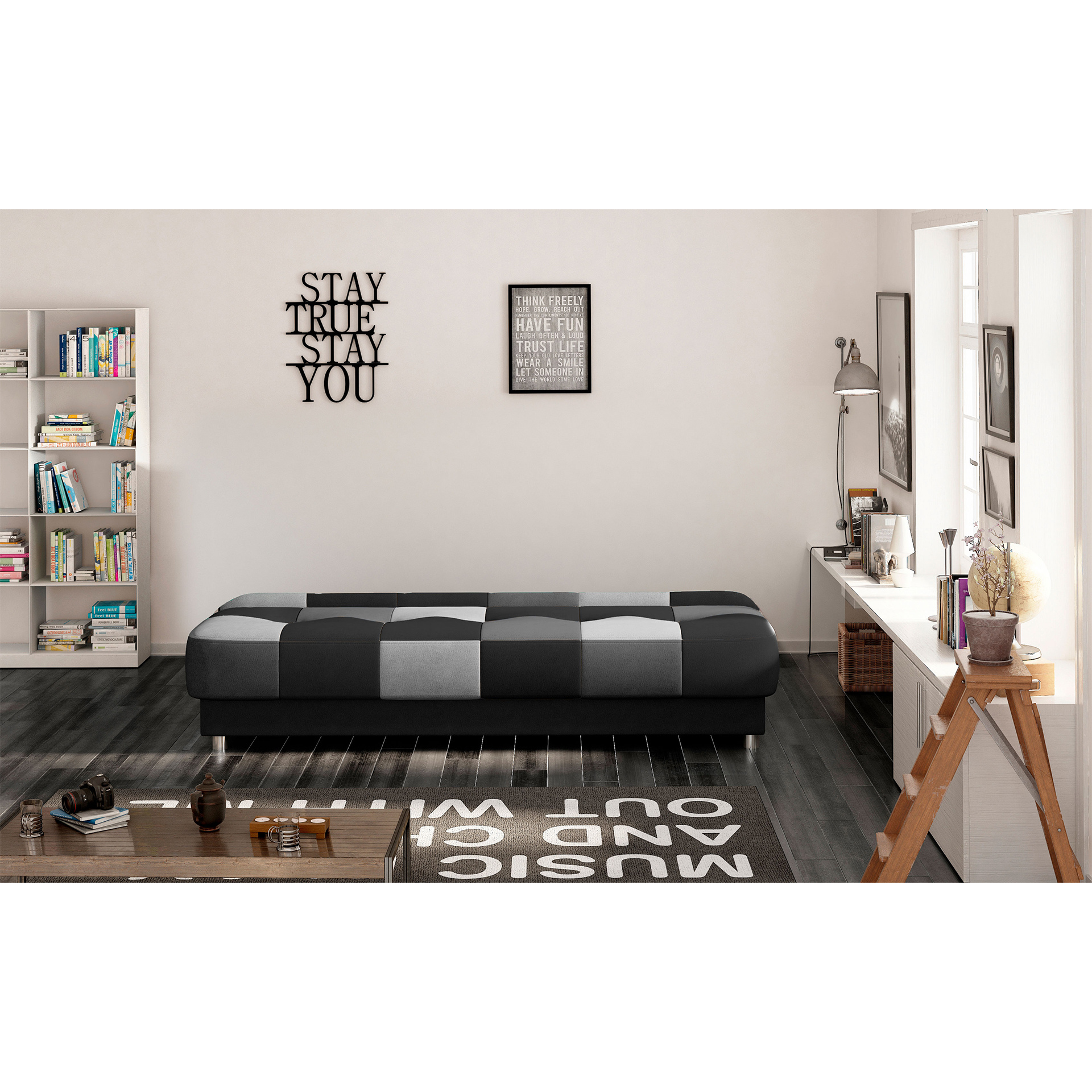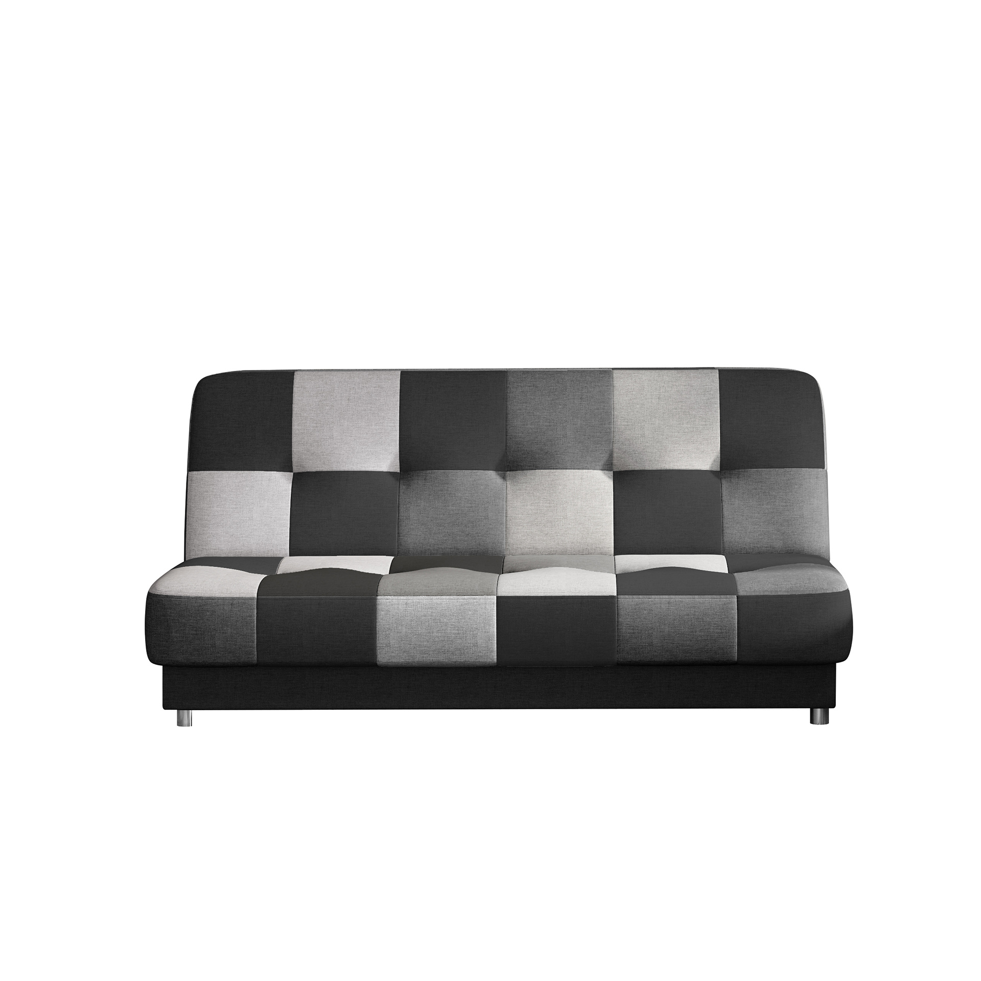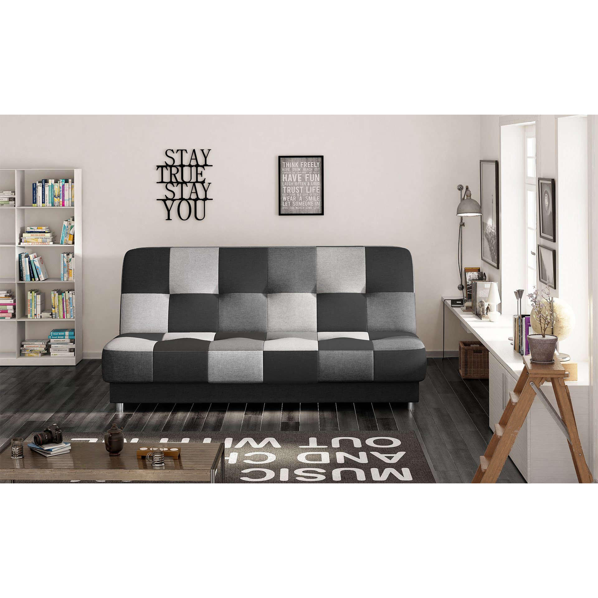 Rozkládací pohovka Cayo v barevném provedení Sawana 14/ Sawana 05/ Sawana 21 (černá/ šedá/ světle šedá) je vyrobena z vysoce kvalitních materiálů. Disponuje 58 cm hlubokým sedákem. Díky mechanismu click-clack vznikne rychle postel s plochou na spaní o rozměru 117x192 cm. Samozřejmostí je úložný prostor. Nohy pohovky jsou kovové.