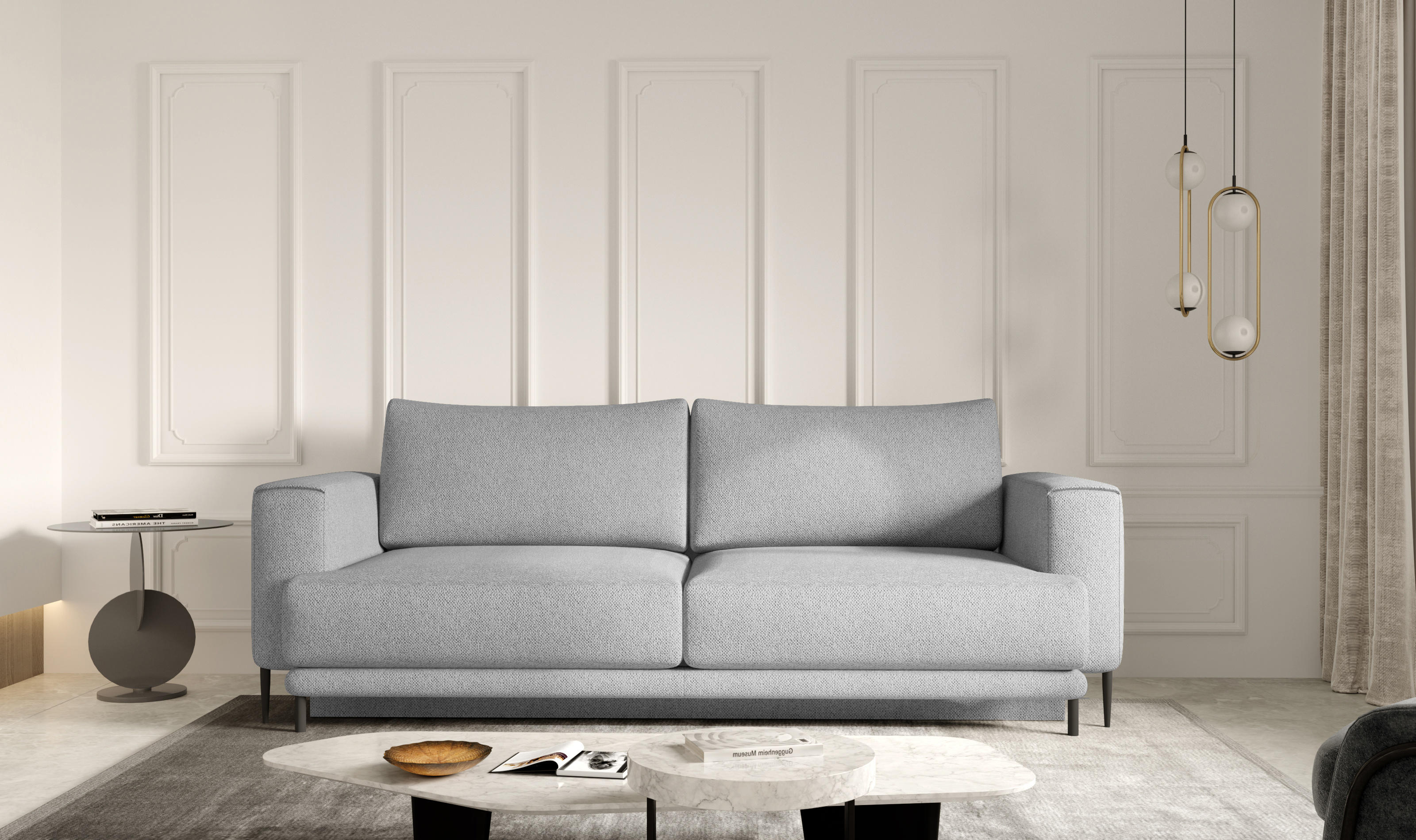 Pohovka Dalia v provedení Borneo 04 - jemně tkaná a na dotek příjemná látka, vysoká odolnost vůči světlu, voděodolná. Pohovka má sedáky a opěradla vyplněná pěnou HR a T25, které jsou odolné proti všem druhům nevzhledných promáčklin a dutin. Rozkladem vznikne spací plocha 145x215 cm. Samozřejmostí je úložný prostor. Pohovka stojí na čtyřech černých, kuželovitých kovových nohách.