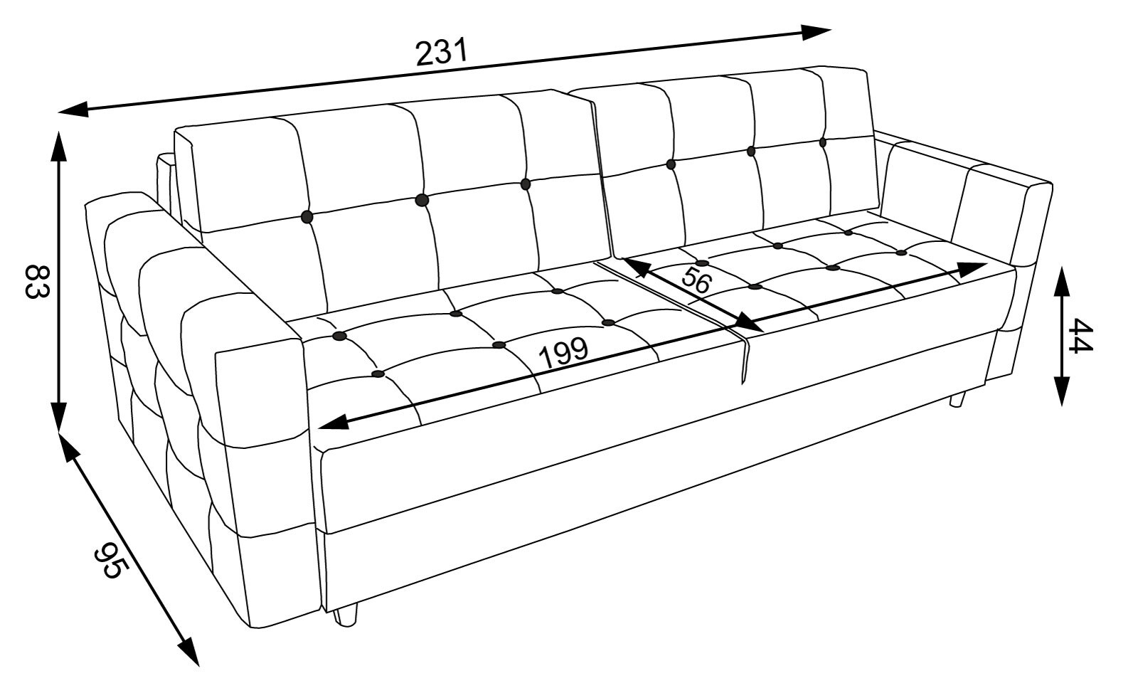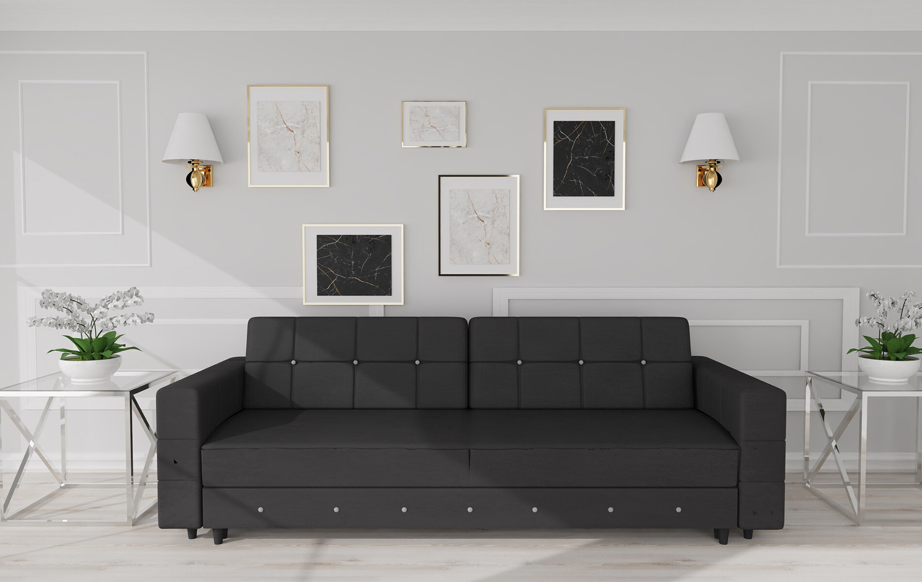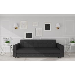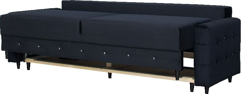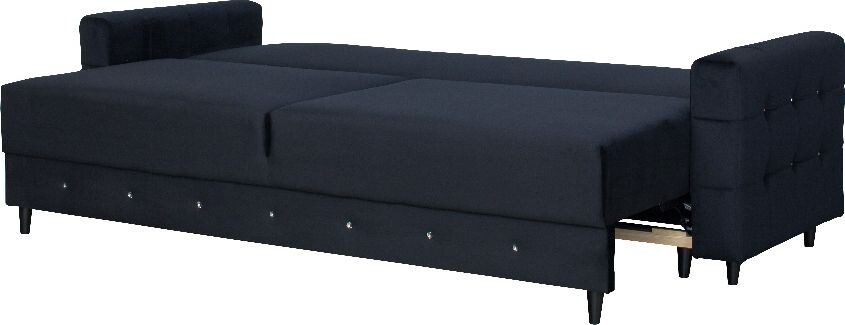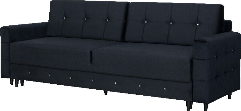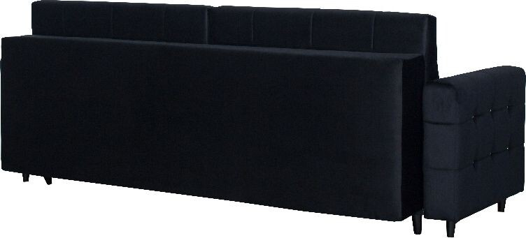 Čalouněná prošívaná pohovka Diamentino v barevném provedení černý plyš. Sedák křesla je vyplněn HR pěnou a vroubkovanými pružinami, opěradlo HR pěna a elastické popruhy. Pohovka stojí na černých dřevěných nožkách. Rozkladem vznikne spací plocha 137x200 cm. Pohovka disponuje úložným prostorem. Zboží dodáváme v demontu.