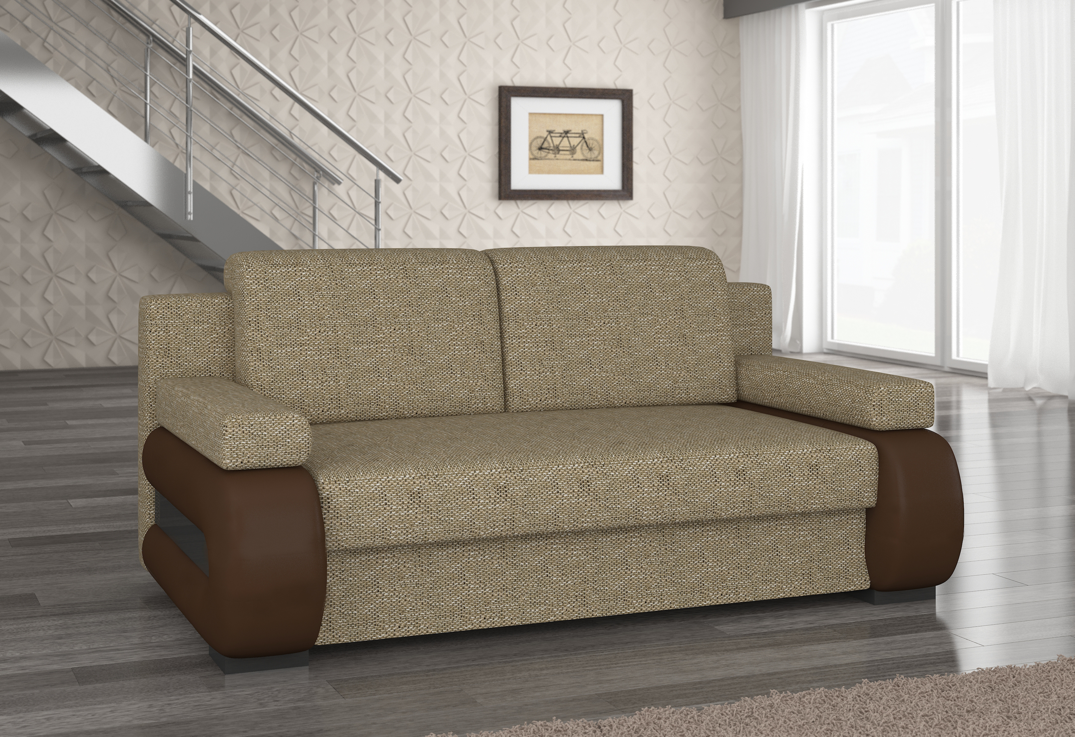 Pohovka Laura v barevném provedení látka Berlín 03 a eko kůže Soft 15. Sedák pohovky využívá kombinaci pružin Bonnell a pěny T25. Díky tomu je měkký, ale stále podporuje páteř. Po rozložení vznikne spací plocha 140x200 cm. Další výhodou je hluboký zásobník na ložní prádlo uvnitř spodního boxu.