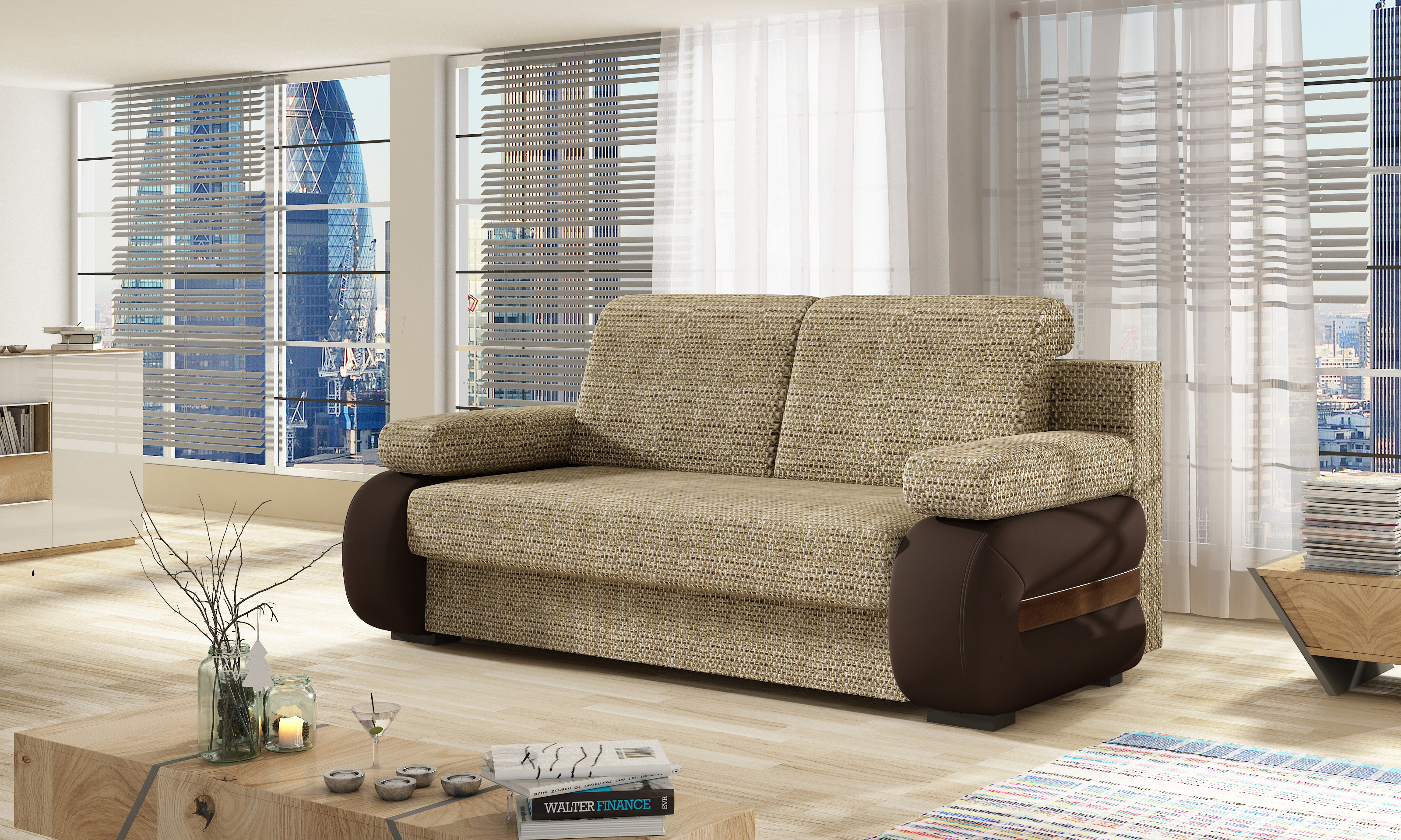 Pohovka Laura v barevném provedení látka Berlín 03 a eko kůže Soft 66. Sedák pohovky využívá kombinaci pružin Bonnell a pěny T25. Díky tomu je měkký, ale stále podporuje páteř. Po rozložení vznikne spací plocha 140x200 cm. Další výhodou je hluboký zásobník na ložní prádlo uvnitř spodního boxu.