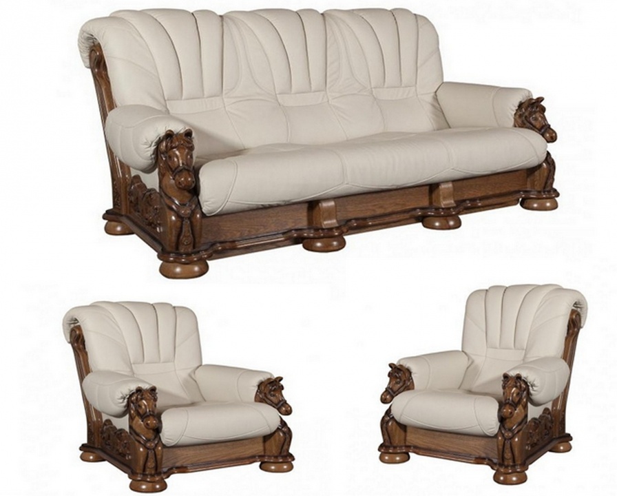 Rustikální luxusní pohovka je vyrobena z pravé hovězí kůže. Kostra je vyrobena z dubového masivu. Tato pohovka zaujme hlavně milovníky koní. Její dubová konstrukce je vyřezávaná, přední nohy jsou v podobě koňské hlavy, což zaručuje její originalitu. Výplň sedáků je vysoce kvalitní polyuretanová pěna s pružinou bonel. Pohovka je rozkládací pro příležitostní spaní, spací plocha 140x190 cm. Možnost výběru barvy kůže, dřeva i složení sedací soupravy MUSTANG. Vámi zvolenou variantu barvy kůže i dřeva (dle přiloženého vzorníku ve fotkách) uveďte do objednávky.