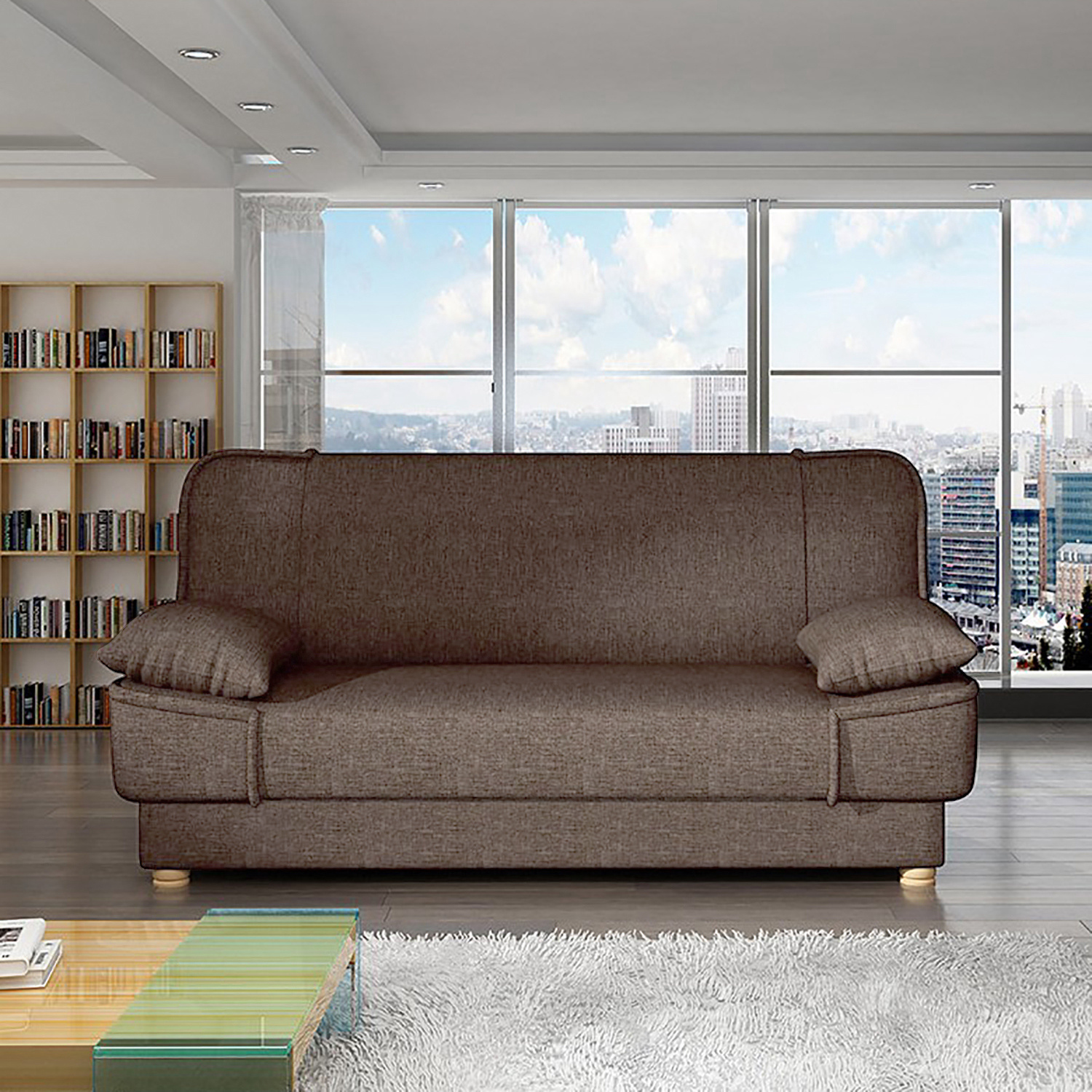 Pohovka má jádro z vlnité pružiny s textilním potahem v barevném provedení hnědá. Pohovka je rozkládací (KLIK-KLAK) s úložným prostorem. Výška sedu 40 cm, hloubka sedu 55 cm, rozměr rozložené 190×120 cm.