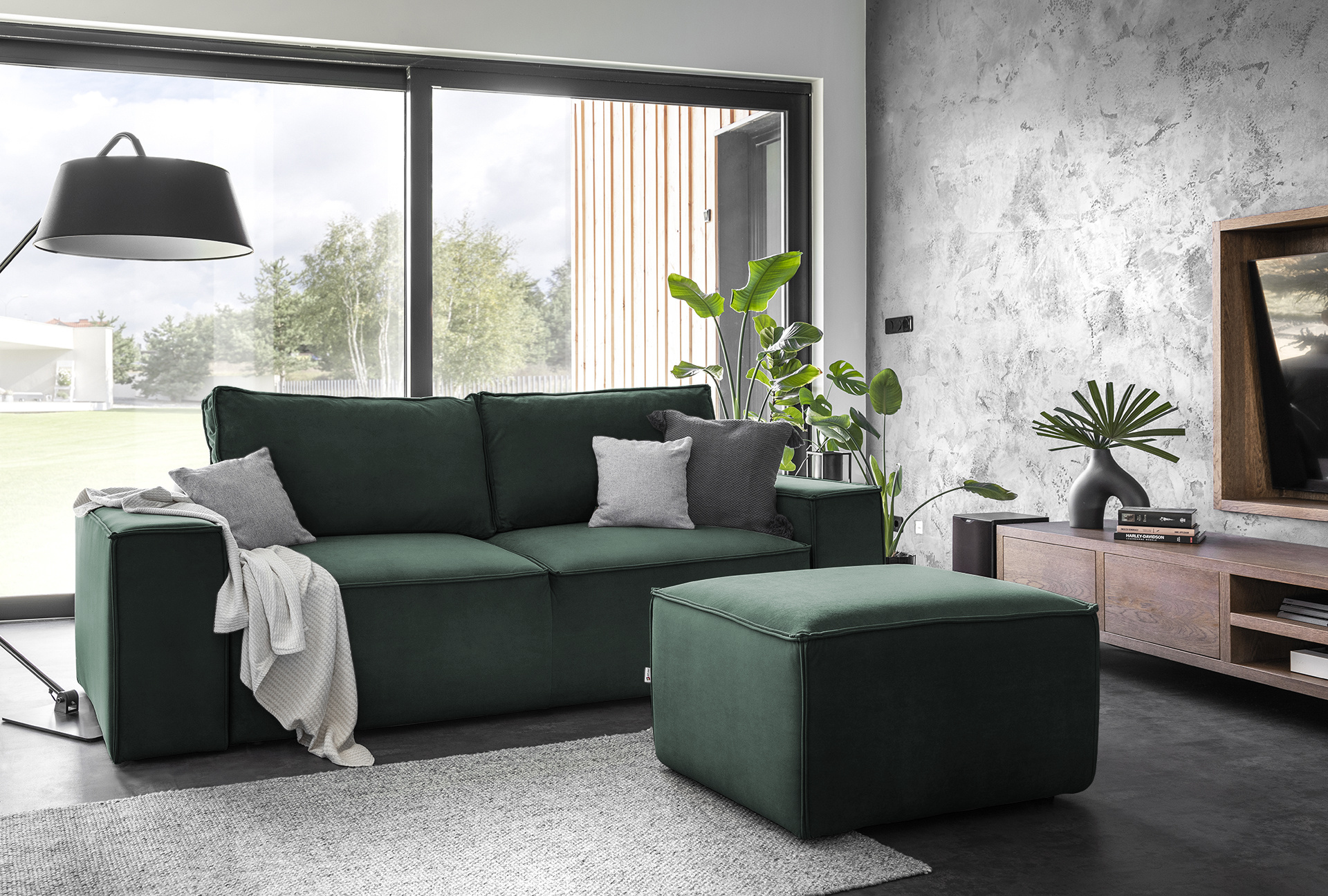 Pohovka Silla v provedení Loco 35 - látka příjemná na dotek, připomíná samet, nevybledne, stínový vzhled, mírný lesk. Pohovka má sedáky vyplněné HR pěnou a zádové polštáře pěnou T25. Rozkladem vznikne ložná plocha 200x145 cm. K pohovce je možno dokoupit taburet Silla.