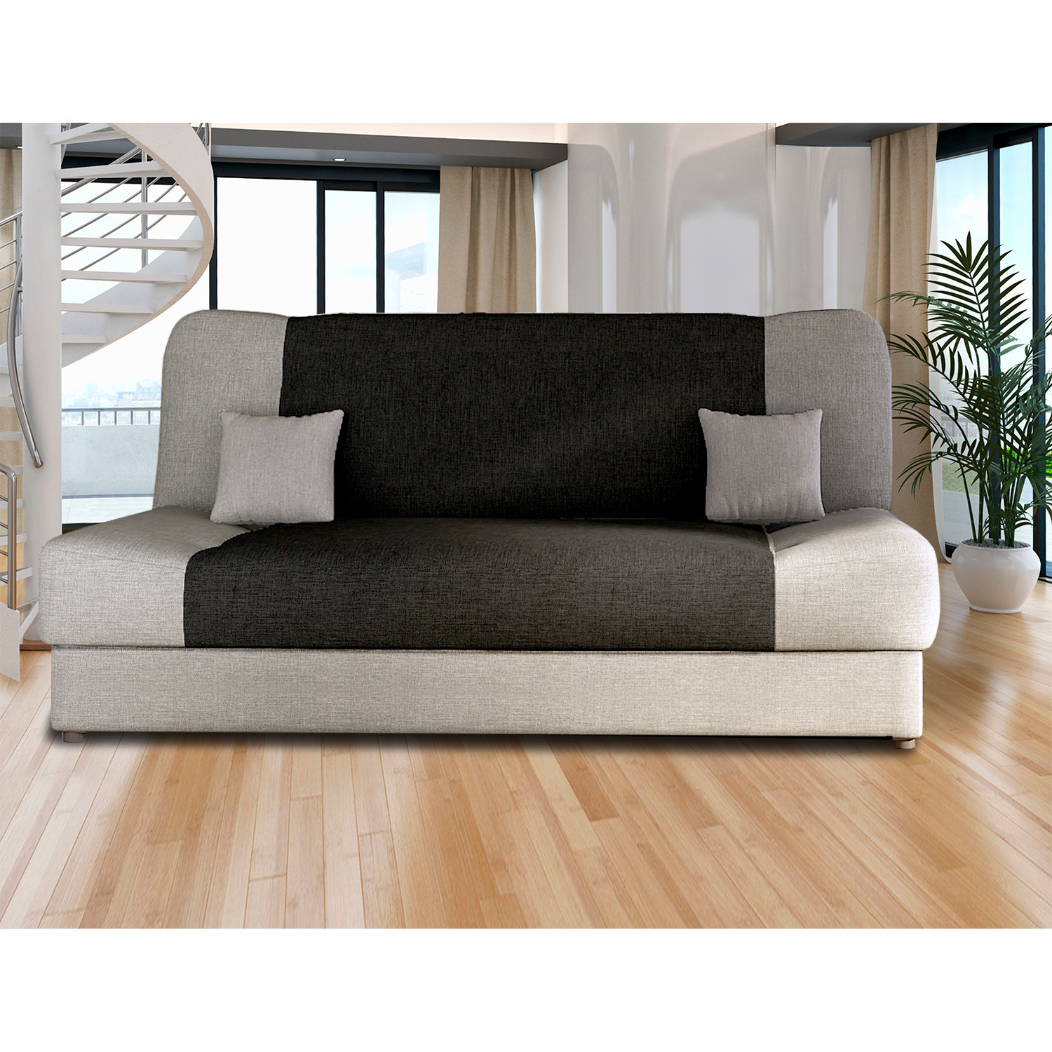 Tato rozkládací pohovka s úložným prostorem má textilní potah v barevném provedení šedá / černá. Pohovka má jádro z vlnité pružiny. Výška sedu je 40 cm, hloubka sedu 55 cm. Rozměr rozložené pohovky je 190 × 120 cm. Způsob rozkládání KLIK-KLAK (postup uveden v návodu k montáži). Po složení do polohy k sedu upravte krycí látku v zadní části tak, aby zakryla rozkládací mechanizmus. Zboží dodáváme v demontu.