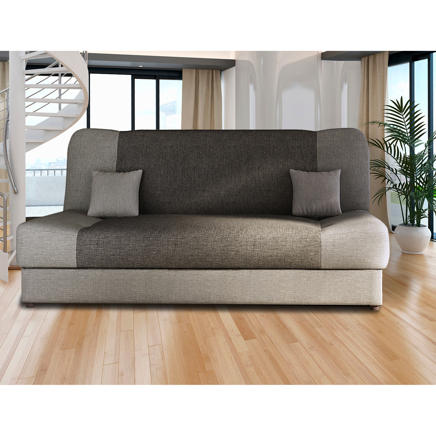 Tato rozkládací pohovka s úložným prostorem má textilní potah v barevném provedení světle šedá / šedá. Pohovka má jádro z vlnité pružiny. Výška sedu je 40 cm, hloubka sedu 55 cm. Rozměr rozložené pohovky je 190 × 120 cm. Způsob rozkládání KLIK-KLAK (postup uveden v návodu k montáži). Po složení do polohy k sedu upravte krycí látku v zadní části tak, aby zakryla rozkládací mechanizmus. Zboží dodáváme v demontu.